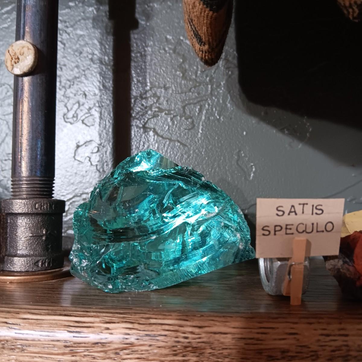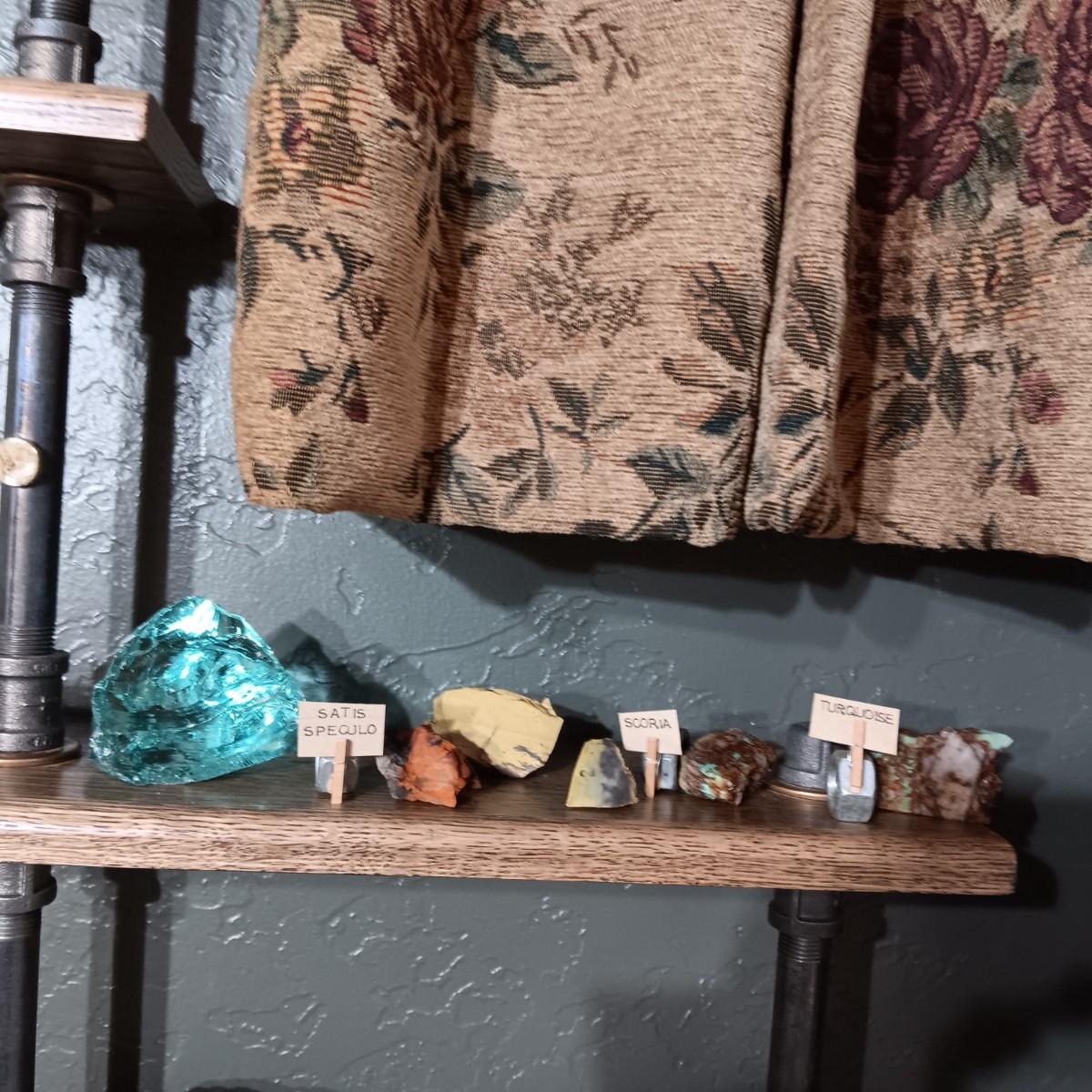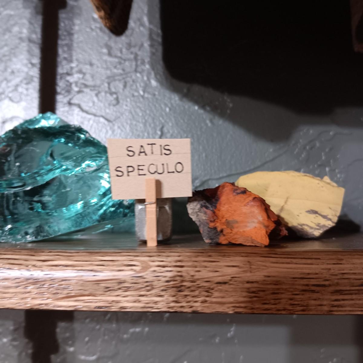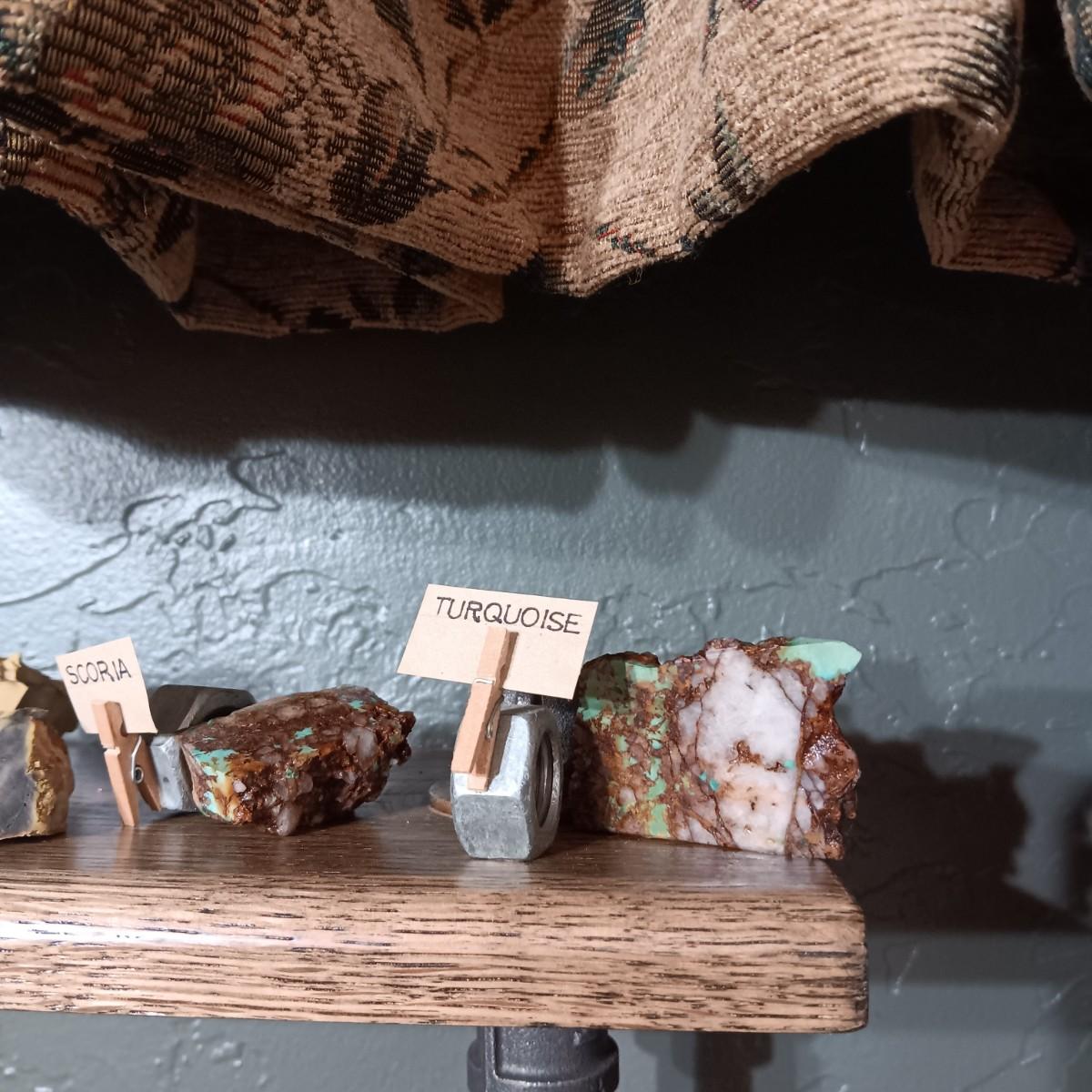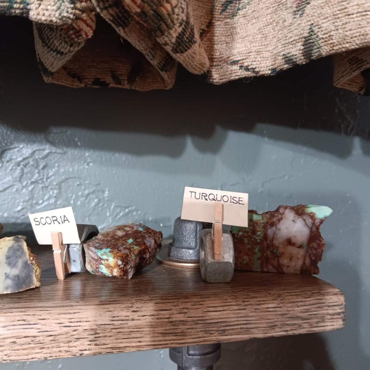 ROCKS FROM A COLLECTION LABELED SATIS SPECULO, SCORIA AND TURQUOISE