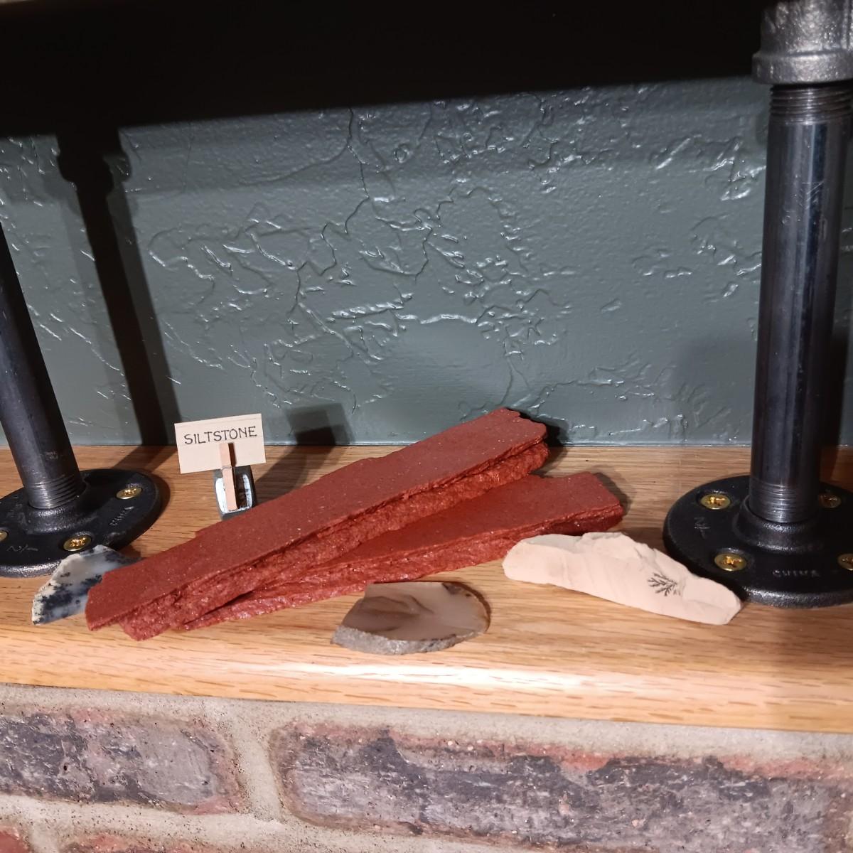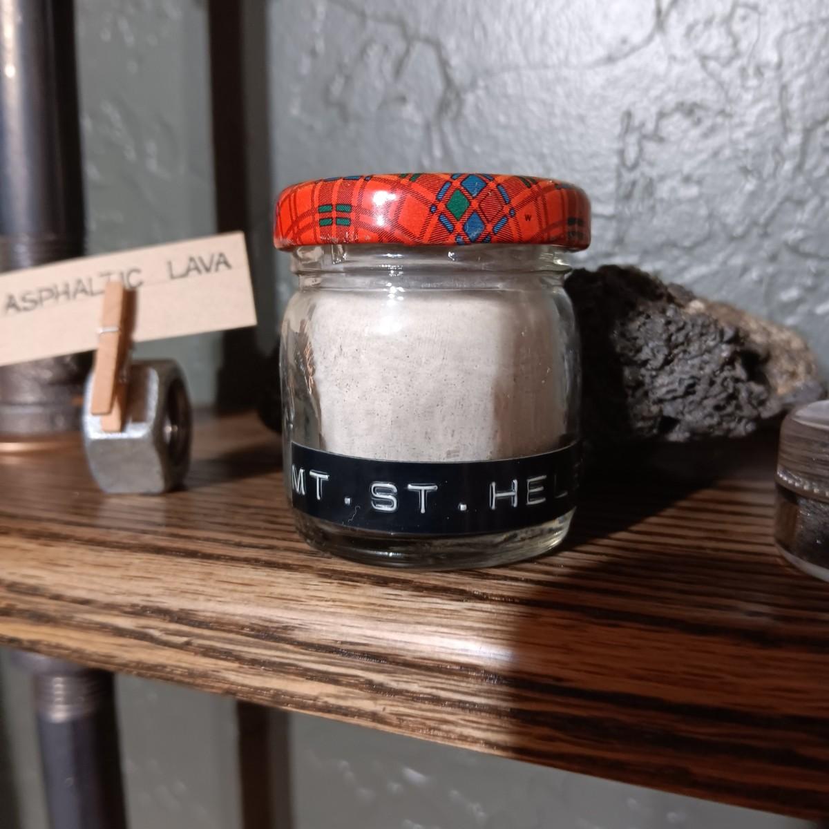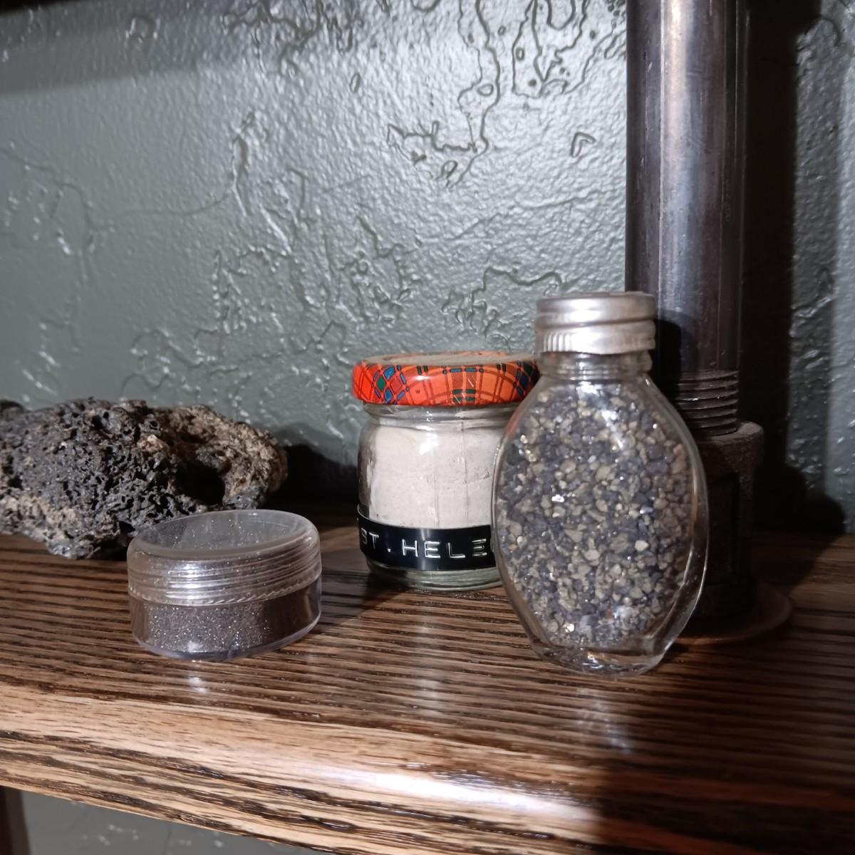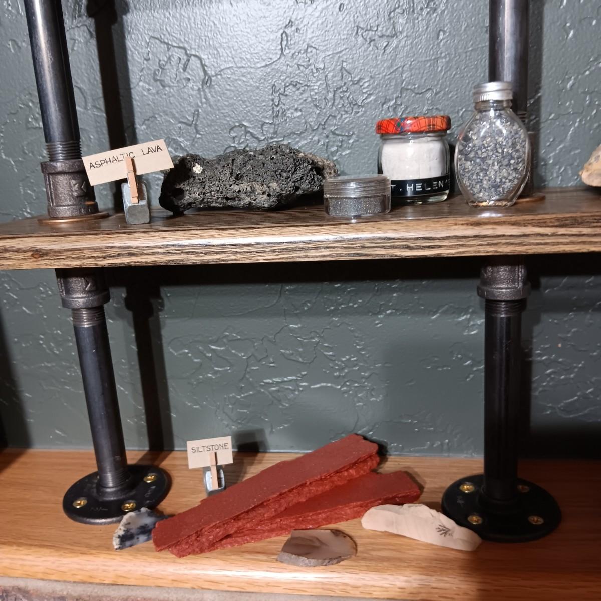 ROCKS FROM A COLLECTION LABELED ASPHALTIC LAVA, SILTSTONE, FOSSILS, MT ST HELENS ASH