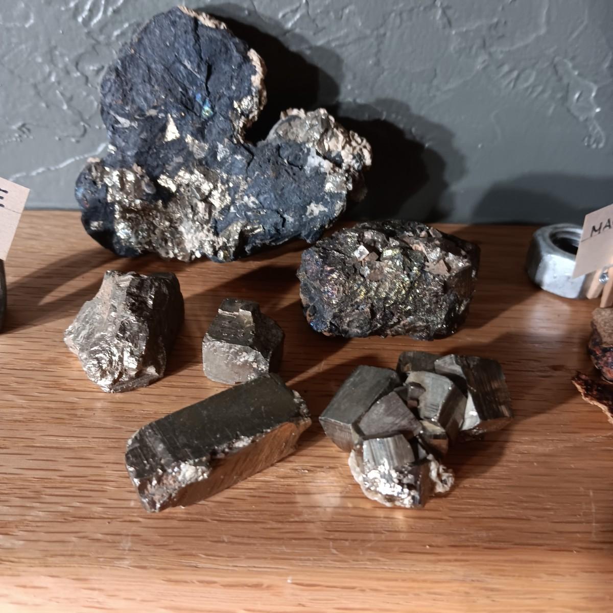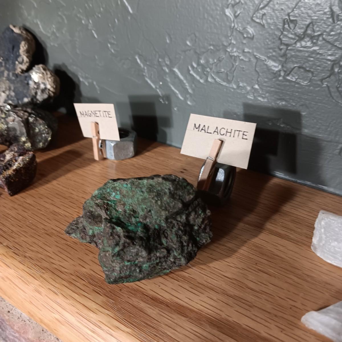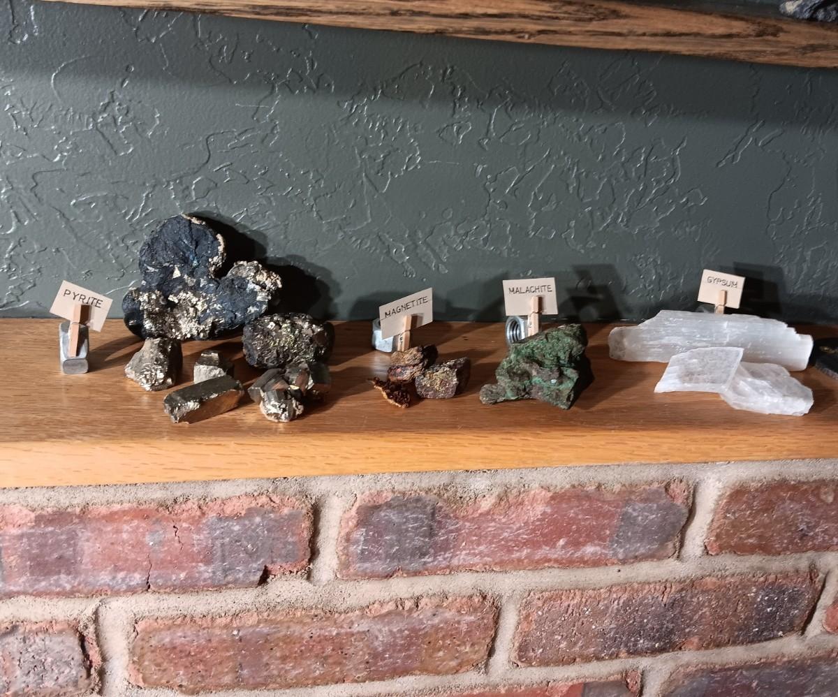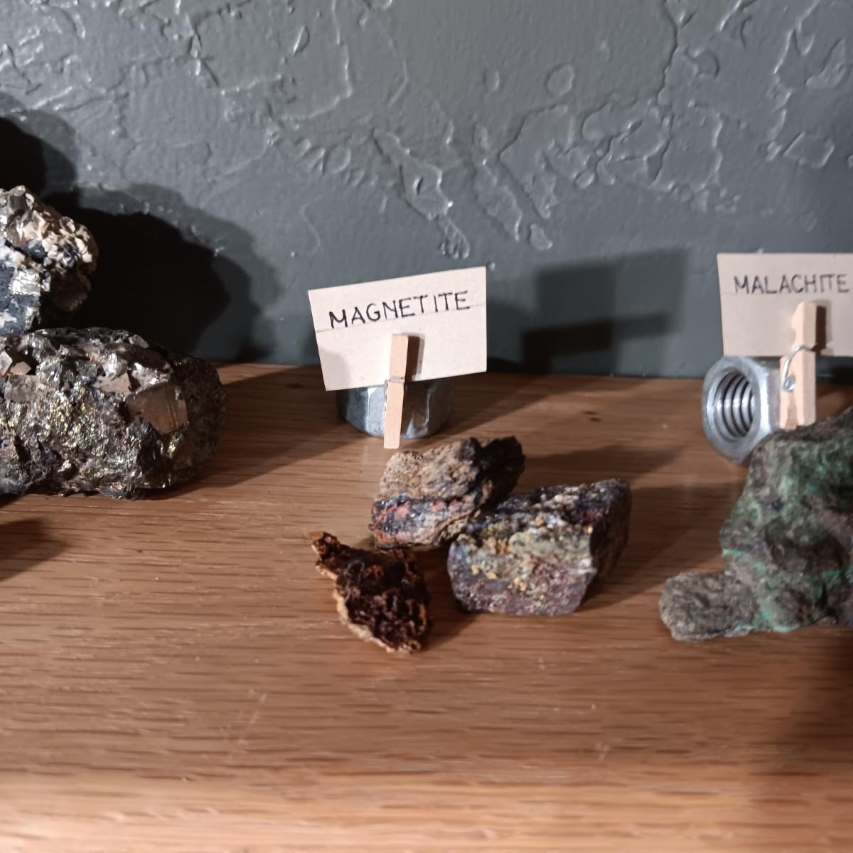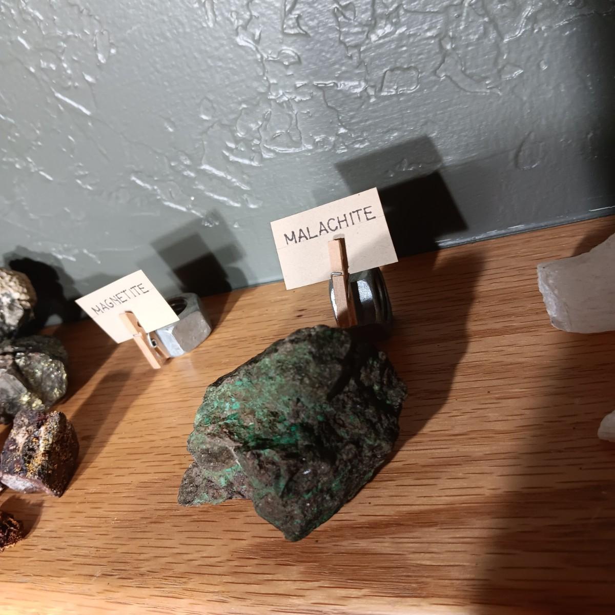 ROCKS FROM A COLLECTION LABELED GYPSUM, MALACHITE, MAGNETITE & PYRITE