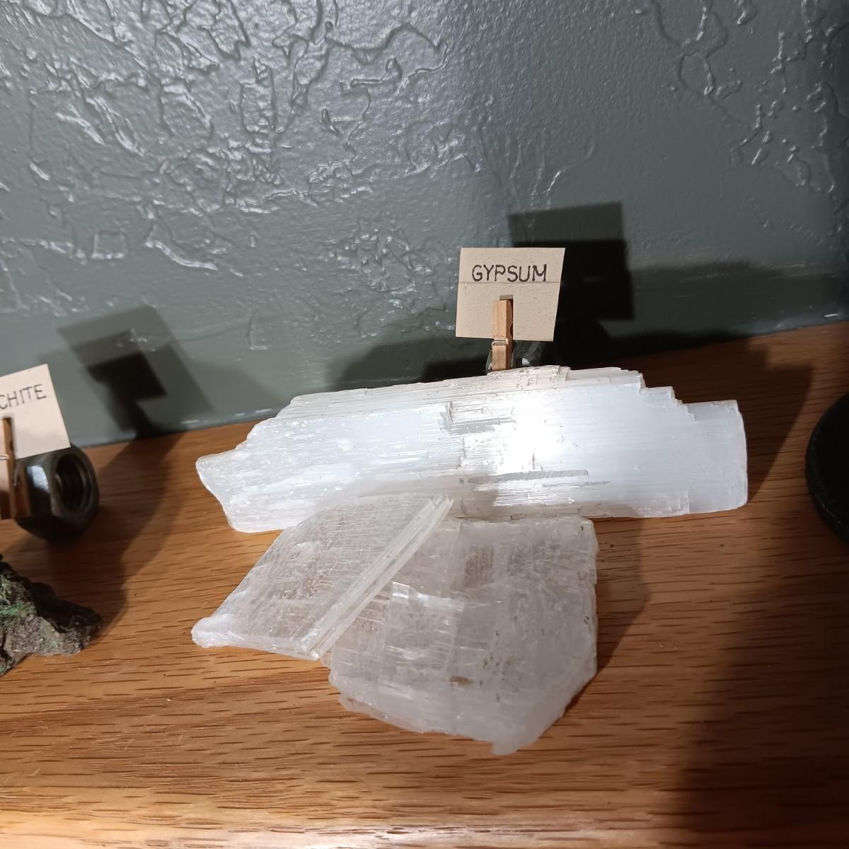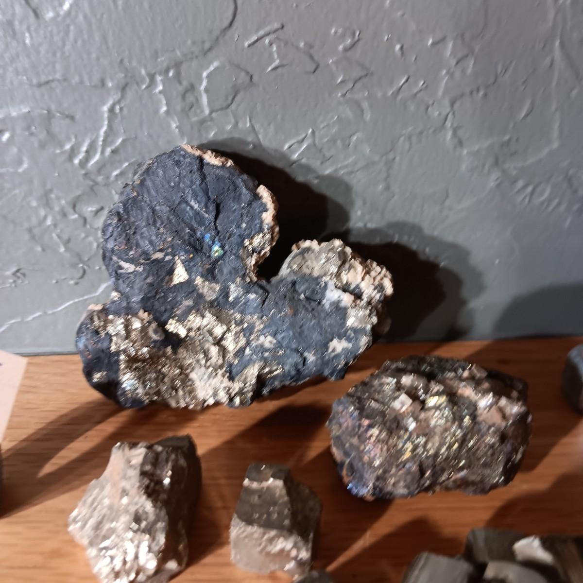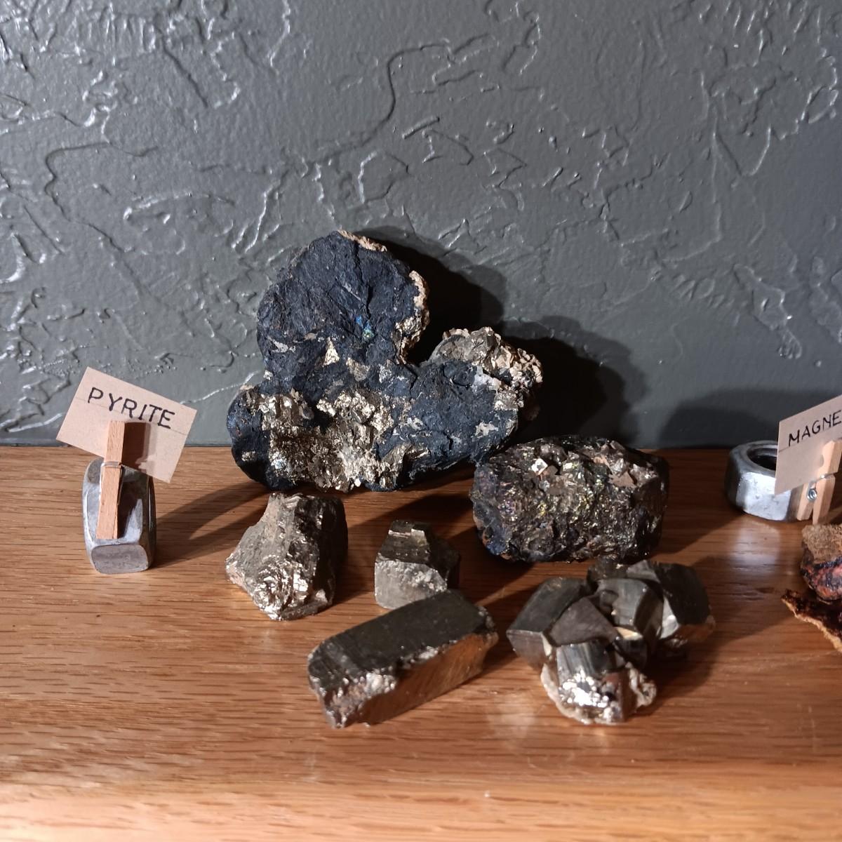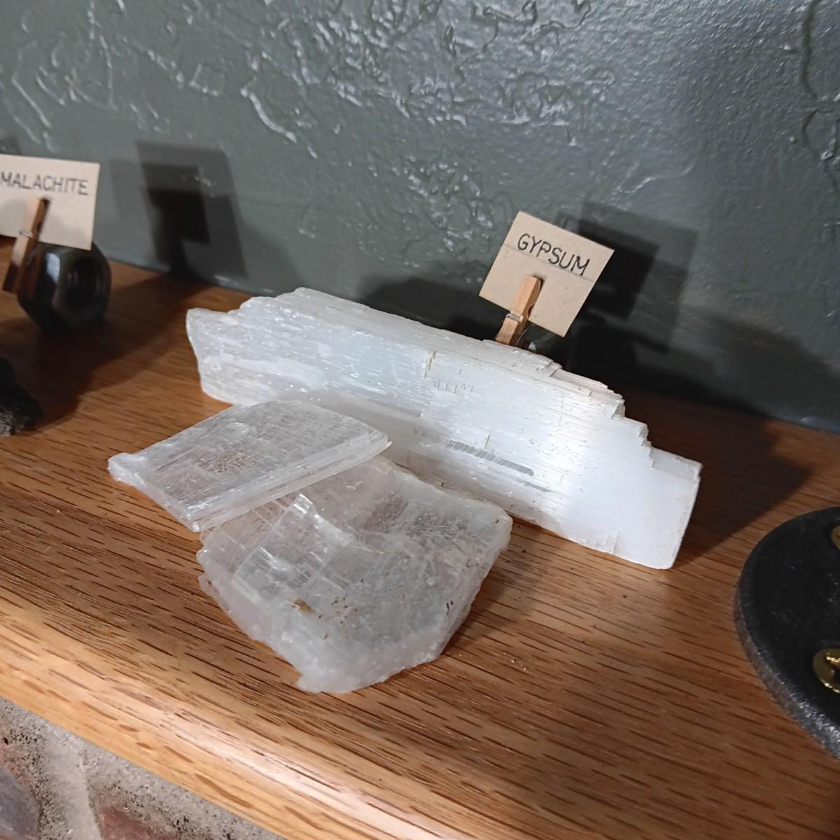 ROCKS FROM A COLLECTION LABELED GYPSUM, MALACHITE, MAGNETITE & PYRITE
