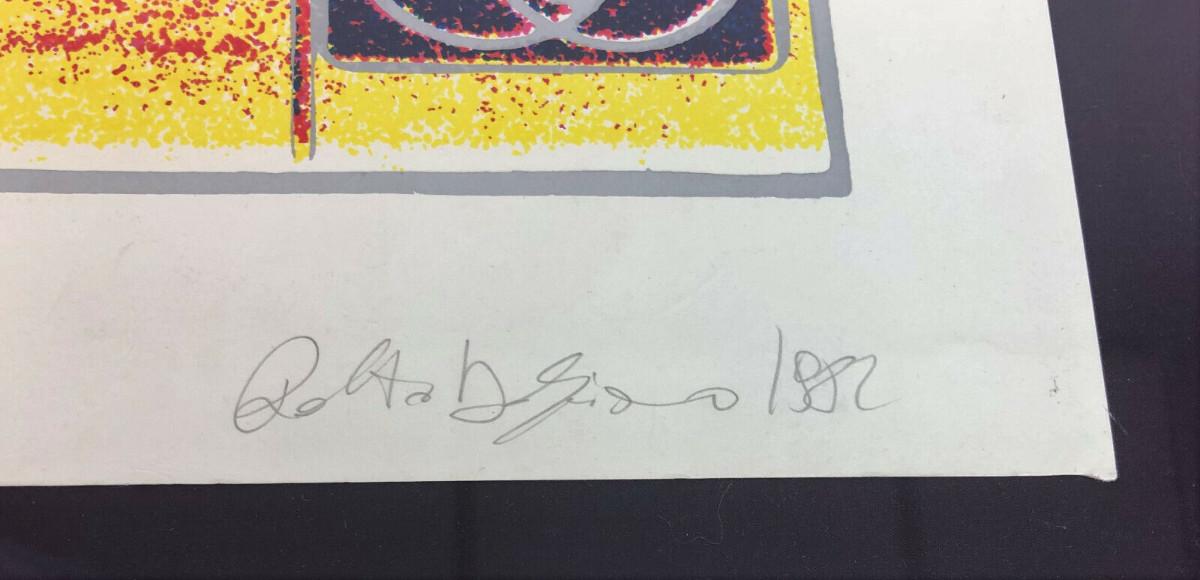 As with many artist signature's they are often done with a flourish and oft times hard to decipher..as is the case with this marvelous seriagraph created for a show by the Rolling Stones in 1982 in Torino or Turin, Italy...Note reflection..photographed under glass...Measures 27.5 x 19.5"...Not numbered so I cannot say if this is a single work or a mutiple? Either way a rare tour piece.