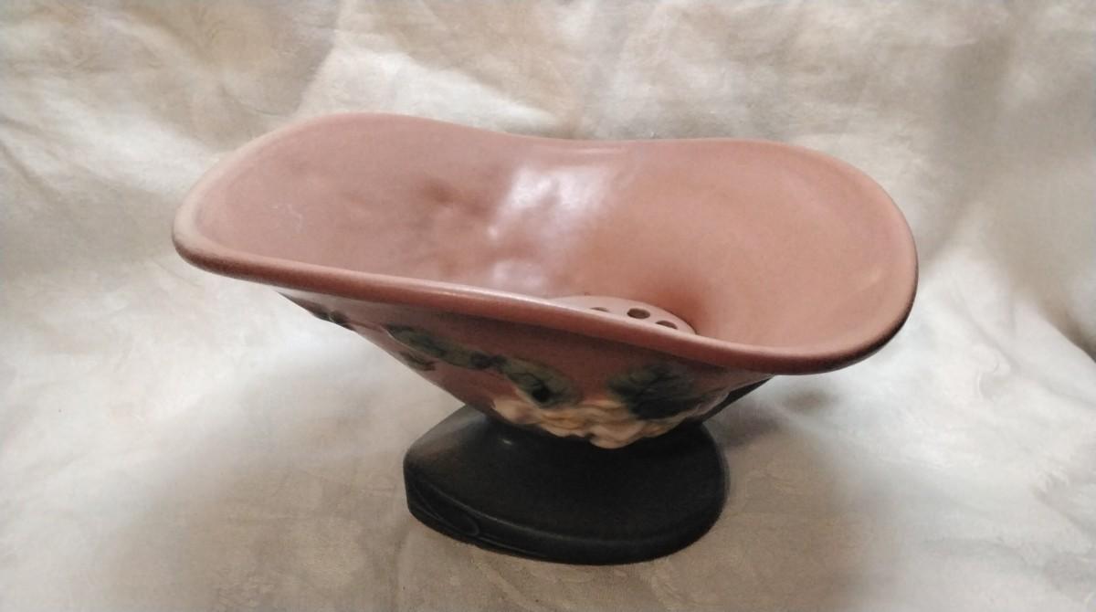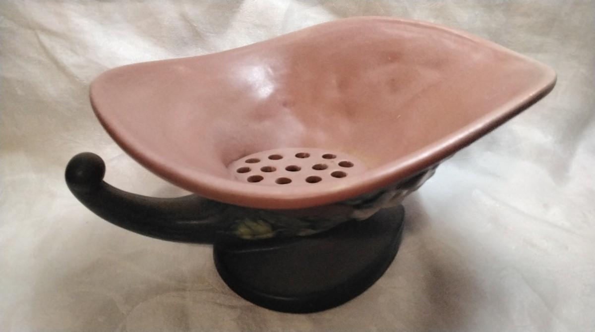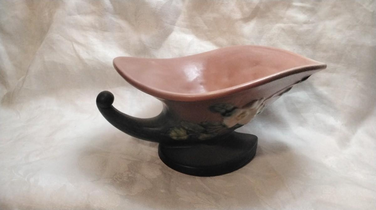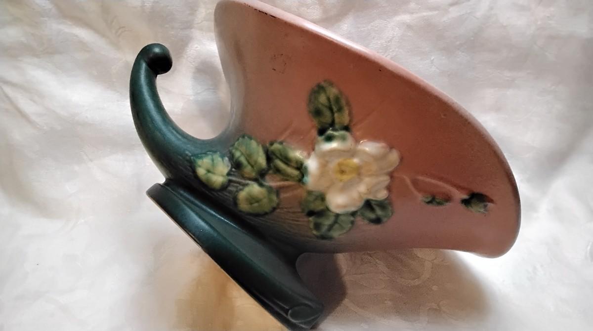Extremely rare Roseville white rose cornucopia with flower frog. This cornucopia is approximately 10 1/2” in length and 8” wide. The frog is permanently attached to the piece. The color is a pink with green accents on the base. . There is a chip on the base but when sat on display it is not visible at all. The era of this cornucopia is 1940’s., Numbered 1 and grease marked with the makers initials.