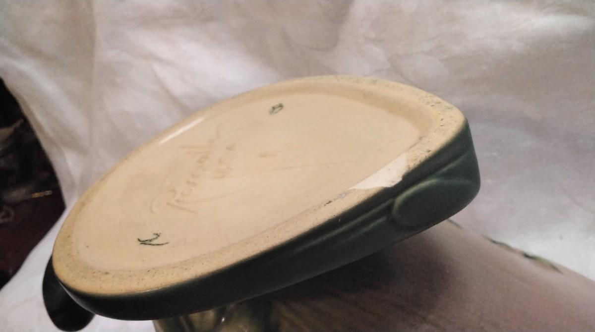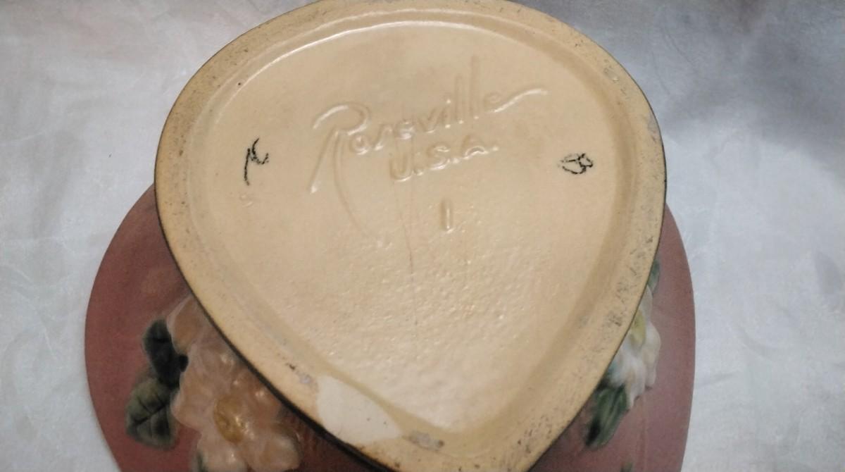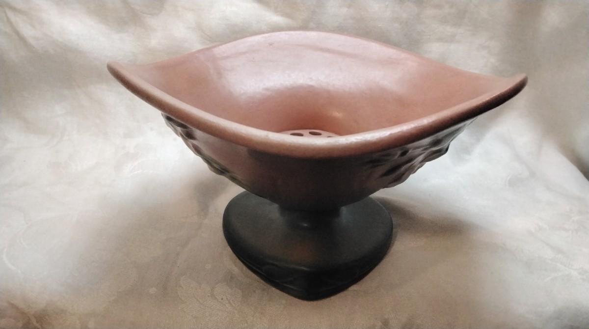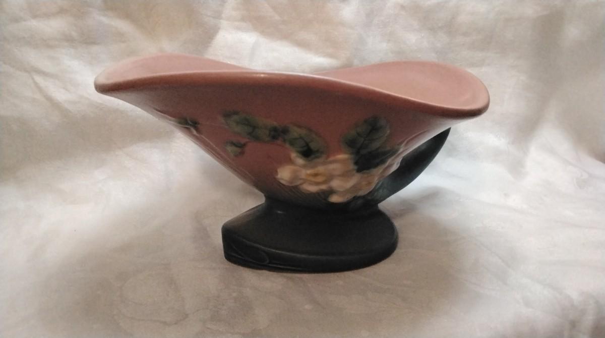 Extremely rare Roseville white rose cornucopia with flower frog. This cornucopia is approximately 10 1/2” in length and 8” wide. The frog is permanently attached to the piece. The color is a pink with green accents on the base. . There is a chip on the base but when sat on display it is not visible at all. The era of this cornucopia is 1940’s., Numbered 1 and grease marked with the makers initials.