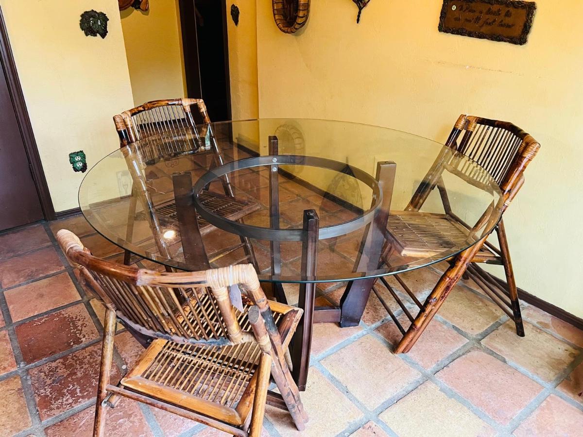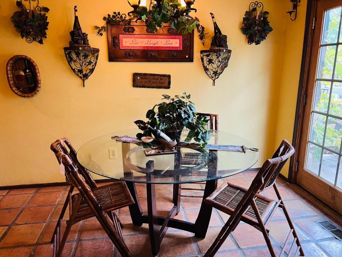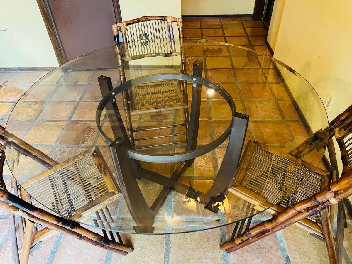 Round Glass To[ Dining Table and 3 Bamboo Chairs.