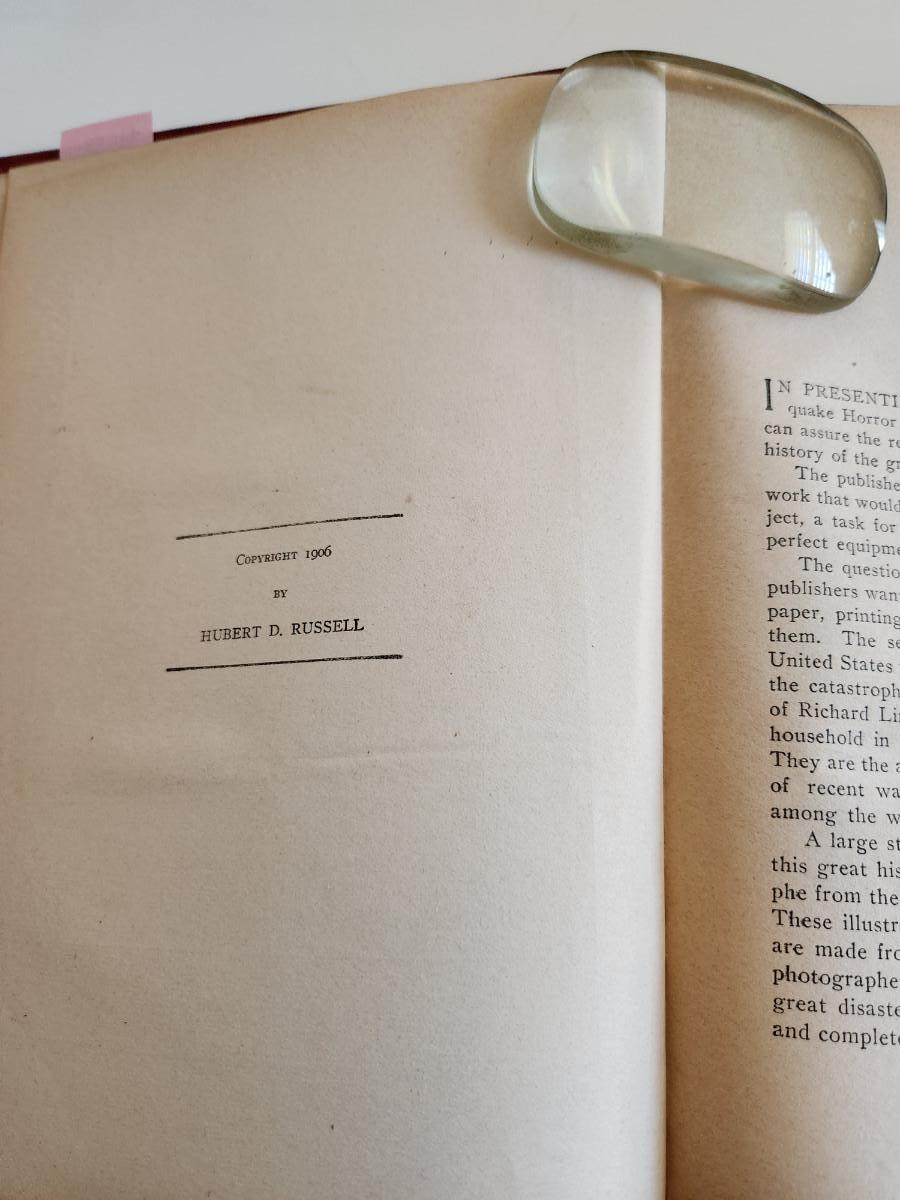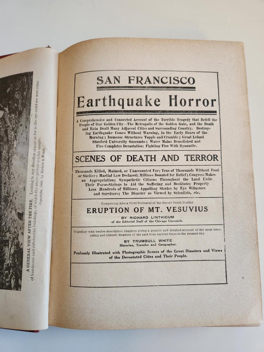This auction lot is for a copy of the book San Francisco Earthquake Horror by Trumbull White. This antique book was published in 1906. It looks at the disaster befallen San Francisco due to the great earthquake. The book is filled with information and historical facts. The book is a hard bound 408 page volume in very nice condition for its age.