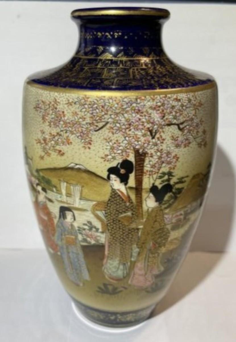 Scarce Japanese Cobalt-Ground Meiji Period (1868-1912) Satsuma Signed Base Vase w/2 Panels 7" Tall in VG Preowned Condition. $12 Domestic Inhouse Shipping.
