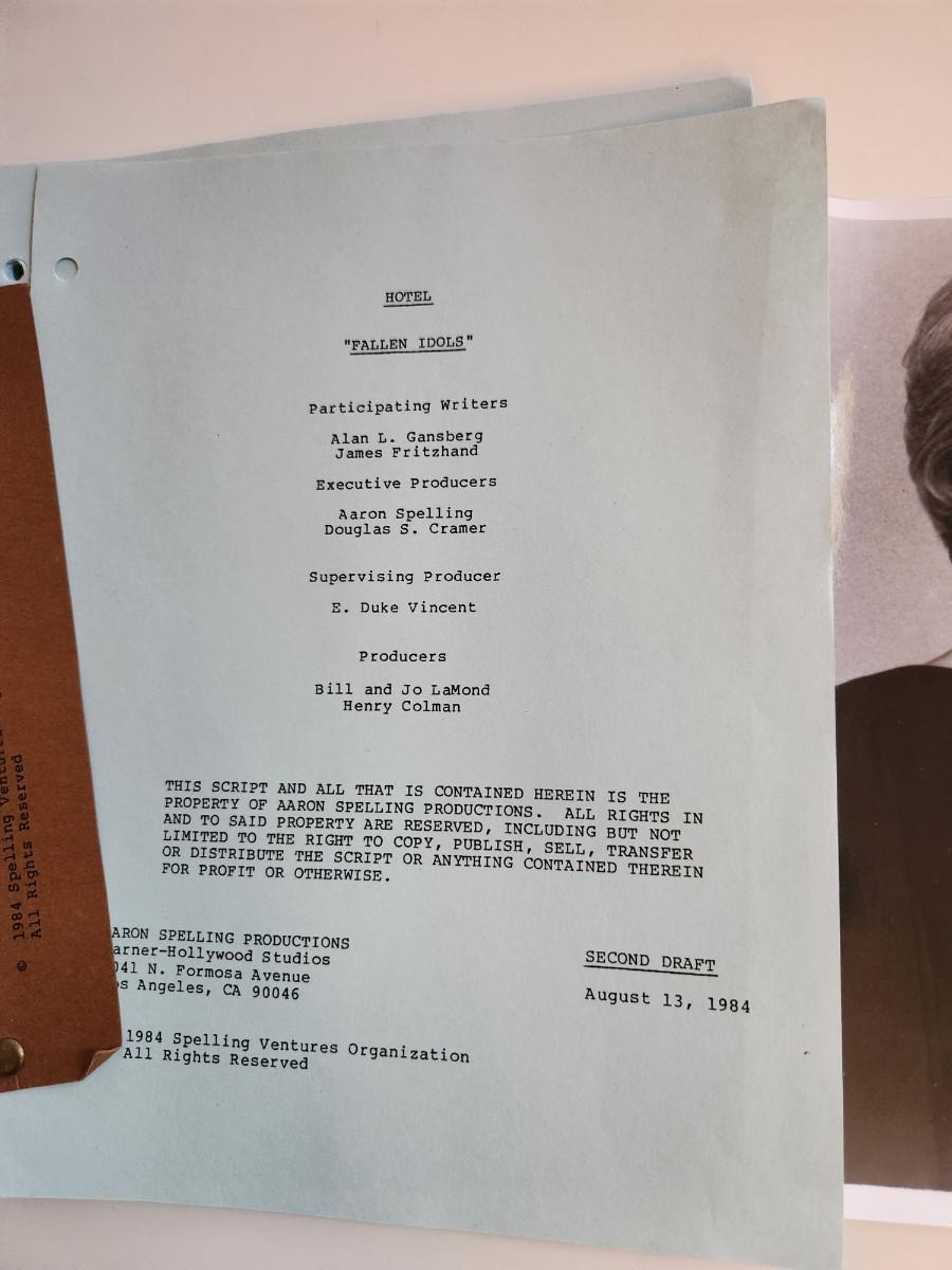 This auction lot is for a copy of a Script From Arthur Hailey's Hotel ABC-TV Series Signed by Victoria Cabot who was a cast member in the episode entitled " Fallen Idols". The script contains 54 pages of dialogue and this offering includes a photo of Victoria Cabot who chose to sign both the photo and the script with the name of the character she played in the show - Anne Baxter. This episode was from the 1984 season.