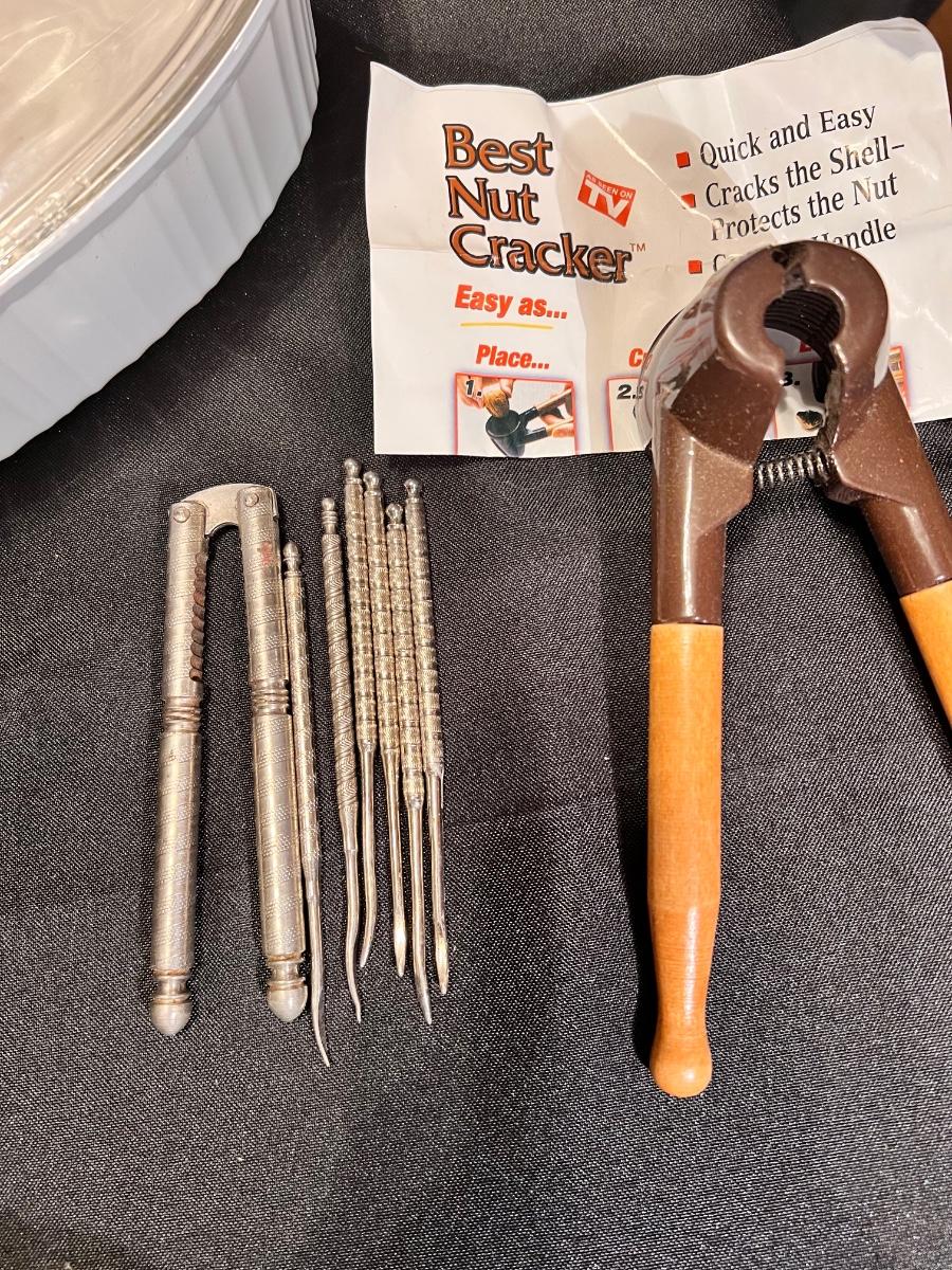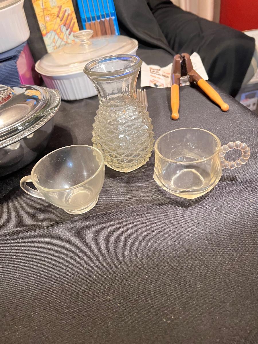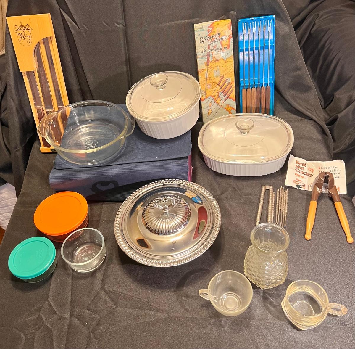 Forgecraft knives, 2 Corningware serving bowls, fondue set of forks, nut crackers vintage and a bit newer, 3 small Pyrex bowls (one missing lid), Vintage 1980 FTD vase, and two tea cups.