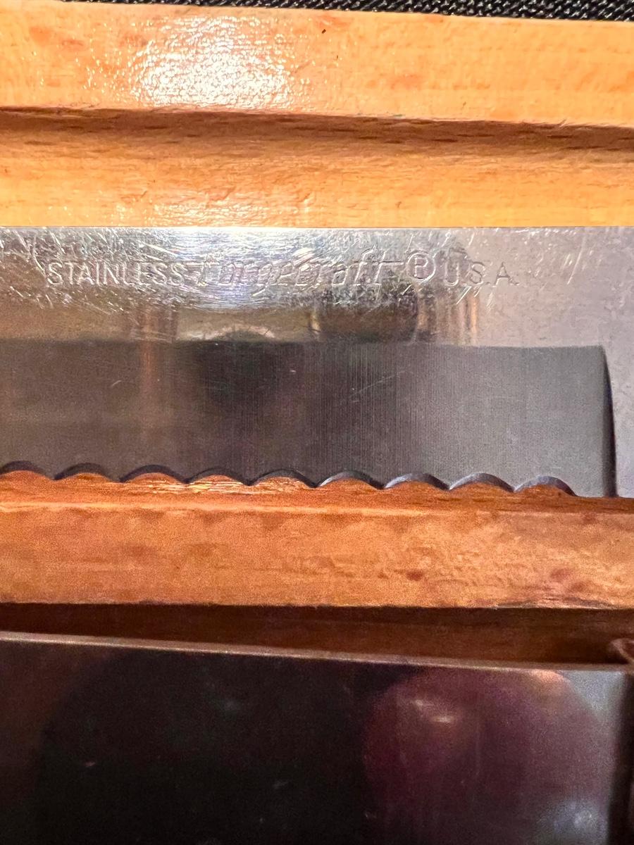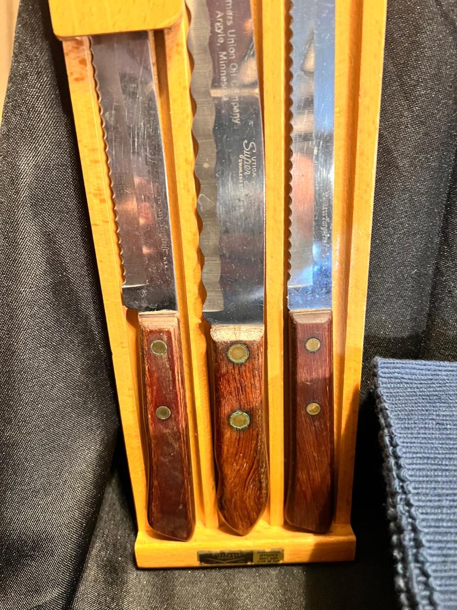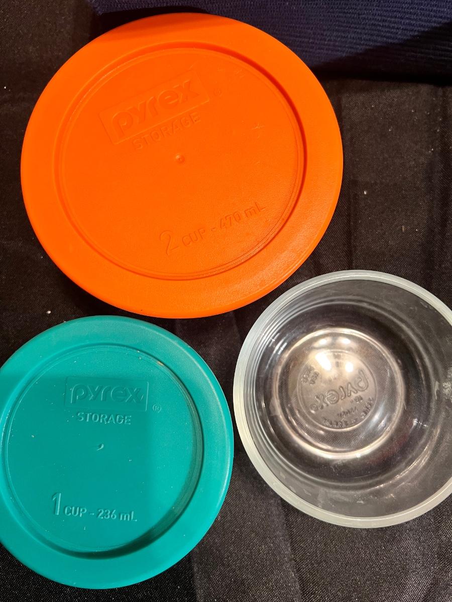 Forgecraft knives, 2 Corningware serving bowls, fondue set of forks, nut crackers vintage and a bit newer, 3 small Pyrex bowls (one missing lid), Vintage 1980 FTD vase, and two tea cups.