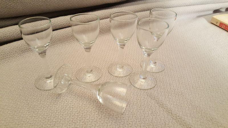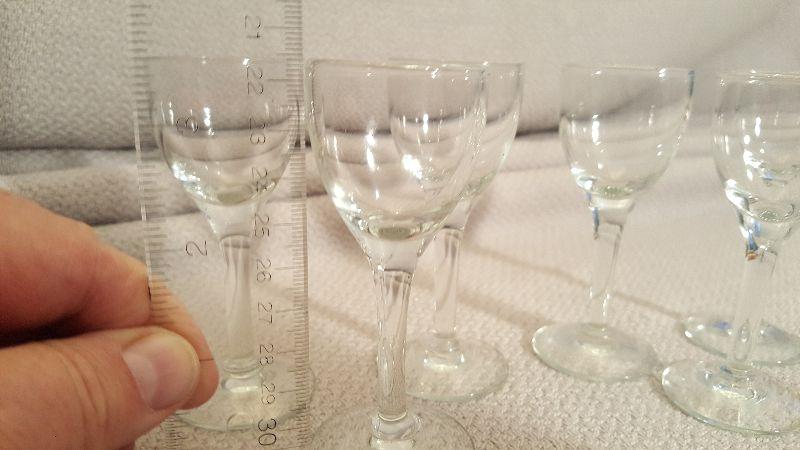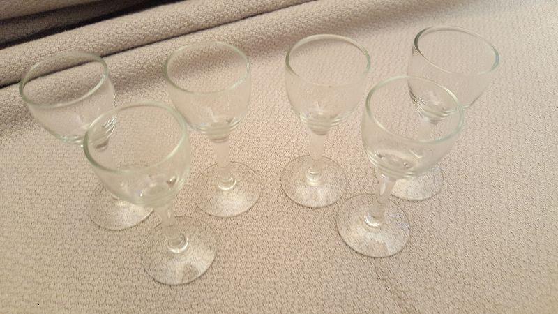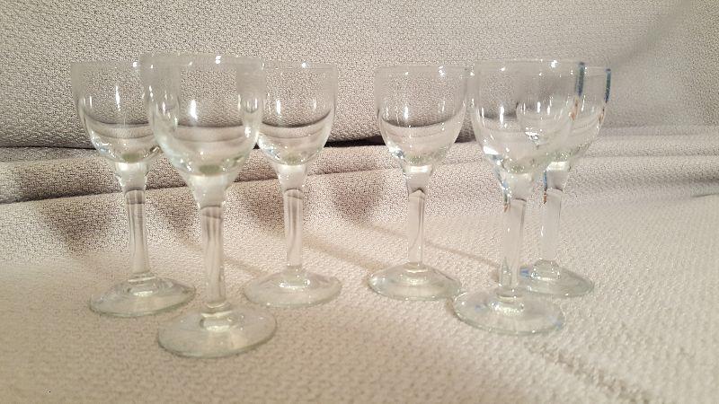 This auction lot is for a Set of 6 Cordial Glasses. These petite and serviceable cordials are made from sturdy glass and ready for your next toast. They measure about 4-inches tall and will hold a nice nip of your favorite libation. Donated by Kay Whitlock.