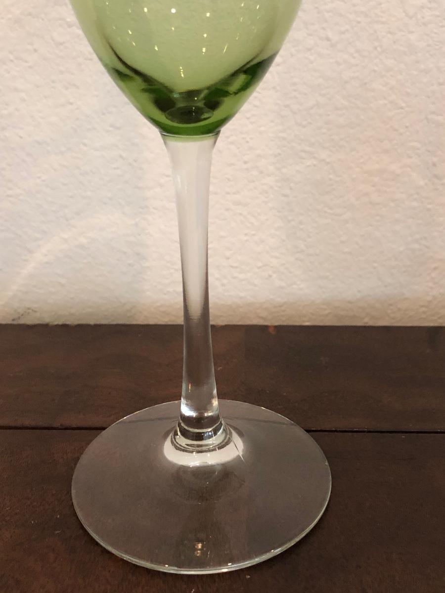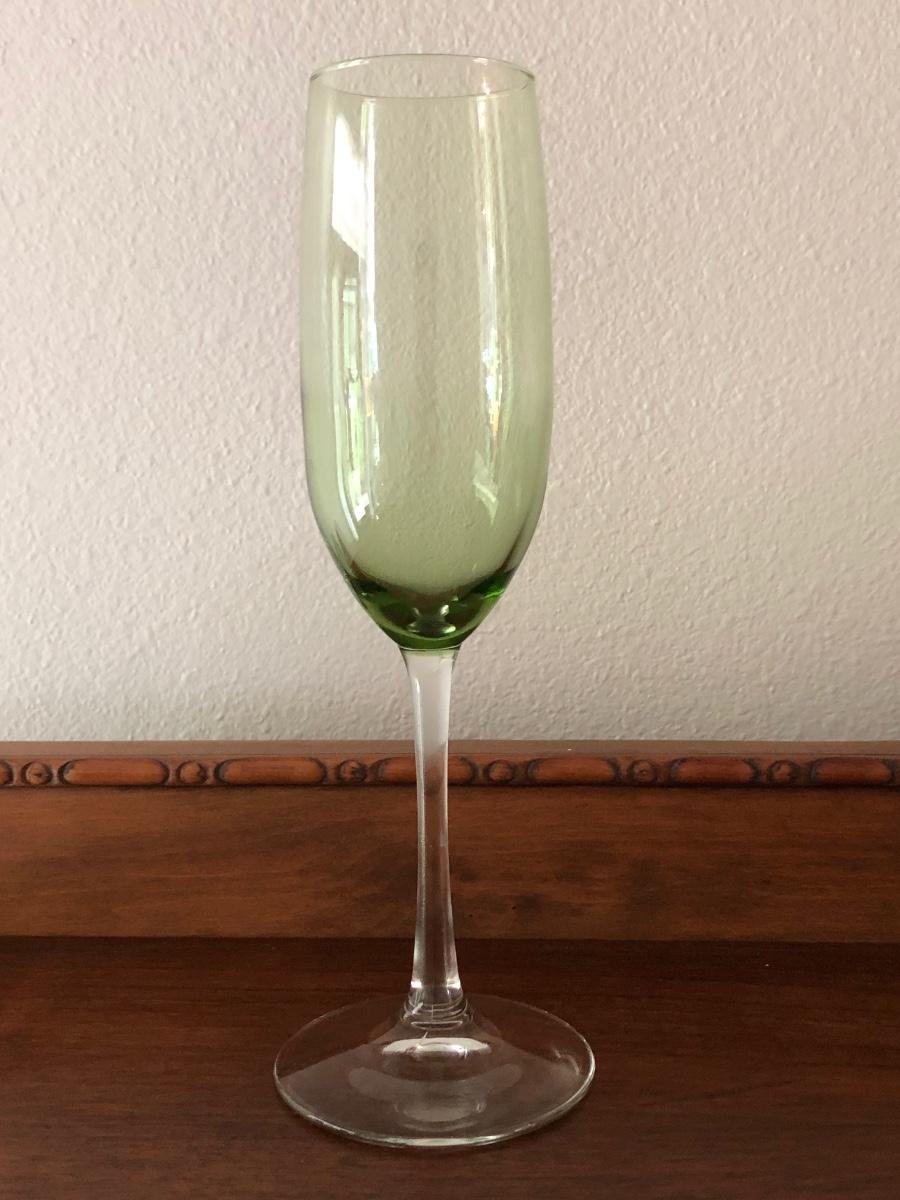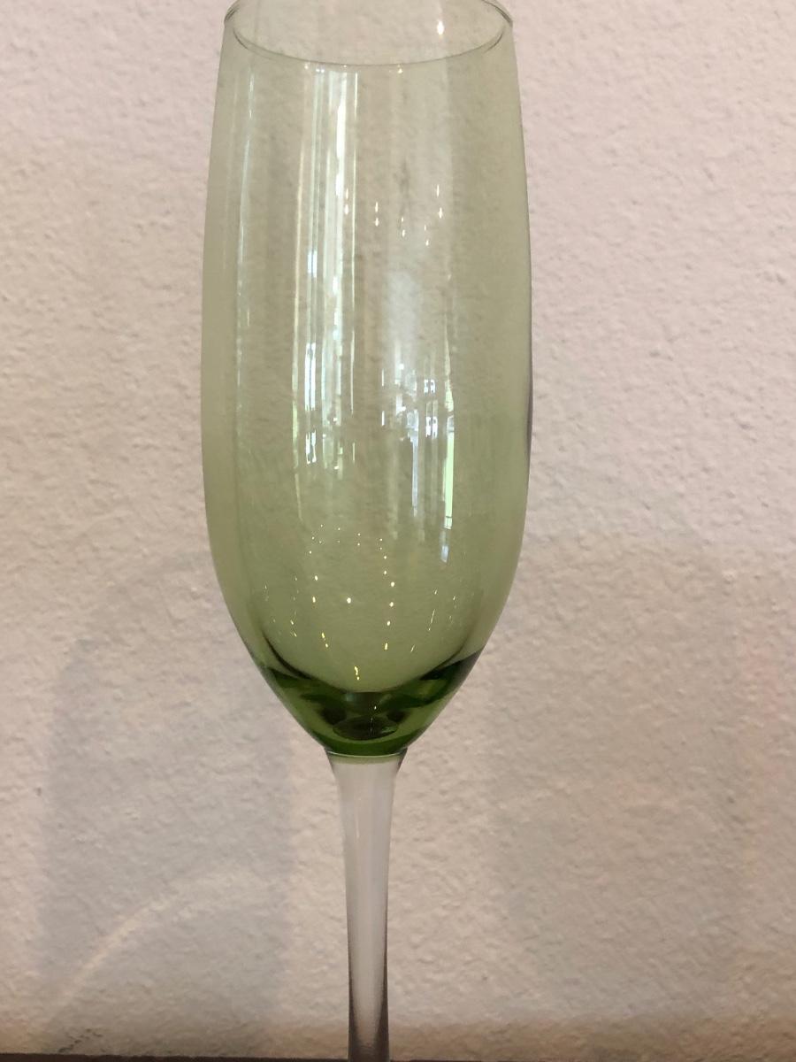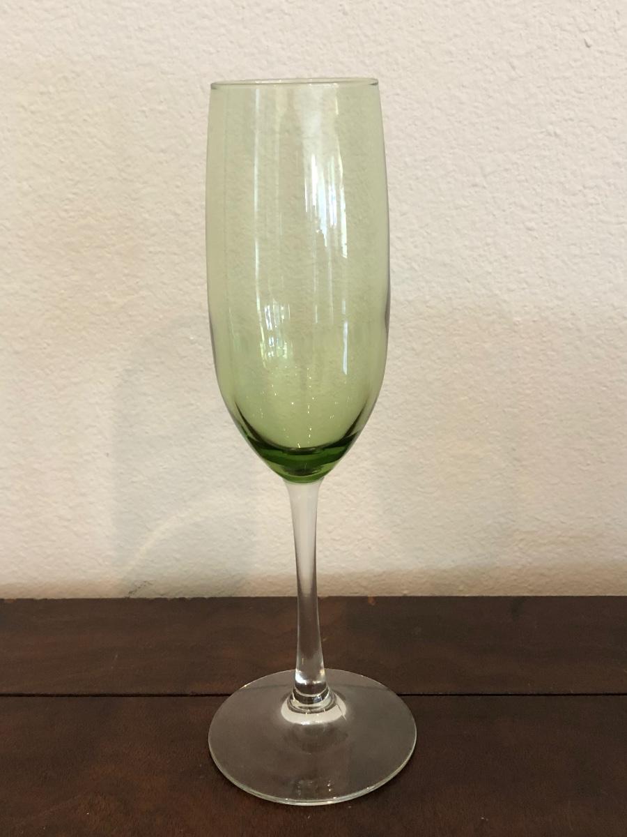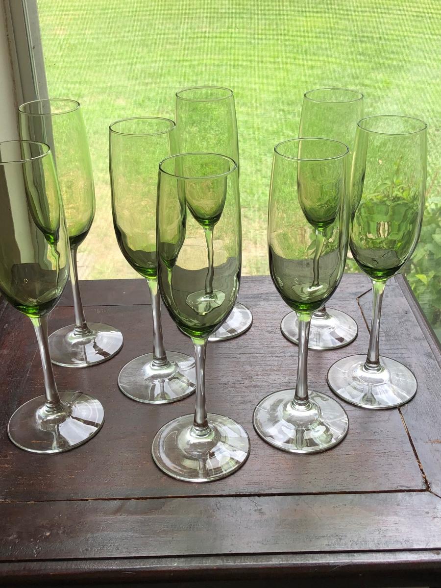 8 pale green champagne flutes glasses with clear stems. Excellent condition, no chips or cracks. Measures 9 1/4 tall with 2” top opening. Very elegant looking.