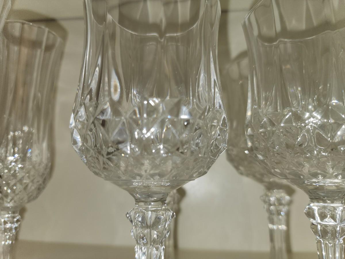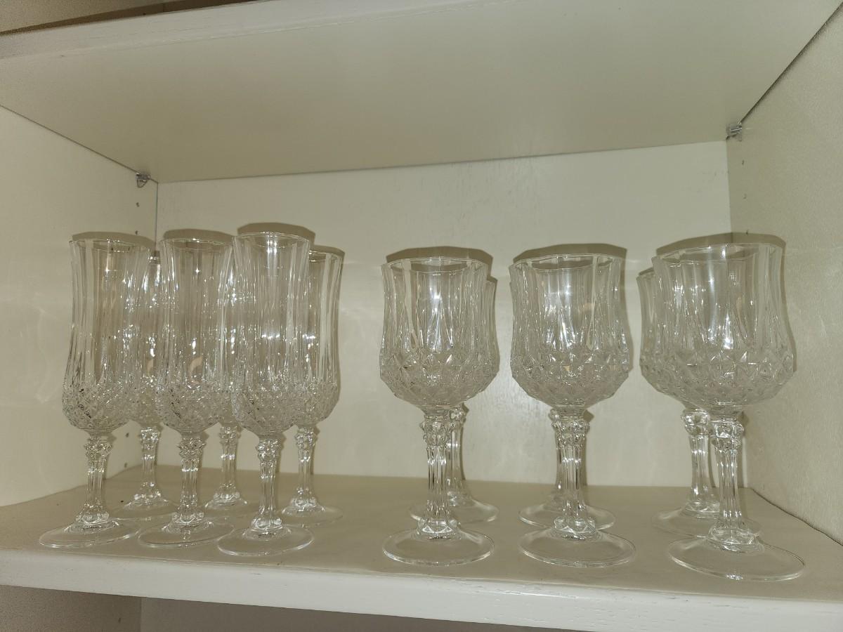 6 goblets and 6 flutes. Nice shape. No chips found. Crystal.