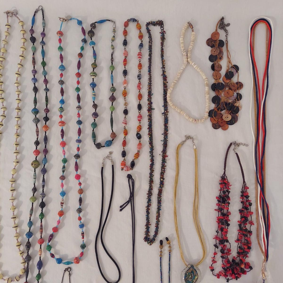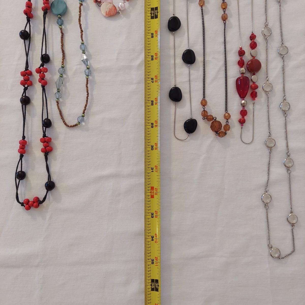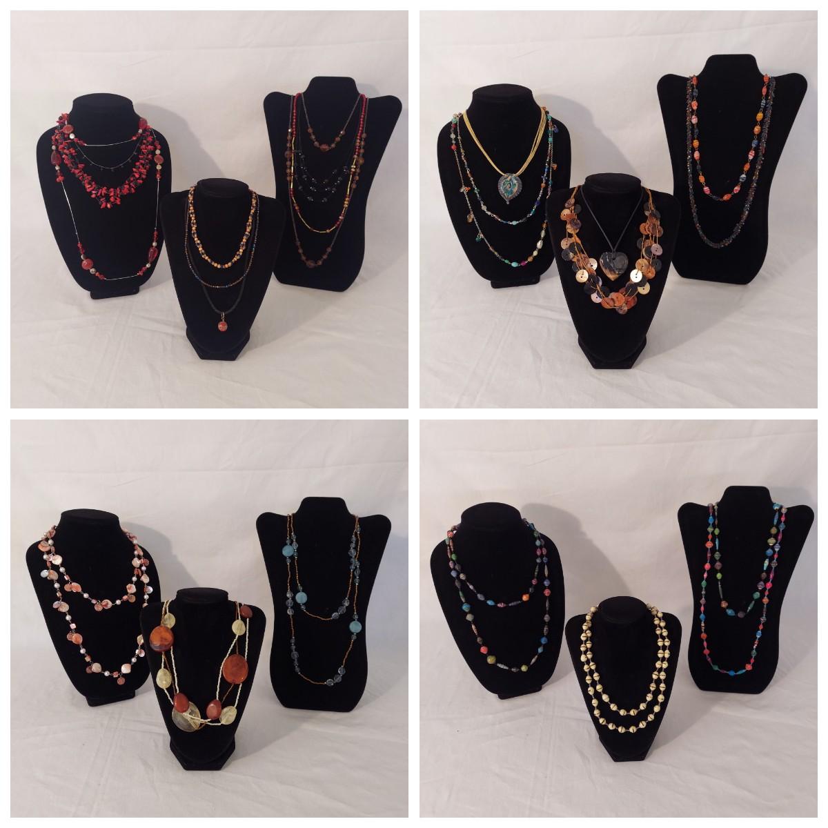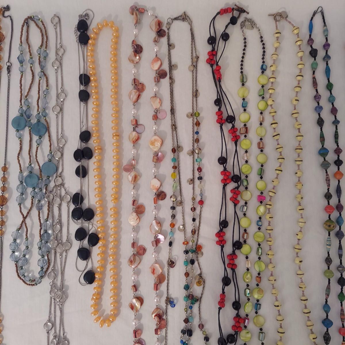 Lot includes approximately 30 necklaces in a casual or costume jewelry style. Some are beaded, some are chain link. They range from 14-72” in length. Please see photos for details. Shipping available. All sales are final. No returns or refunds. Please bid accordingly.