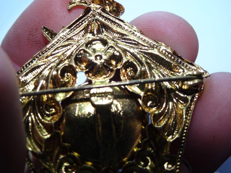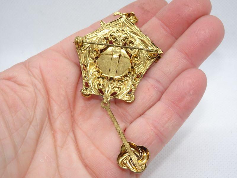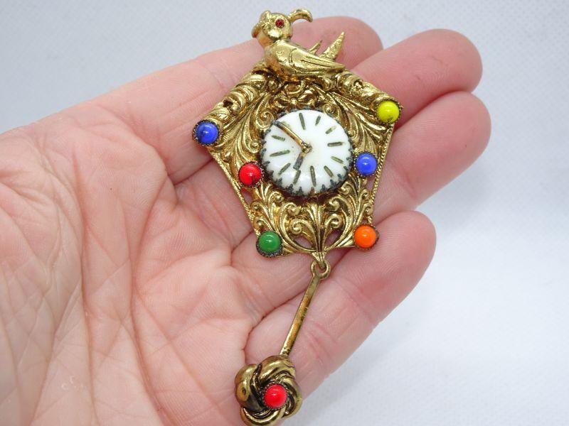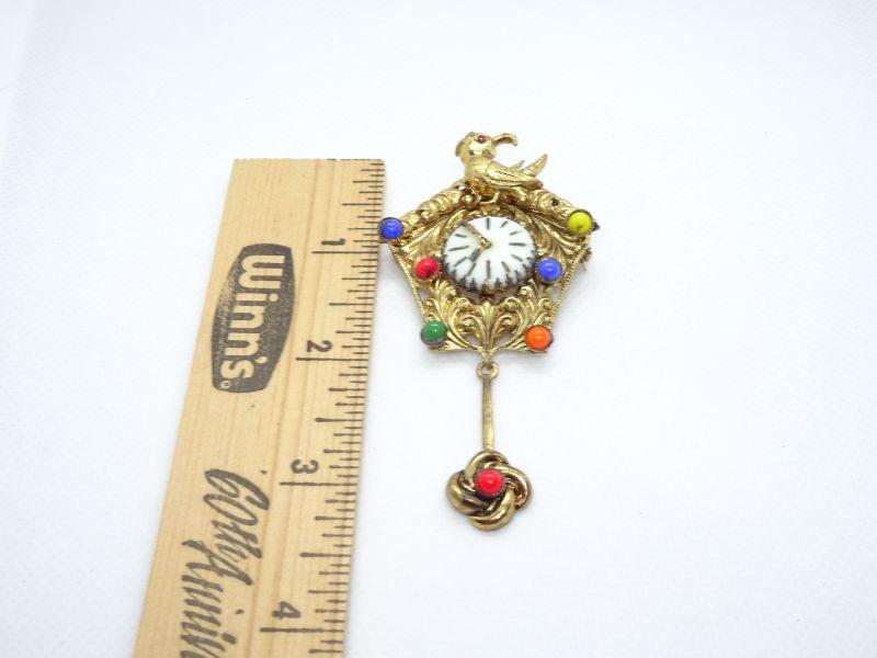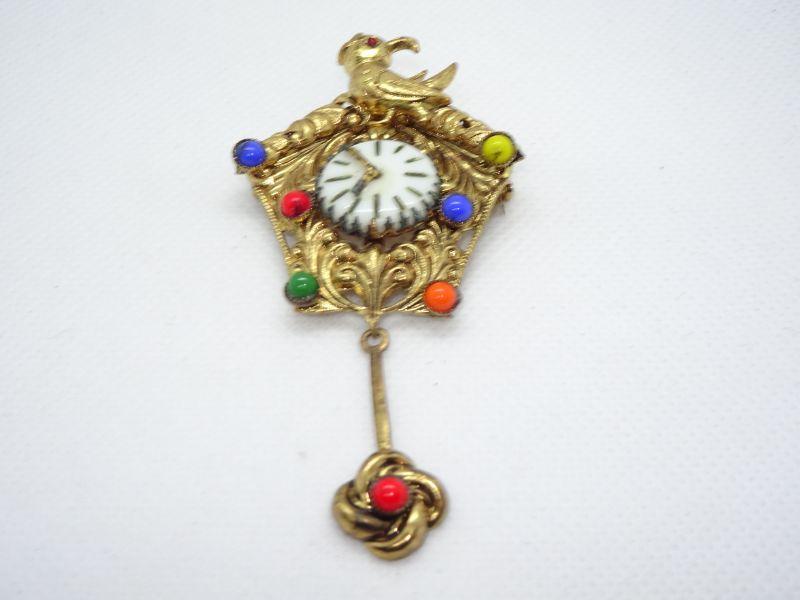 Signed Czechoslovakia gold tone cuckoo clock pin brooch with multicolored cabochons and a pendulum
