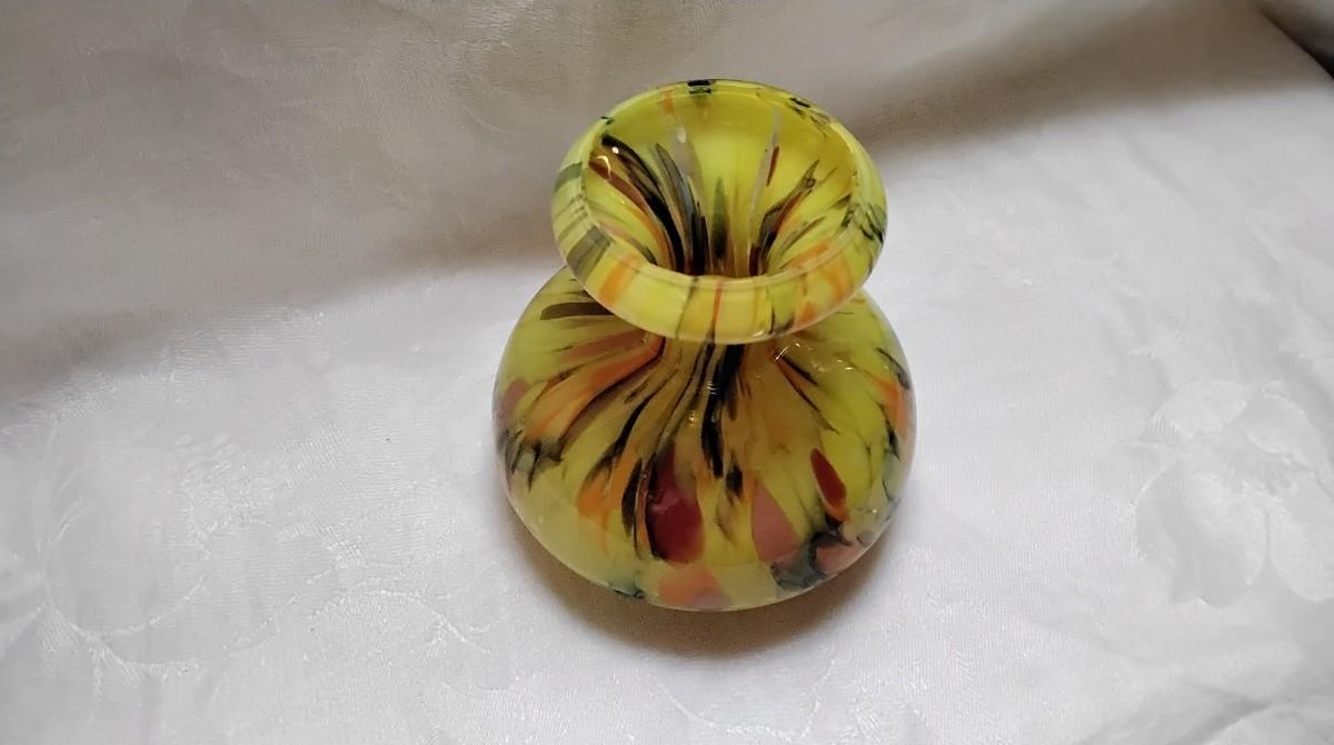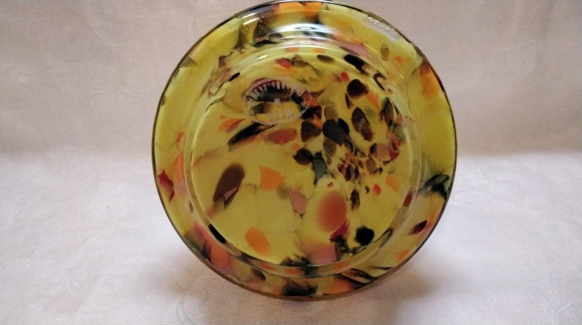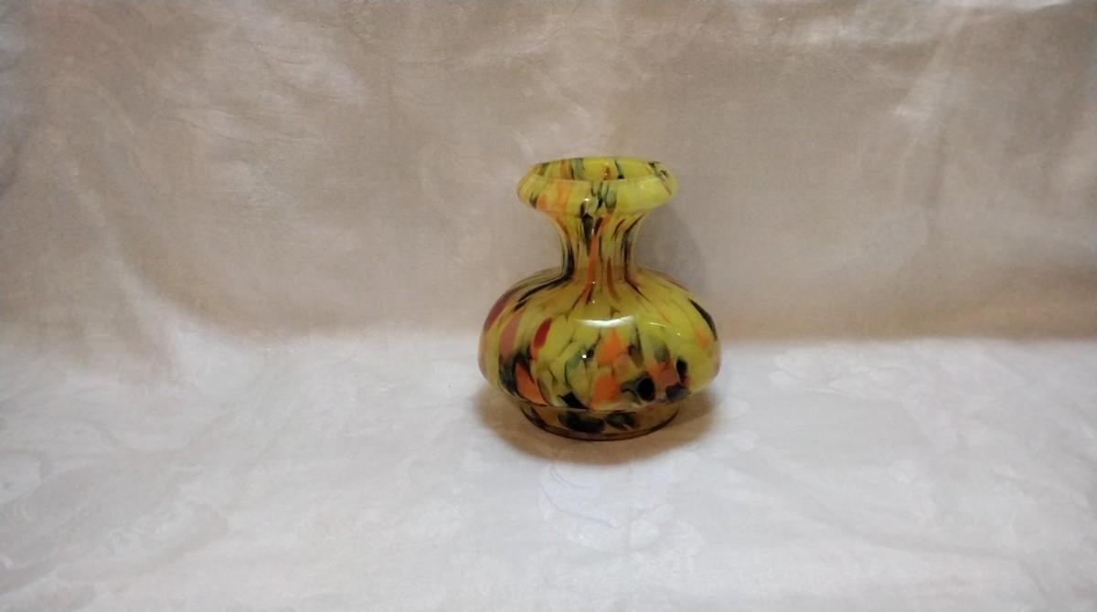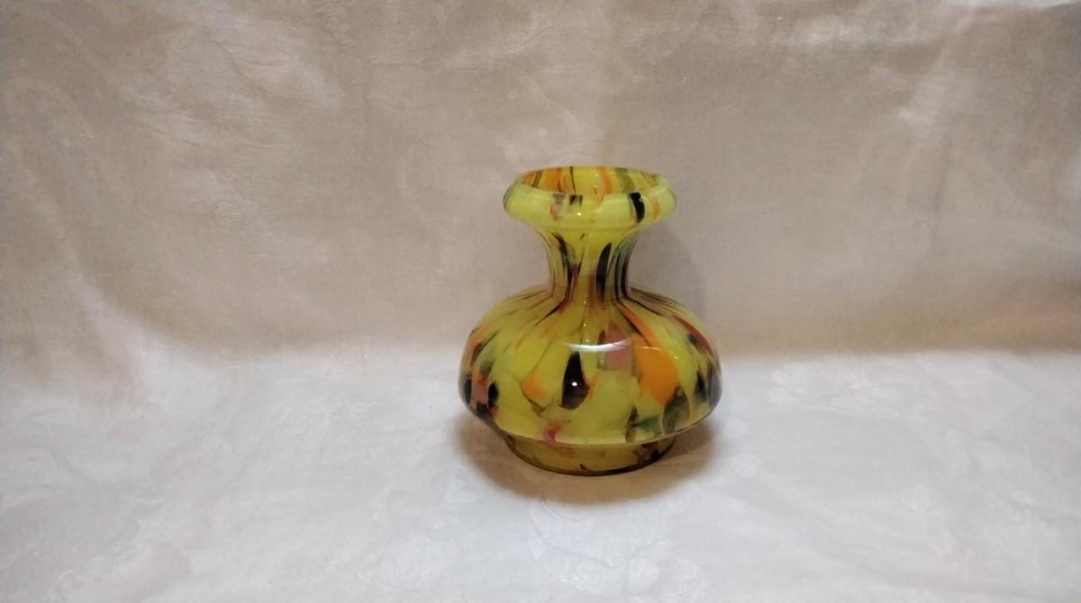 A piece of "Splatter glass" also known as "End of Day" styled glass art made by Rindskopf. Being covered in a mix of hues floating amidst its' yellow primary, this piece is certain to brighten any space it occupies. Marked with a white oval containing 'Made in Czechoslovakia' on the bottom. No Chips, Cracks, or Repairs of any sort 4" height 3" base