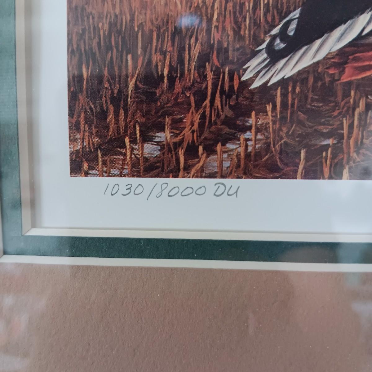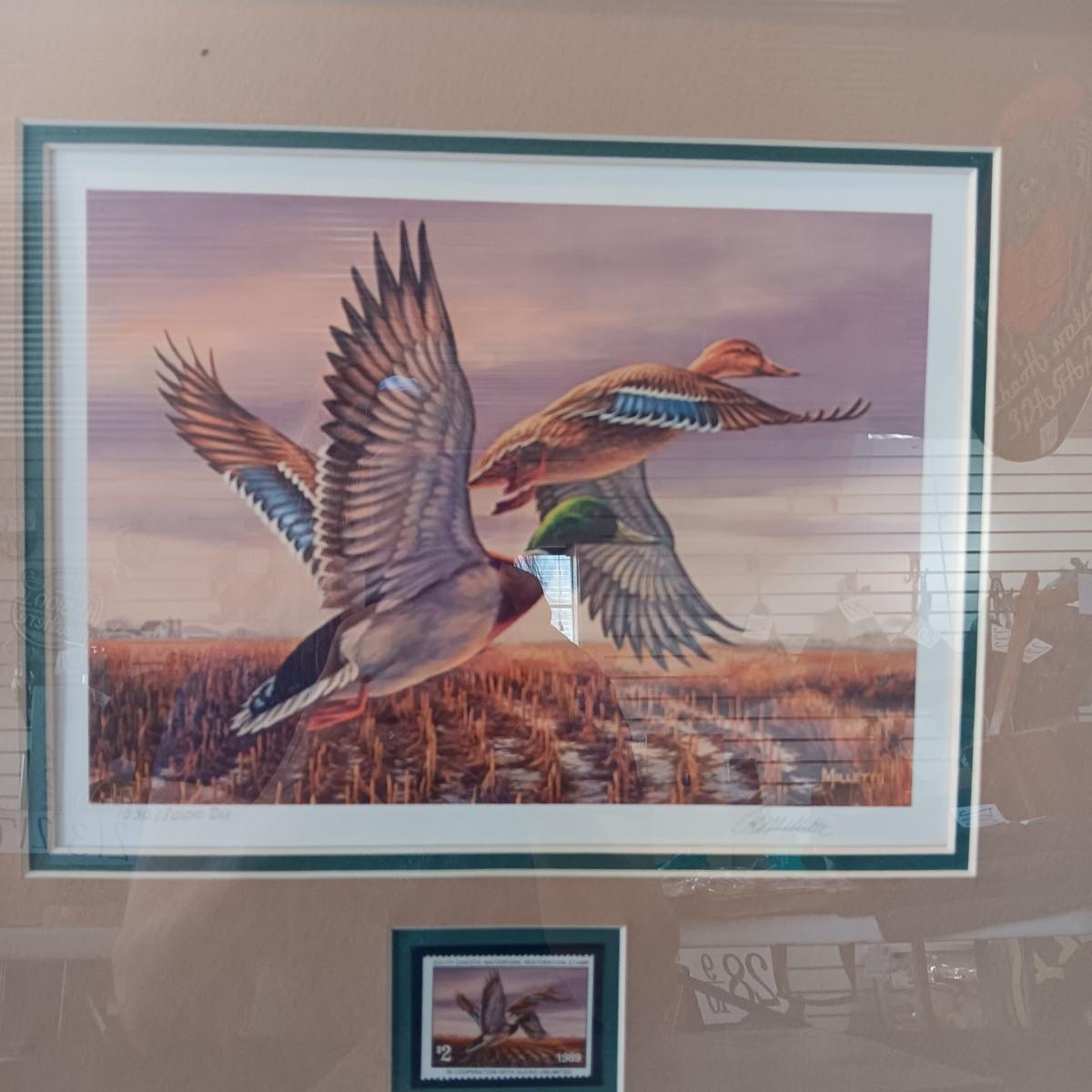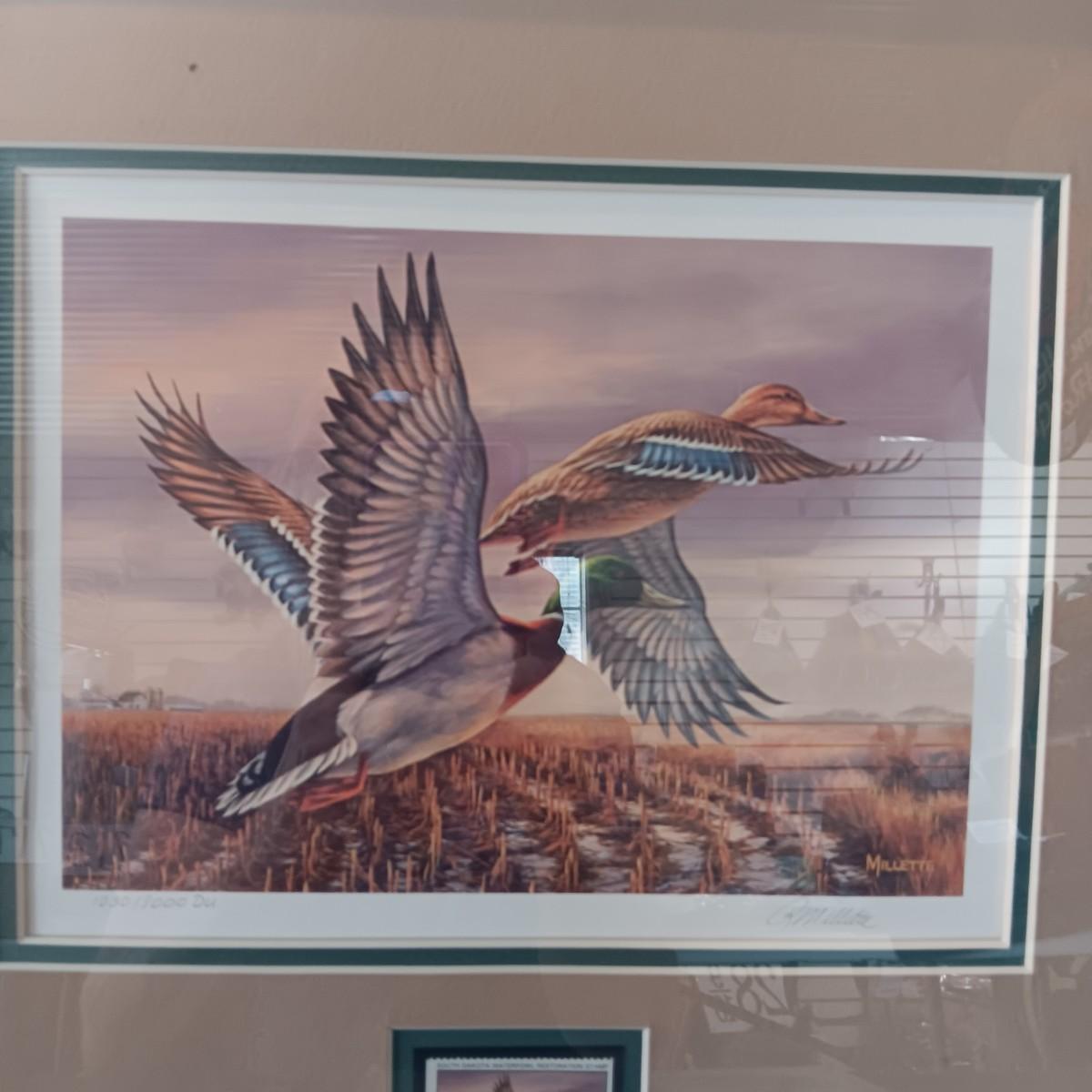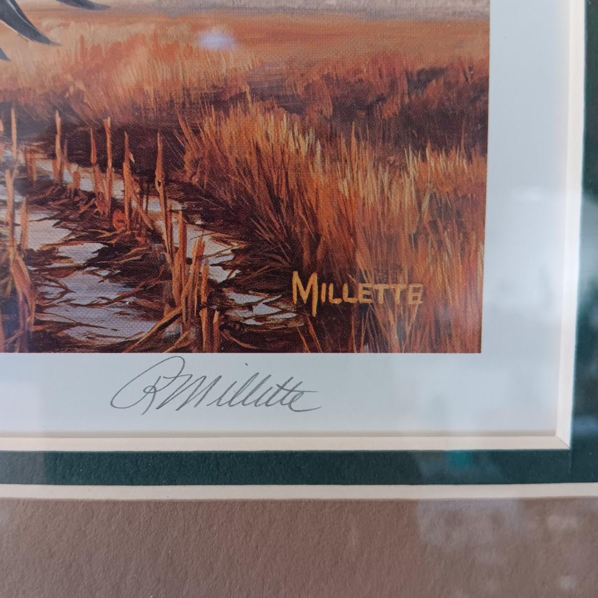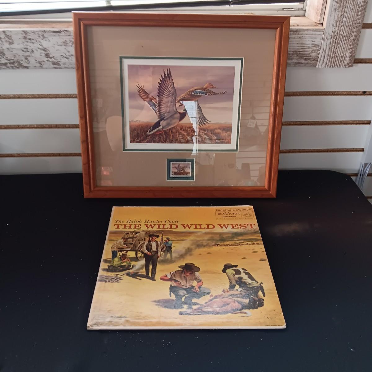 SIGNED 'MILLETTE" DUCKS UNLIMITED STAMP AND FRAMED PICTURE PLUS A VINYL ALBUM
