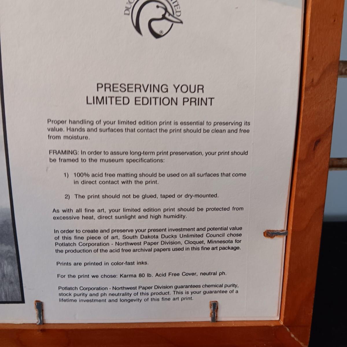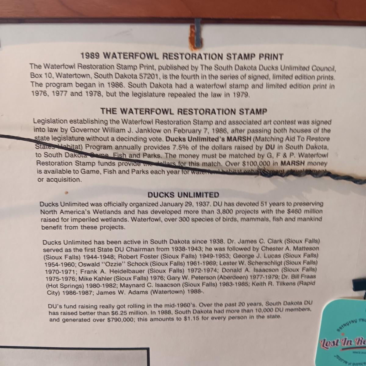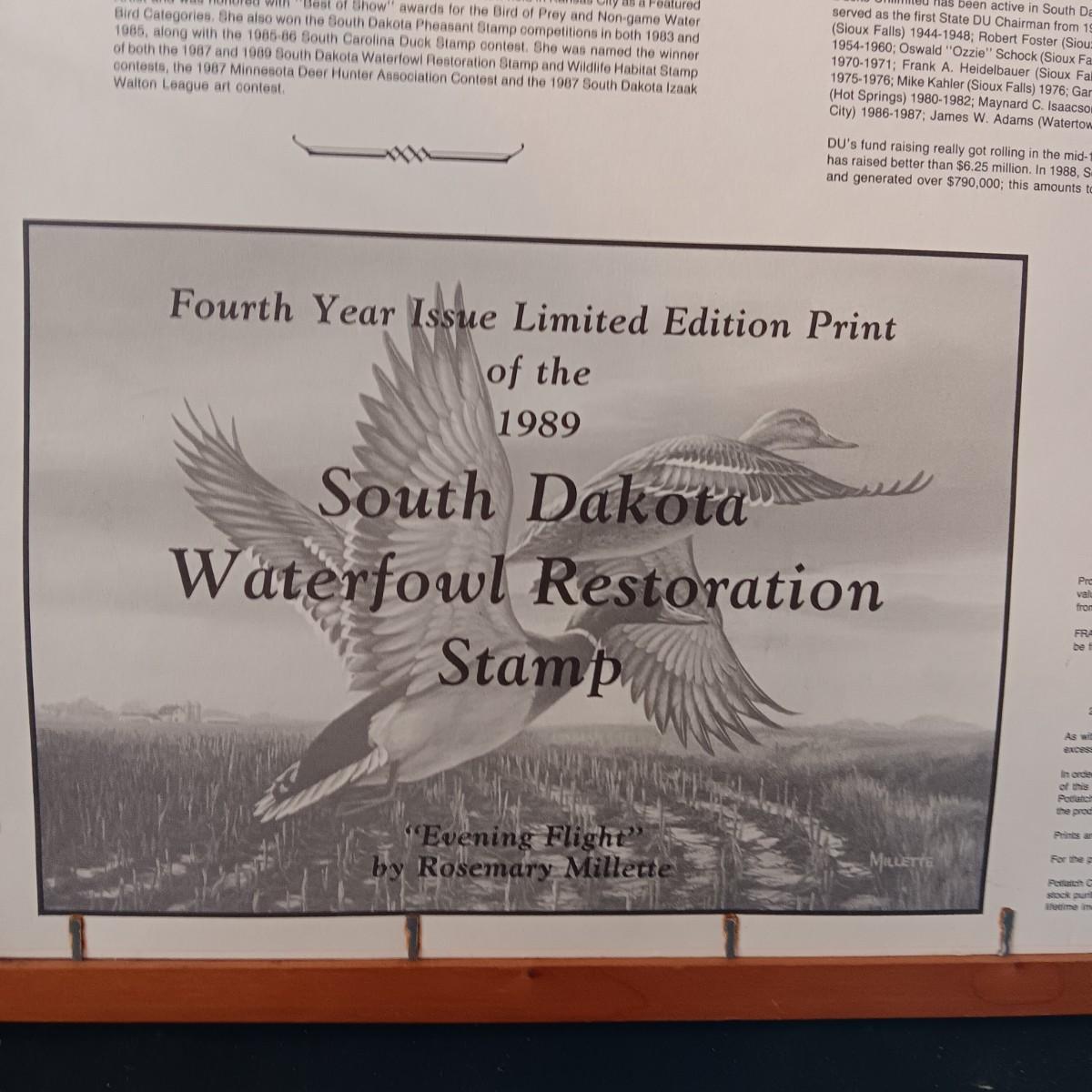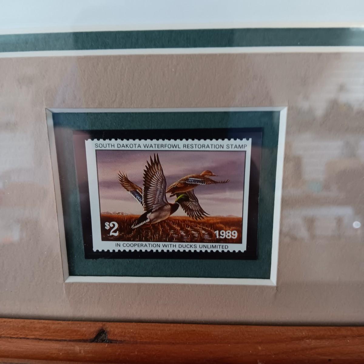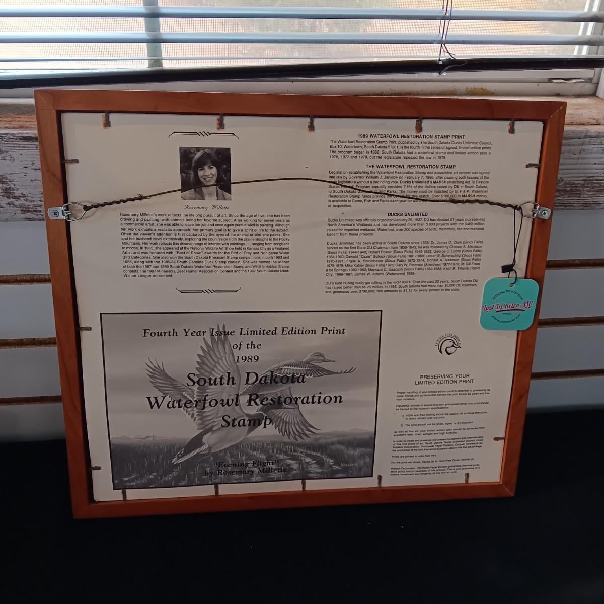 SIGNED 'MILLETTE" DUCKS UNLIMITED STAMP AND FRAMED PICTURE PLUS A VINYL ALBUM