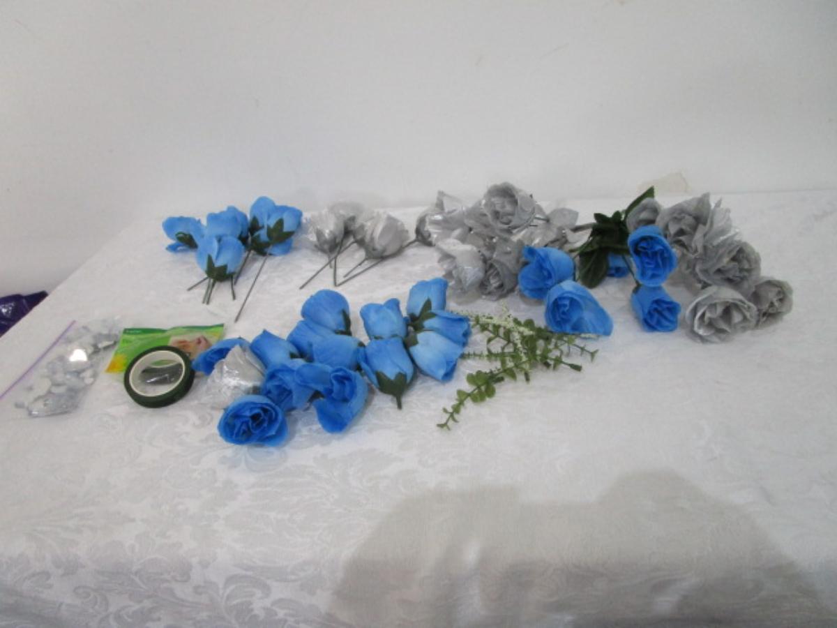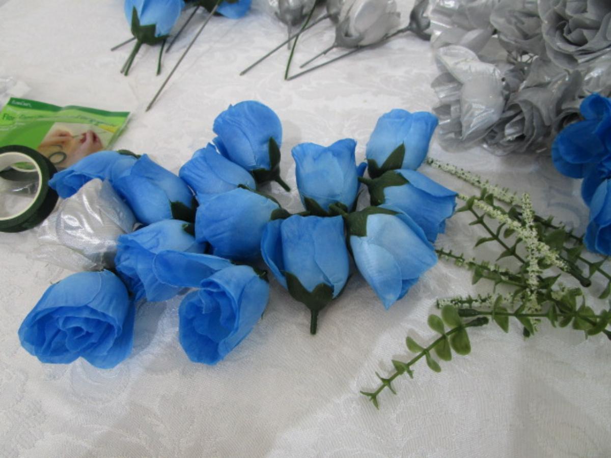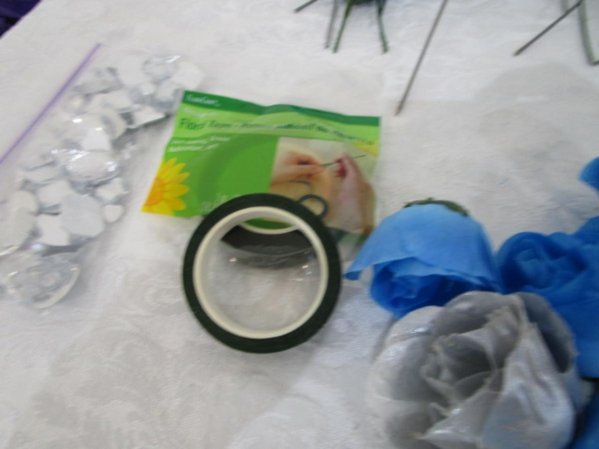 Silver & blue silk roses, floral tape, mirrored plastic gems