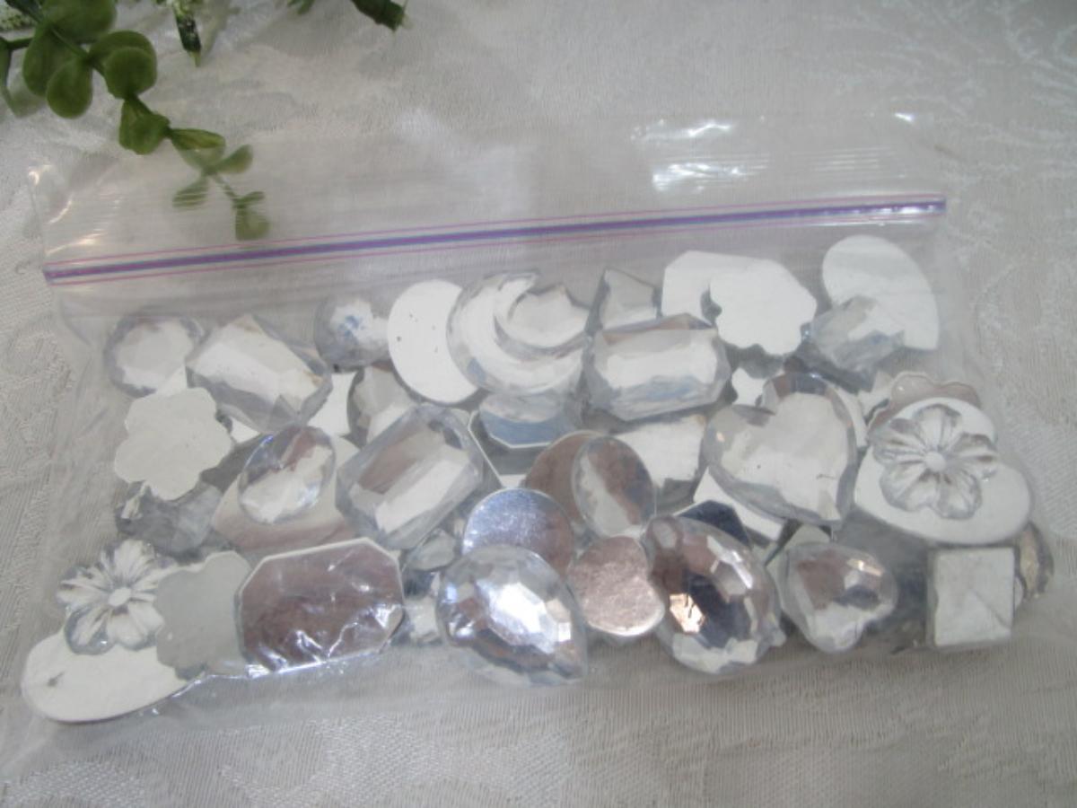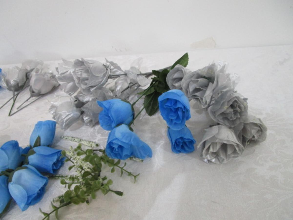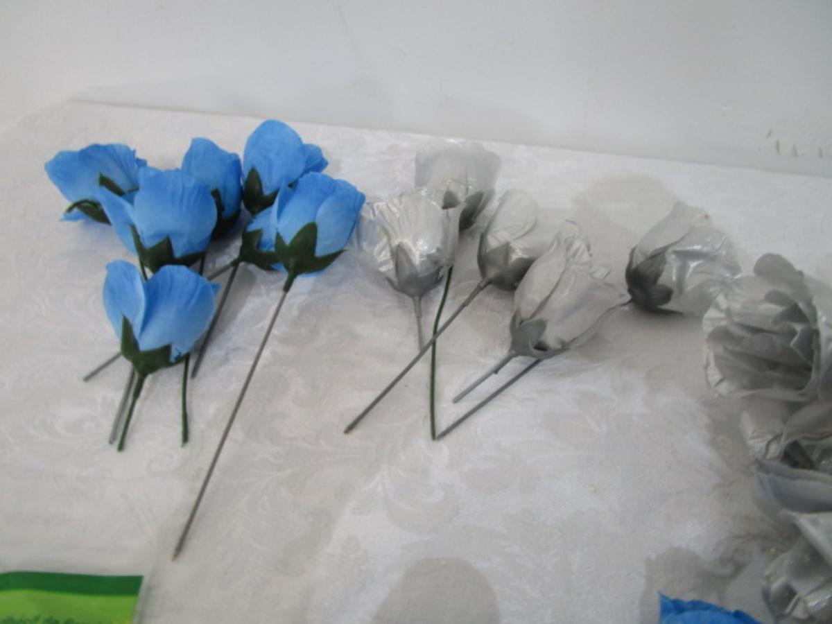 Silver & blue silk roses, floral tape, mirrored plastic gems