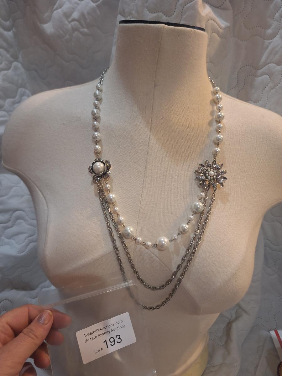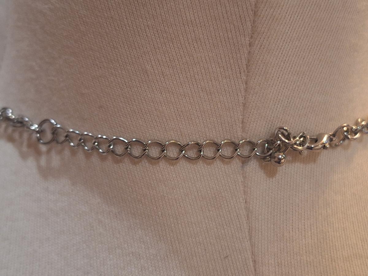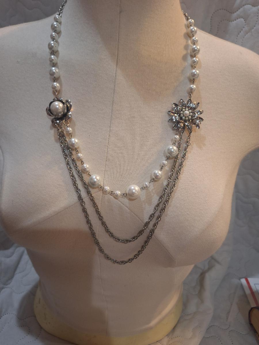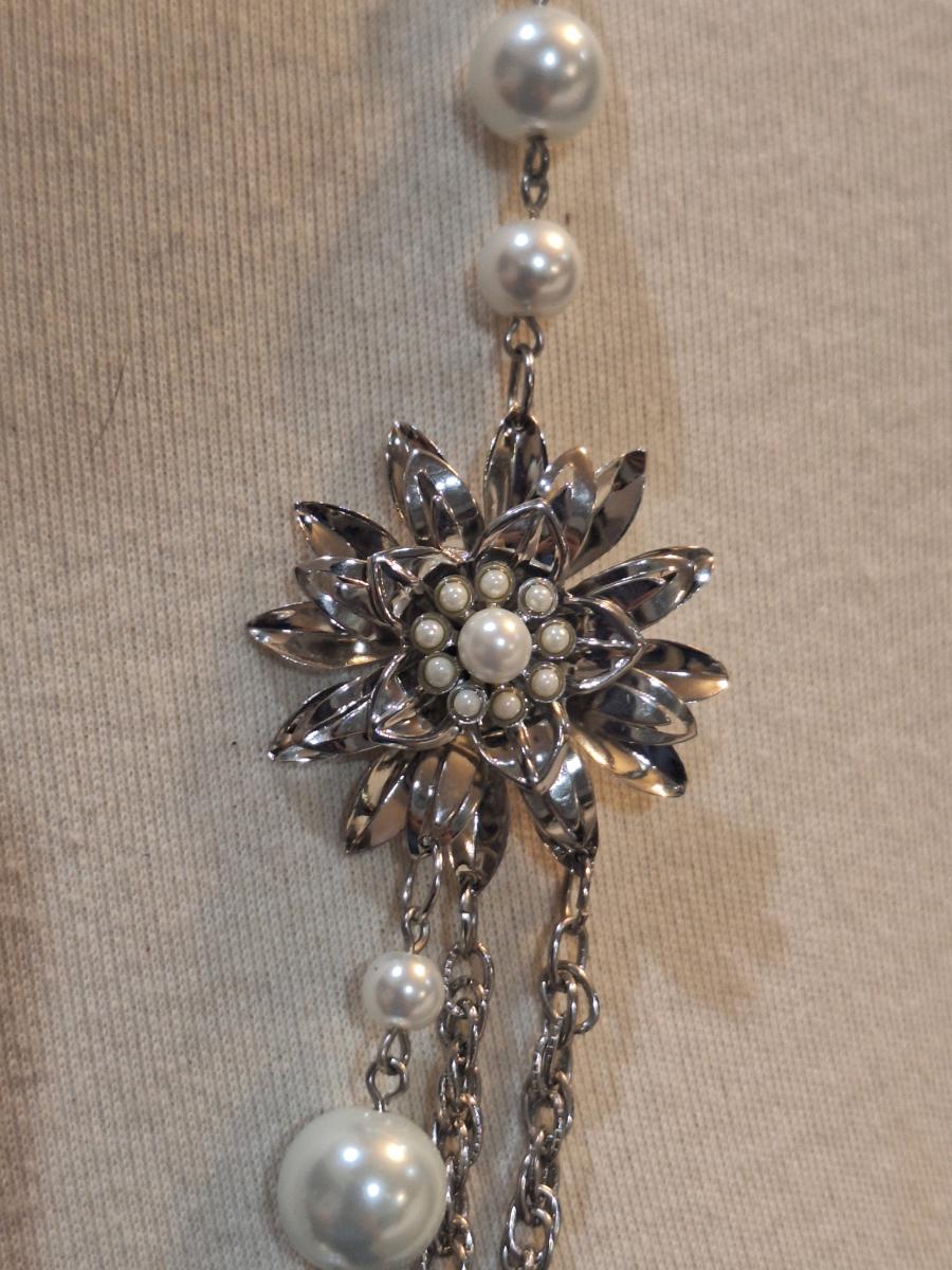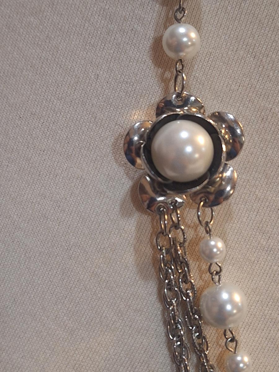 silver tone necklace with white beads