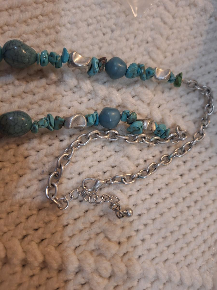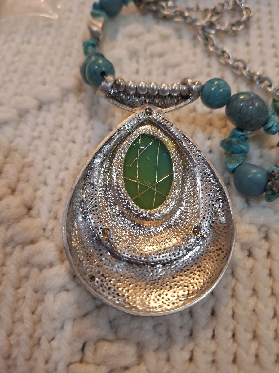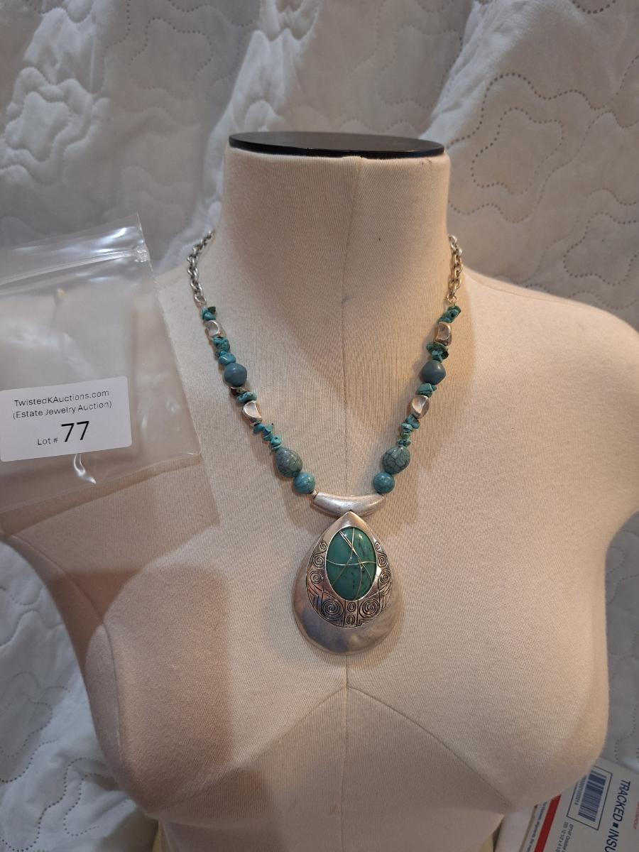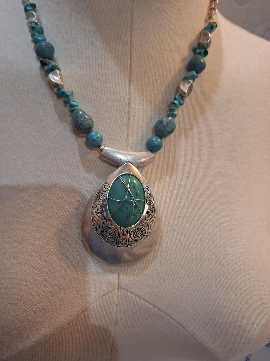 silver tone and turquoise colored necklace with statement pendant