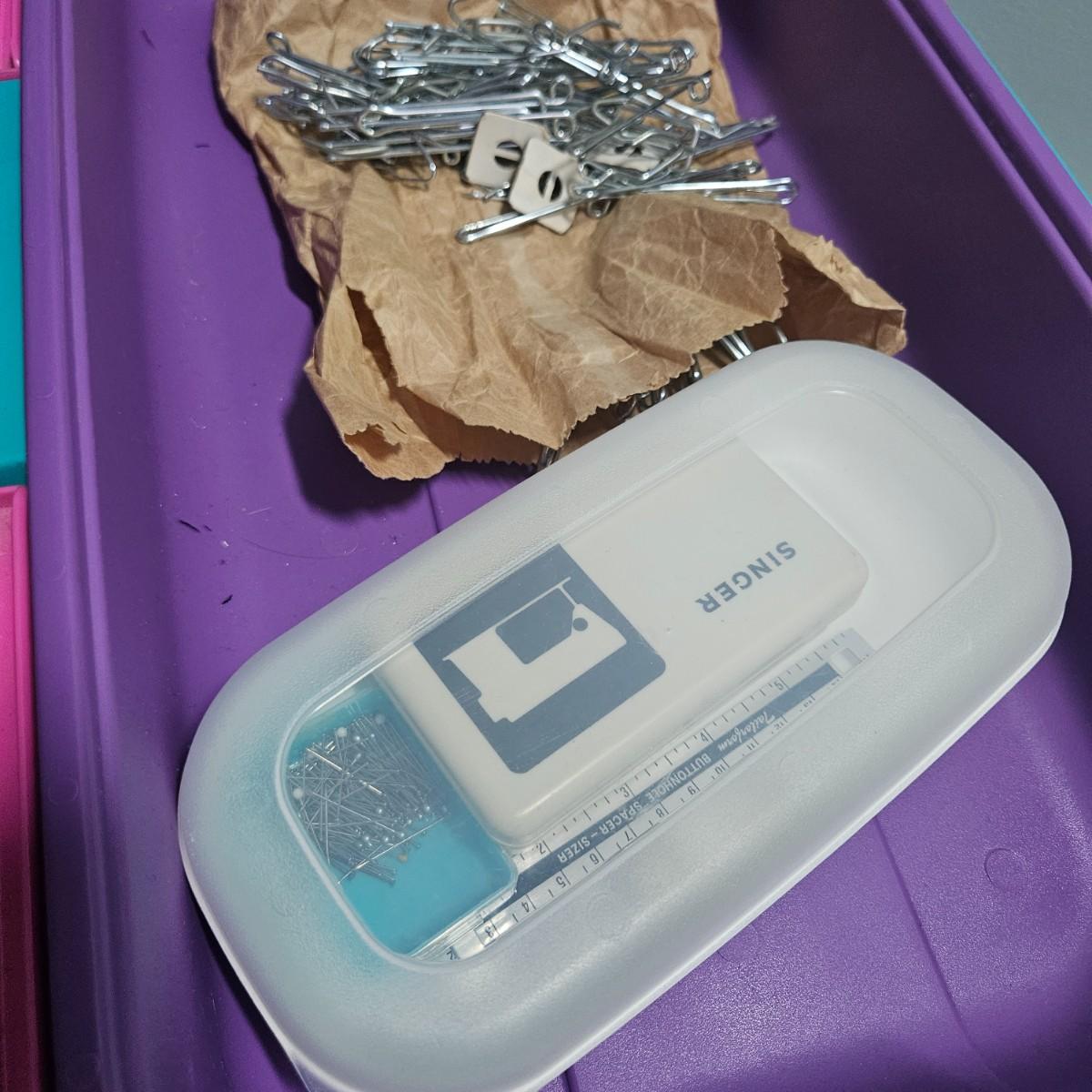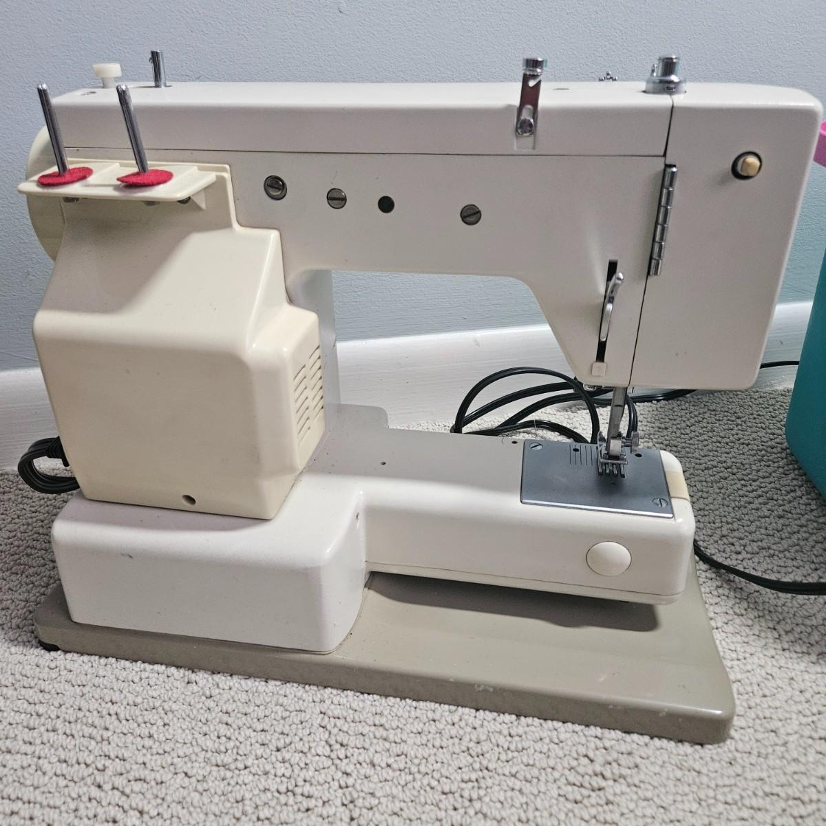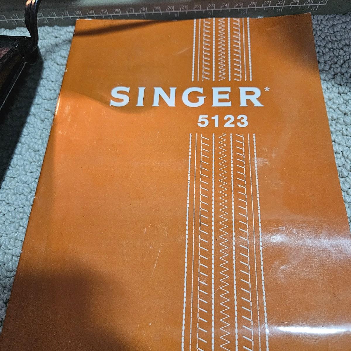 A Singer 5123 sewing machine that powered on, but the sewing needle did not move. This machine includes a storage case and measures approximately 15" x 7" x 12 5"H. Included in this lot is a sewing kaboodle with an assortment of containers, threads and other sewing supplies. Local pickup only