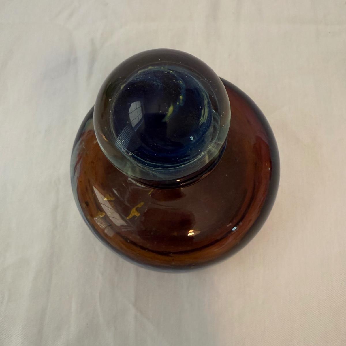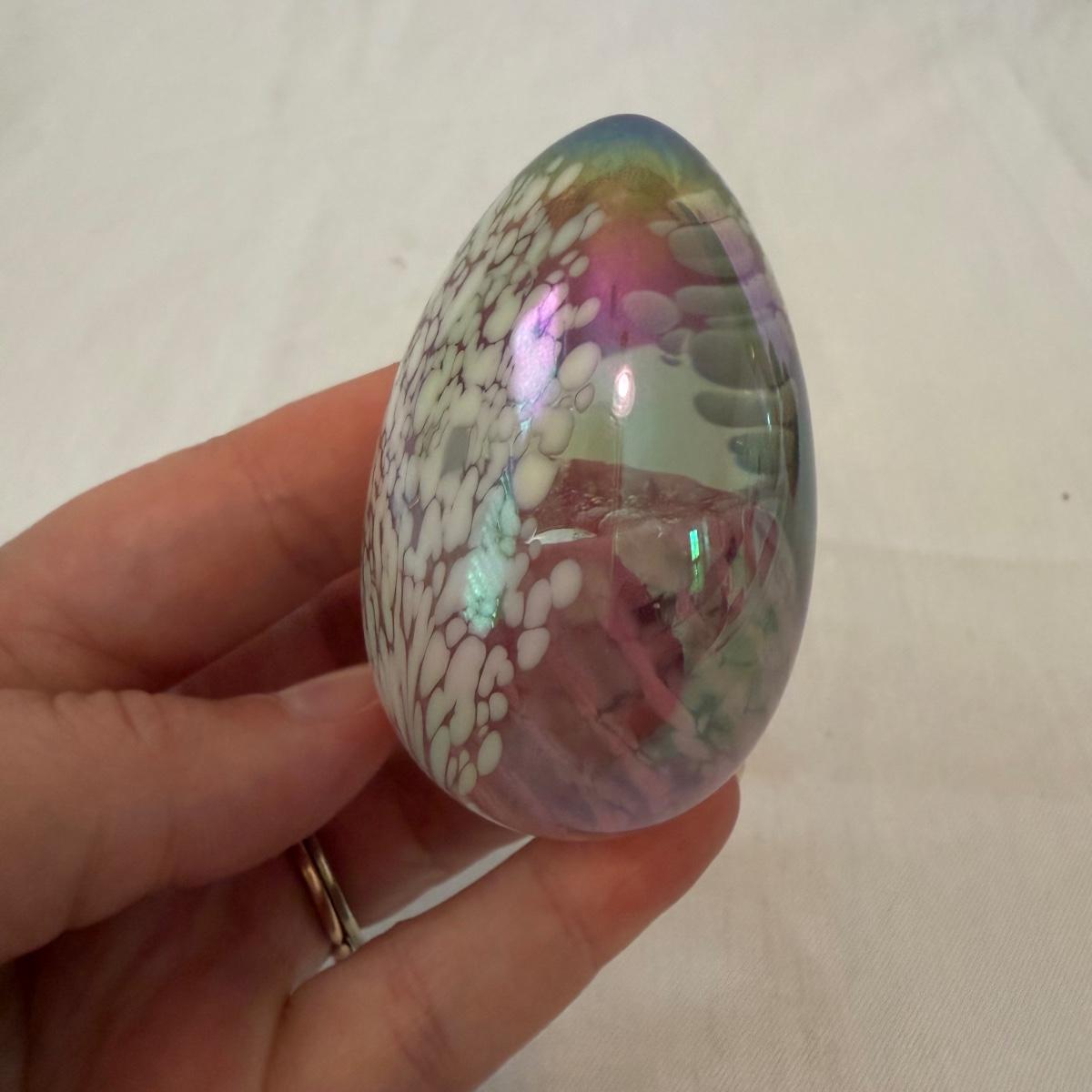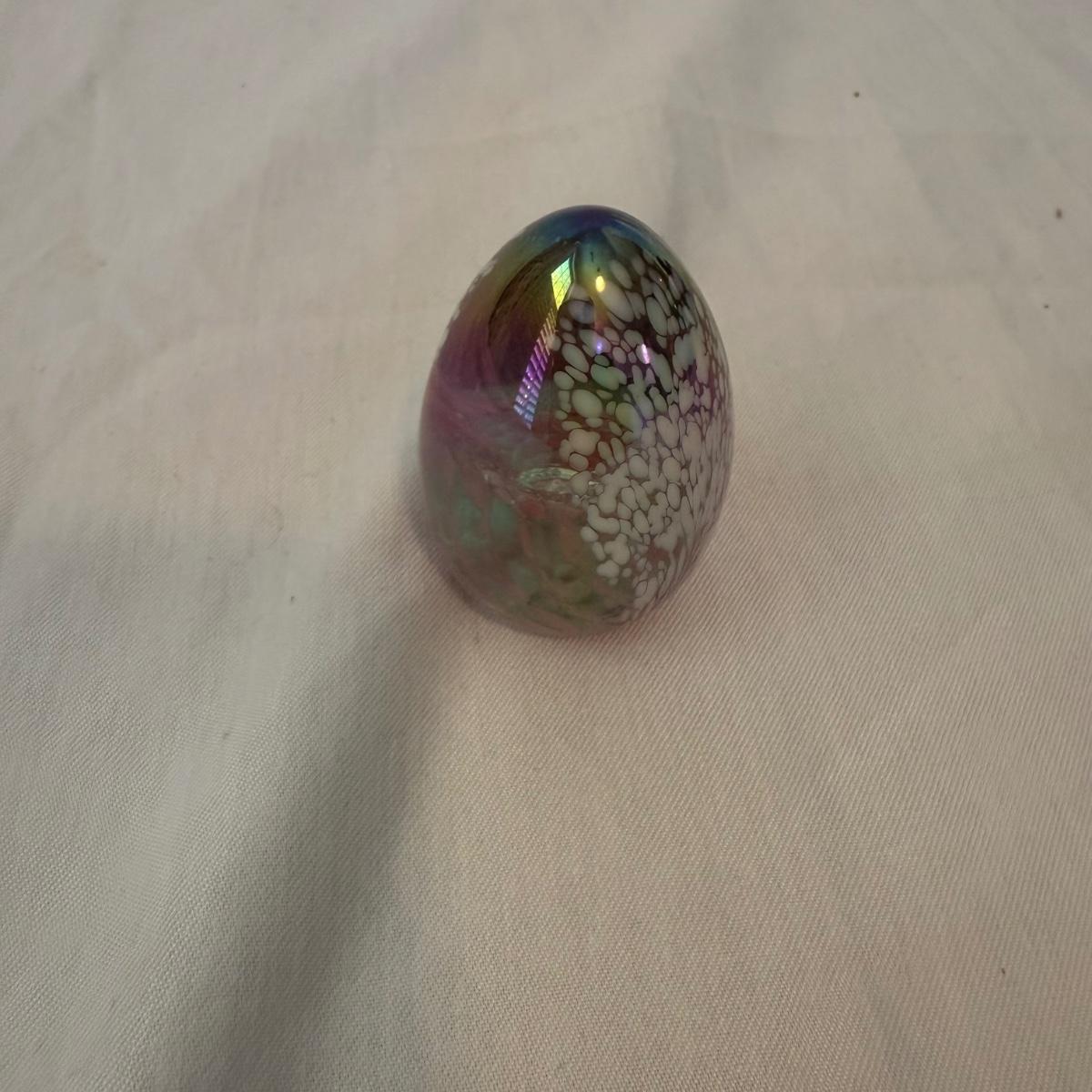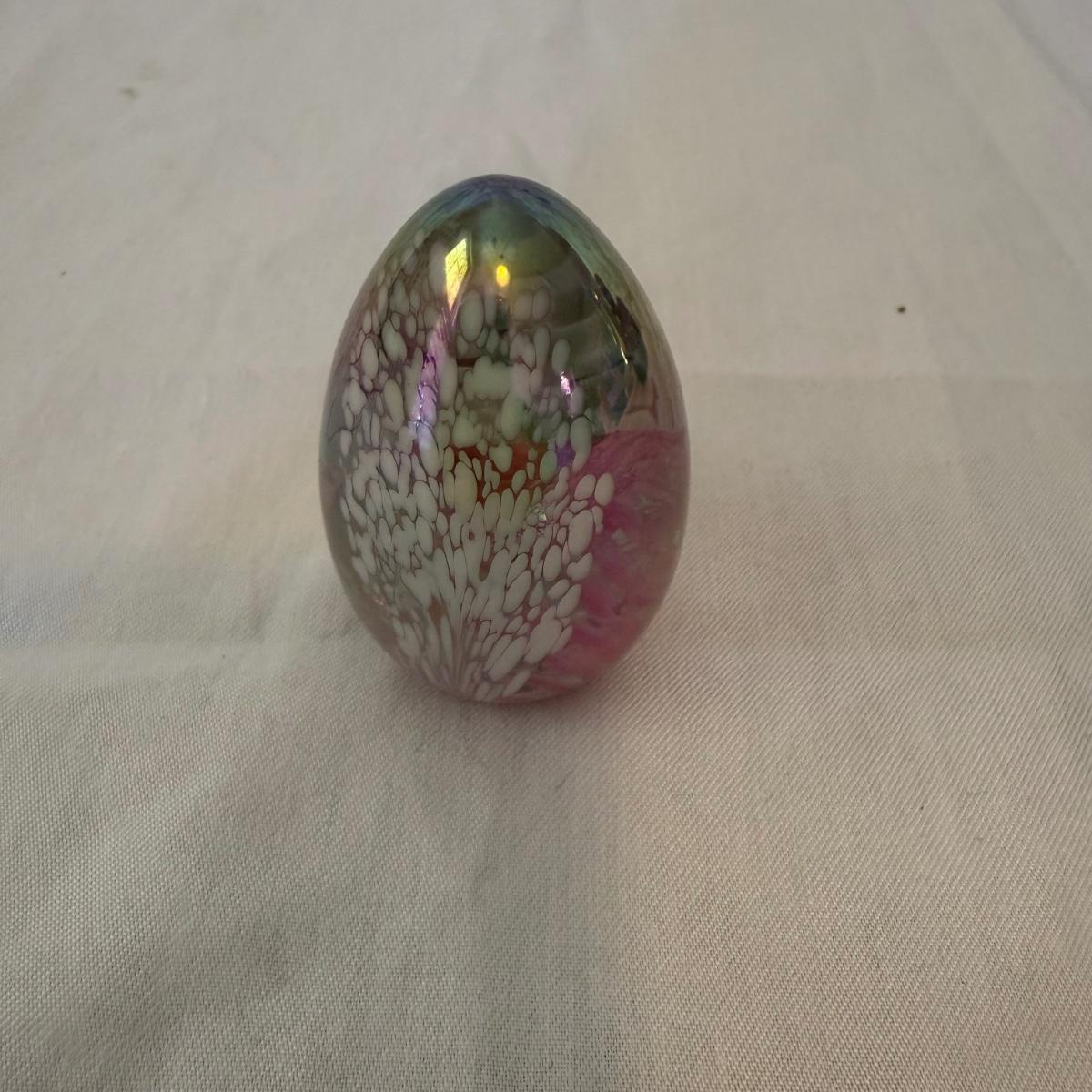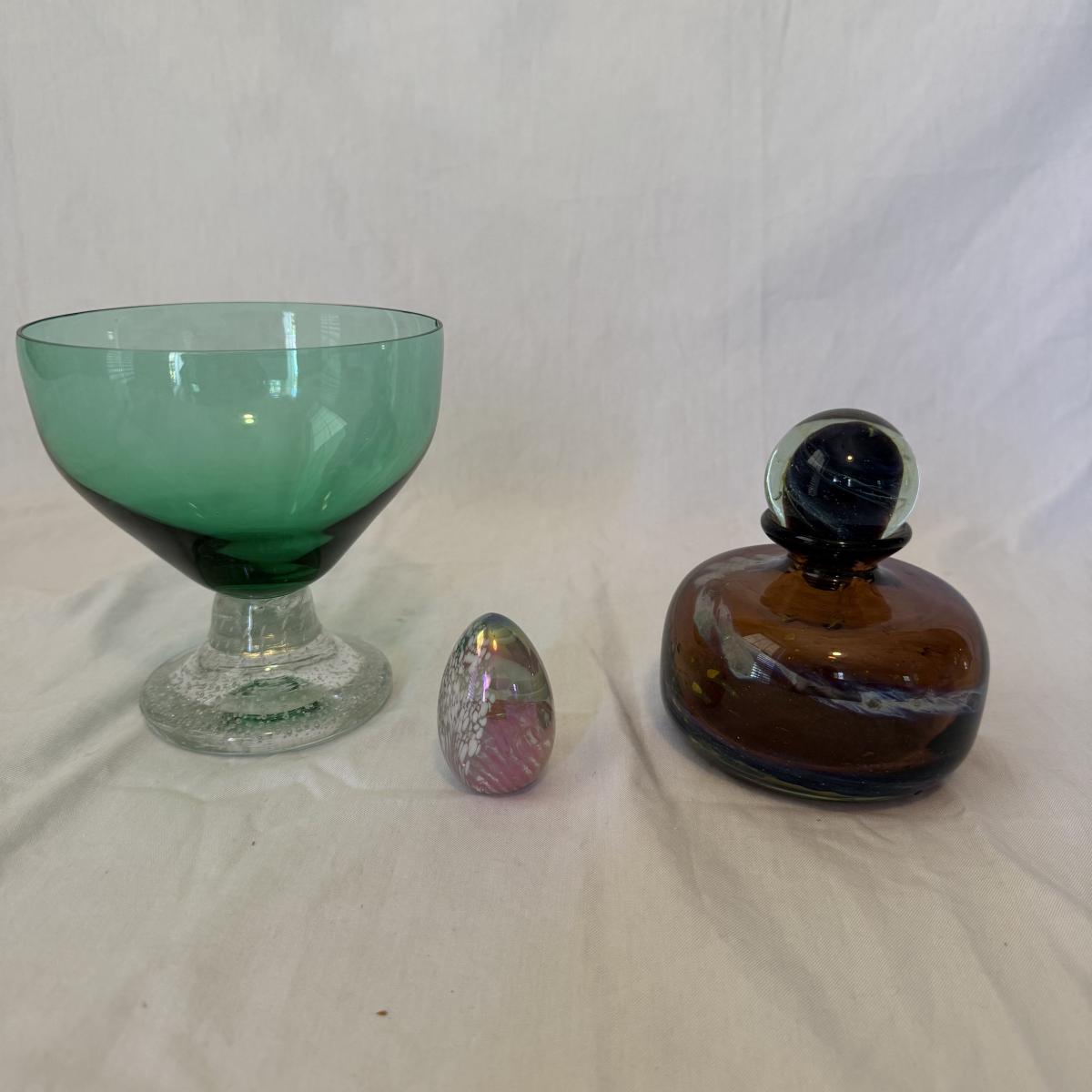This lot contains three fine glass items. The first is a Mdina “Tortoiseshell” brown glass decorative bottle with ball stopper. This piece 4”D x 5”H and is signed “Mdina” on the bottom. Next is a pretty green bowl with a clear bubble base. There’s a small chip and this piece is not singed. Last is a pretty iridescent pink egg with white speckles. This egg measures 1.5” x 2.25”H and is signed “MSU ‘86” on the bottom. Shipping available.
