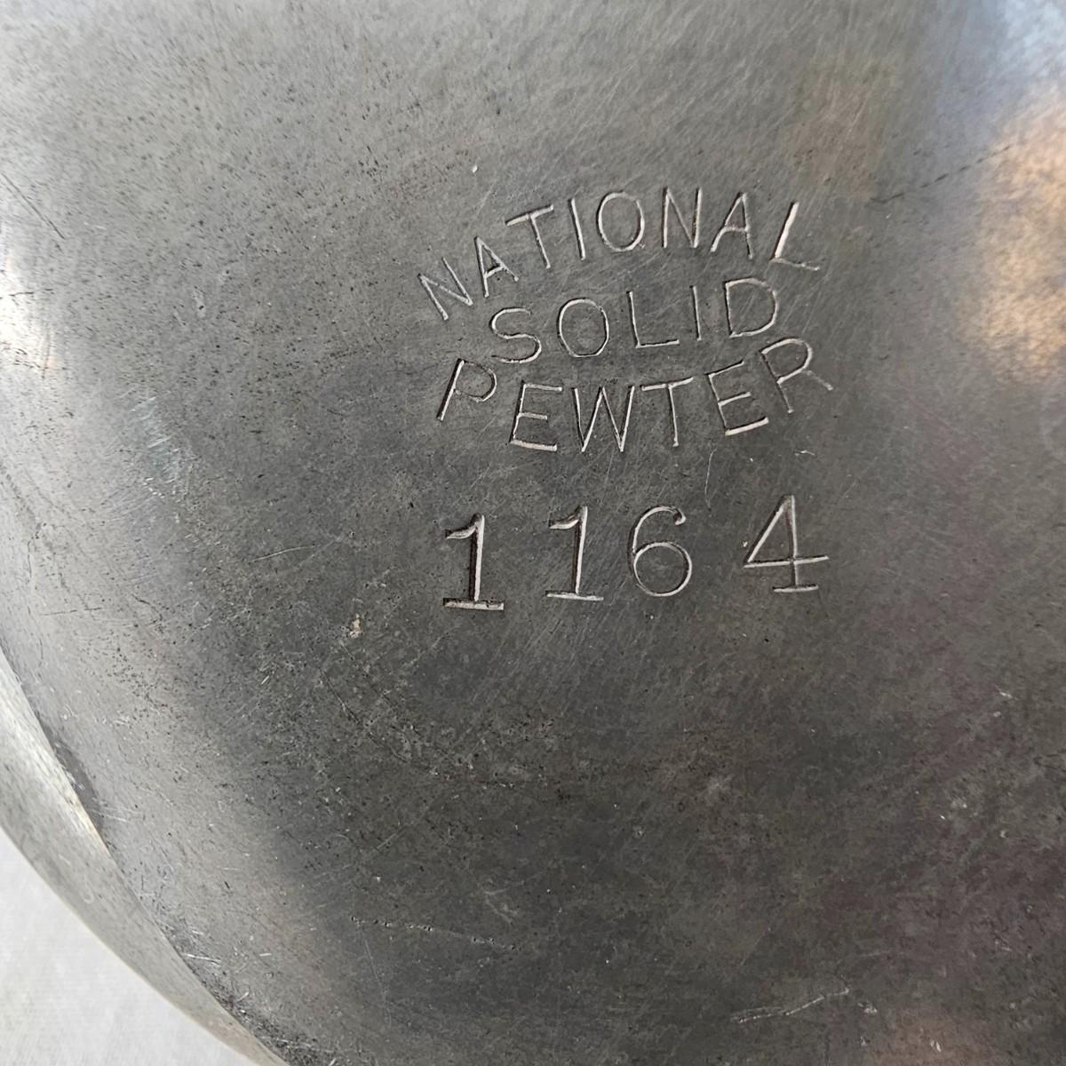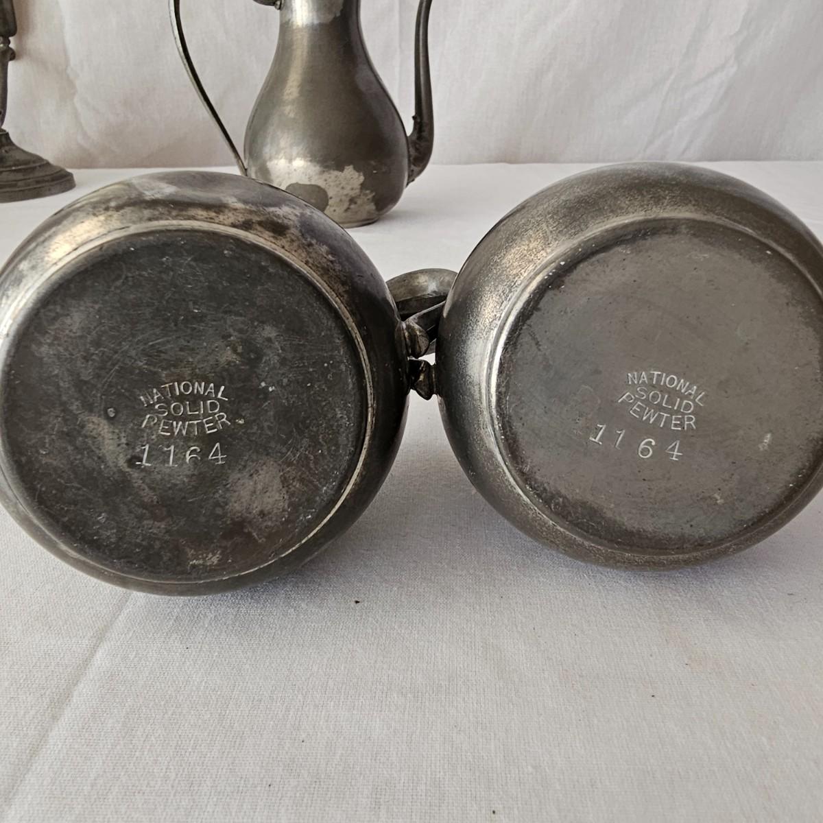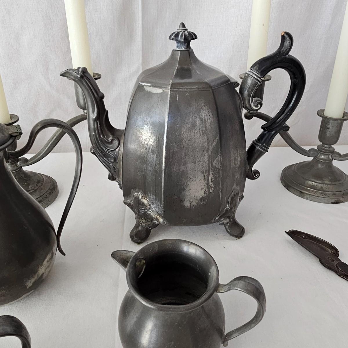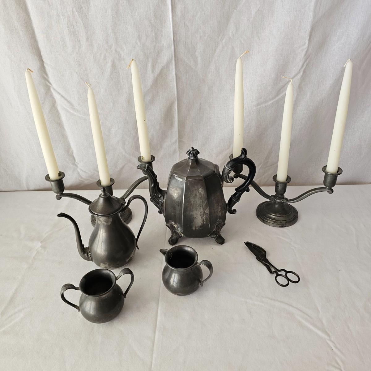 Vintage pewter items for a table setting. Three holder candlesticks by Old Glory, 9.5" x 4" x 6"H and six new white tapers. One large pitcher/teapot by Smith & Feltman, 10" x 6" x 8.5"H. Note insidecindicates lineage around 1850, but cannot be verified. Small teapot, cream and sugar bowls by National Pewter, all stamped solid pewter. Finally, one pewter wick cutting scissors. As with all older pewter there is some tarnish and discoloration. See photos for details. Shipping available.