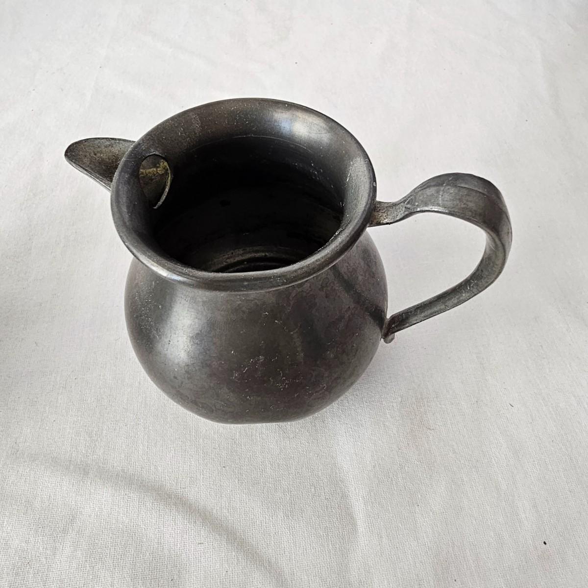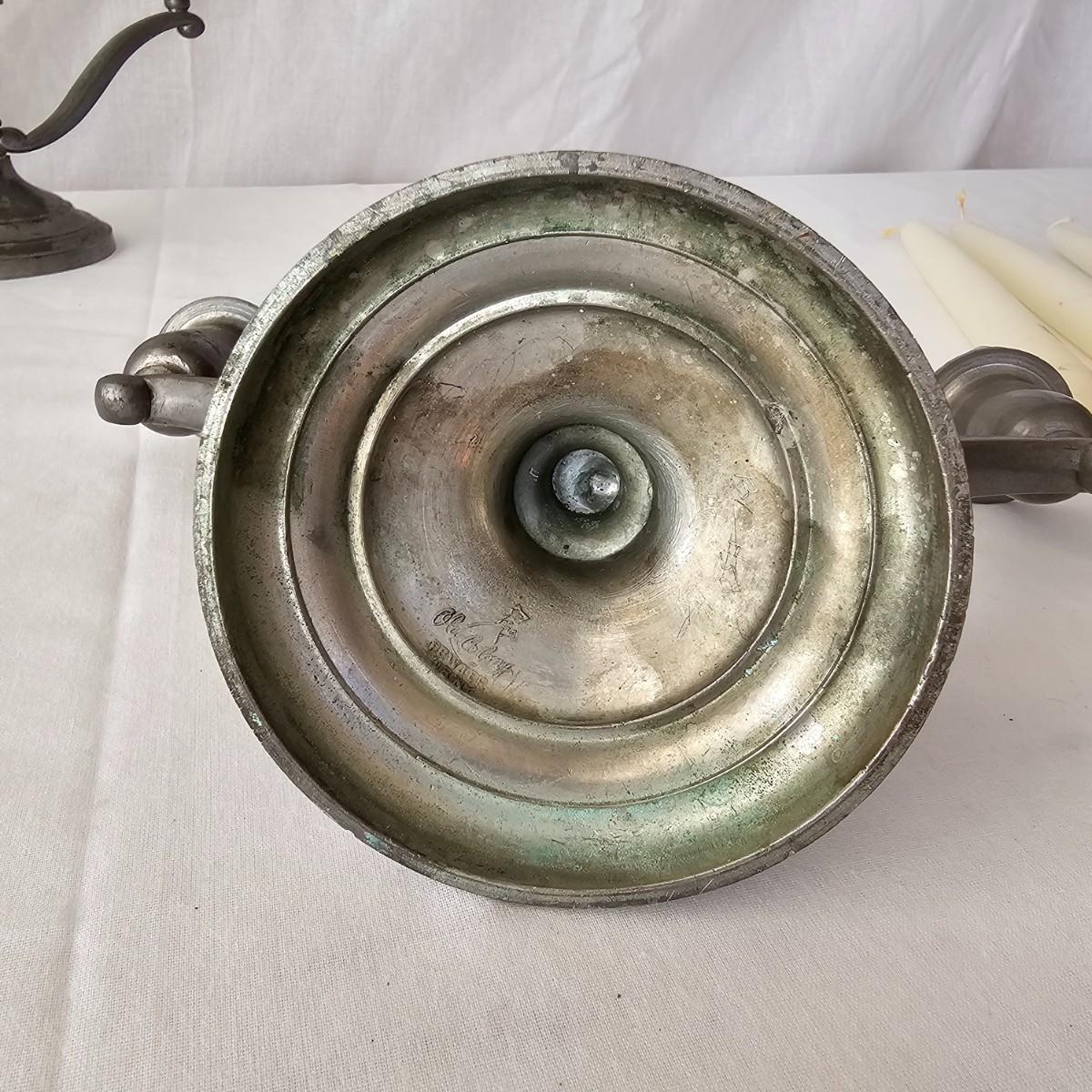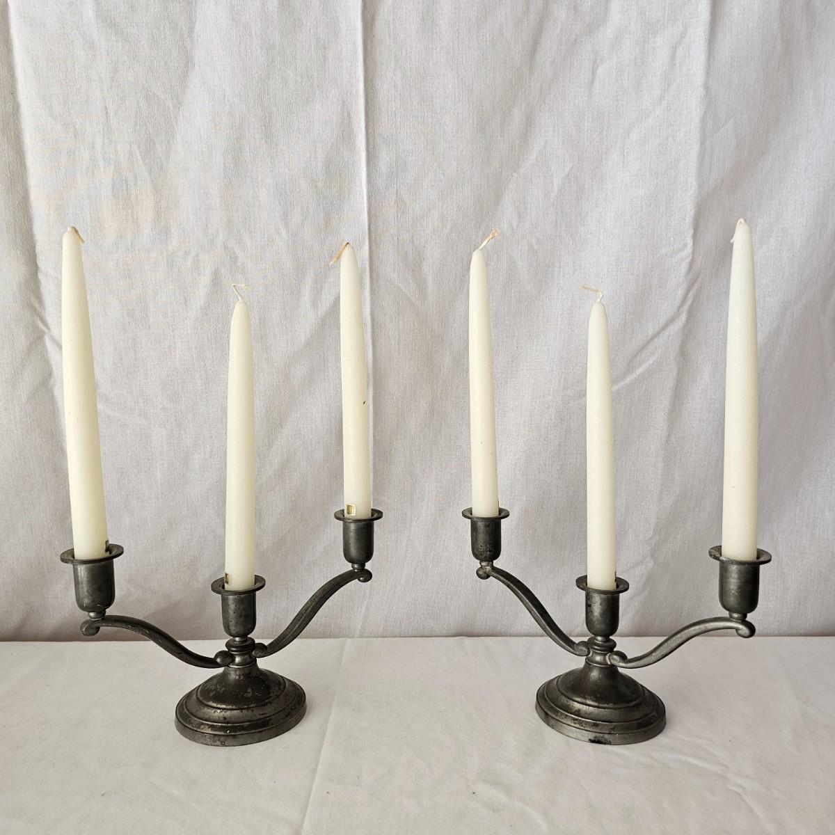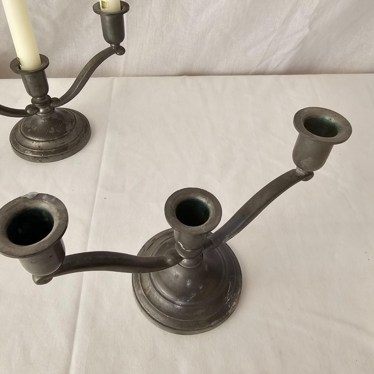 Vintage pewter items for a table setting. Three holder candlesticks by Old Glory, 9.5" x 4" x 6"H and six new white tapers. One large pitcher/teapot by Smith & Feltman, 10" x 6" x 8.5"H. Note insidecindicates lineage around 1850, but cannot be verified. Small teapot, cream and sugar bowls by National Pewter, all stamped solid pewter. Finally, one pewter wick cutting scissors. As with all older pewter there is some tarnish and discoloration. See photos for details. Shipping available.