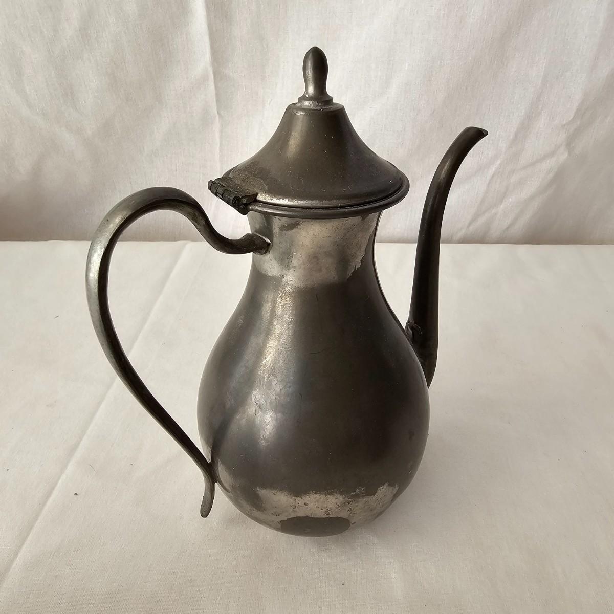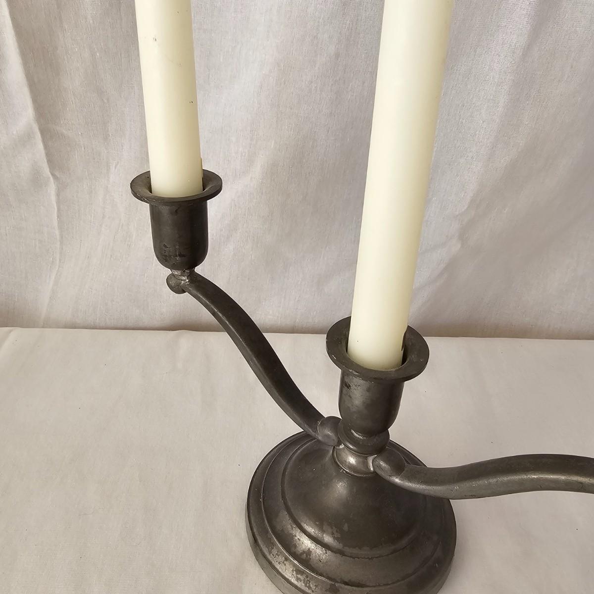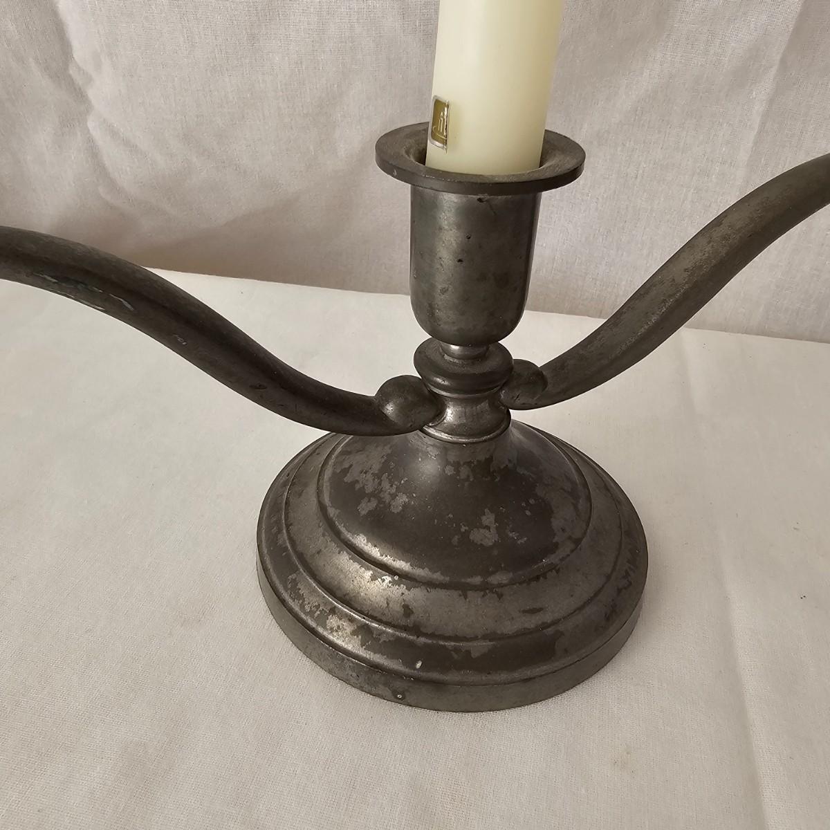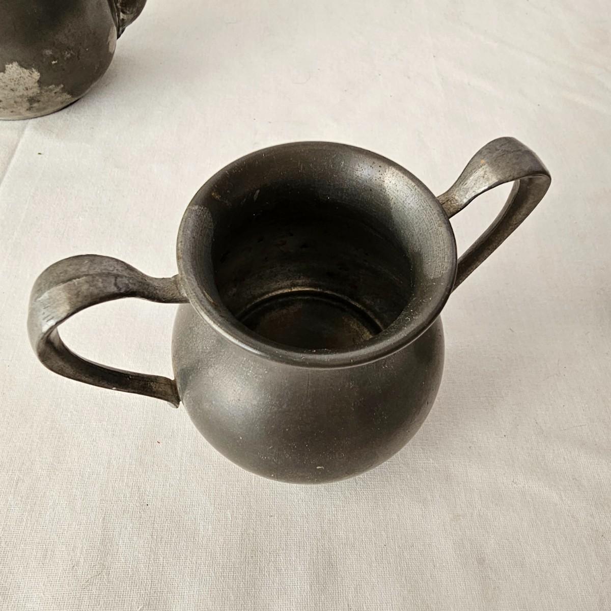 Vintage pewter items for a table setting. Three holder candlesticks by Old Glory, 9.5" x 4" x 6"H and six new white tapers. One large pitcher/teapot by Smith & Feltman, 10" x 6" x 8.5"H. Note insidecindicates lineage around 1850, but cannot be verified. Small teapot, cream and sugar bowls by National Pewter, all stamped solid pewter. Finally, one pewter wick cutting scissors. As with all older pewter there is some tarnish and discoloration. See photos for details. Shipping available.