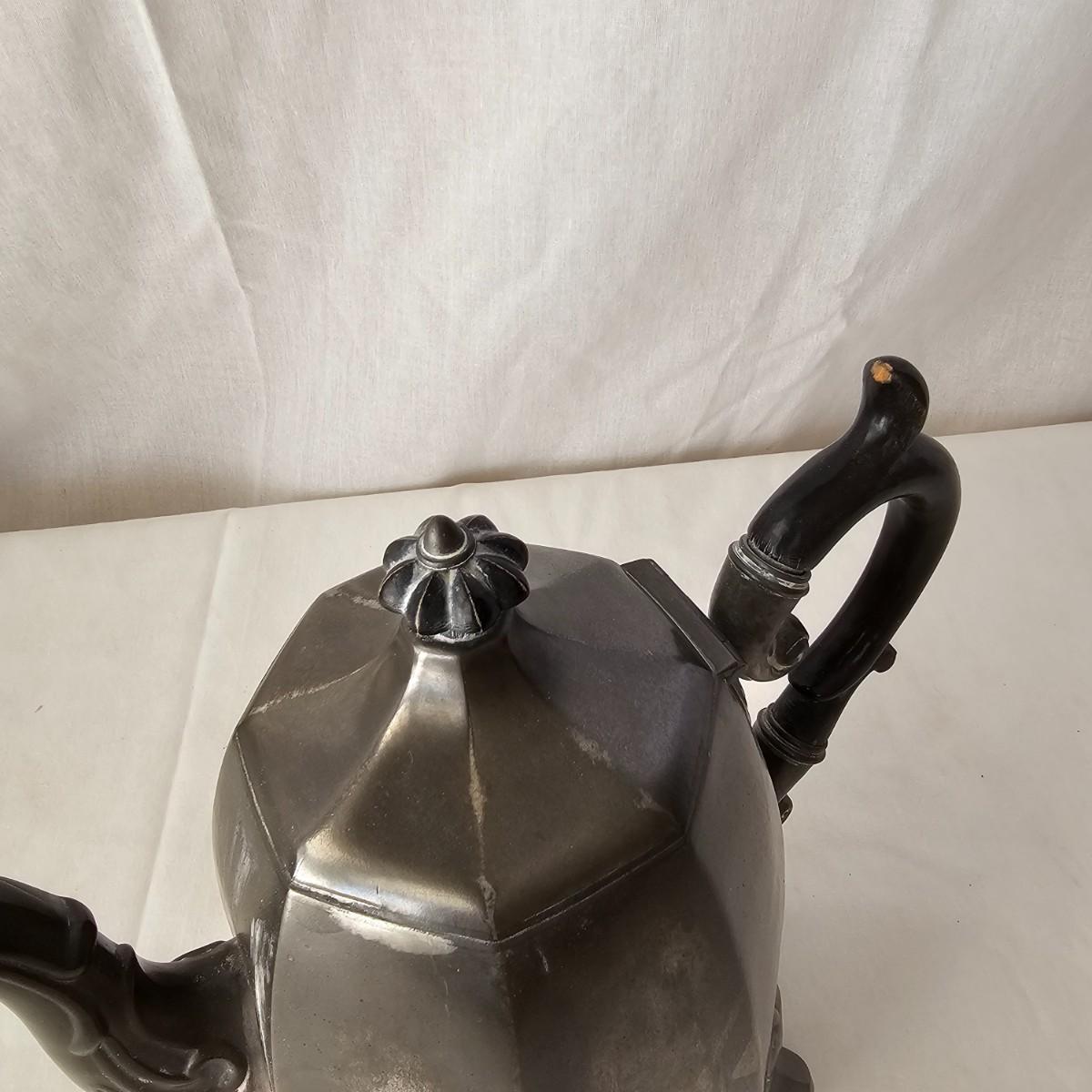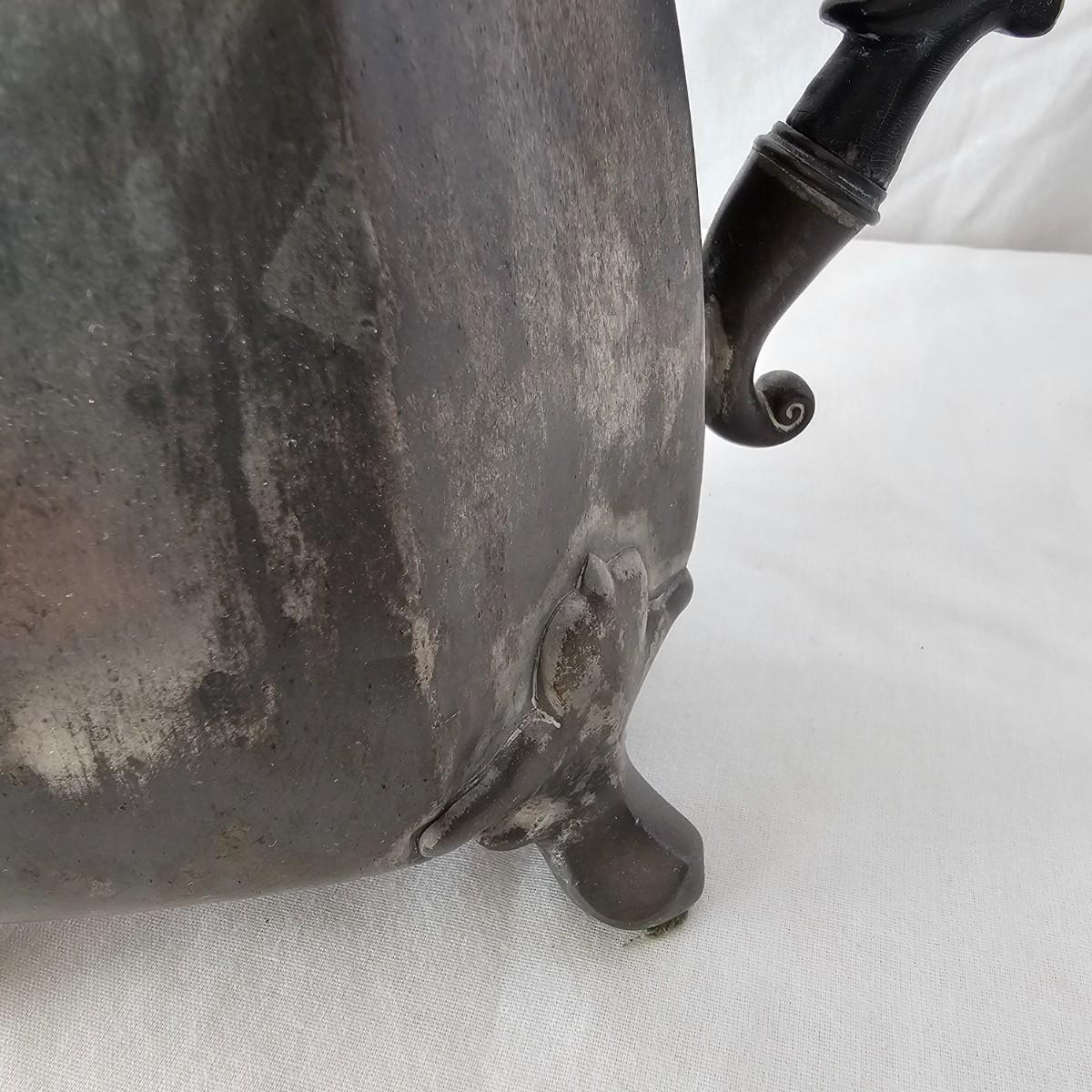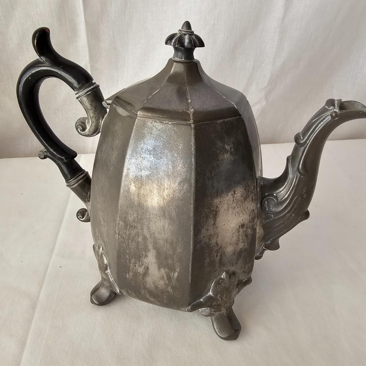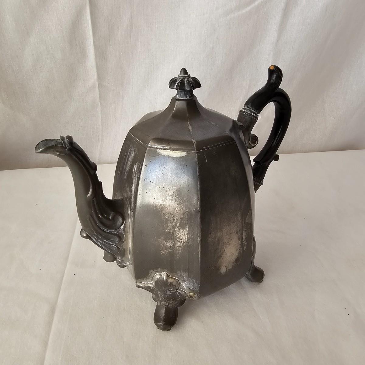 Vintage pewter items for a table setting. Three holder candlesticks by Old Glory, 9.5" x 4" x 6"H and six new white tapers. One large pitcher/teapot by Smith & Feltman, 10" x 6" x 8.5"H. Note insidecindicates lineage around 1850, but cannot be verified. Small teapot, cream and sugar bowls by National Pewter, all stamped solid pewter. Finally, one pewter wick cutting scissors. As with all older pewter there is some tarnish and discoloration. See photos for details. Shipping available.