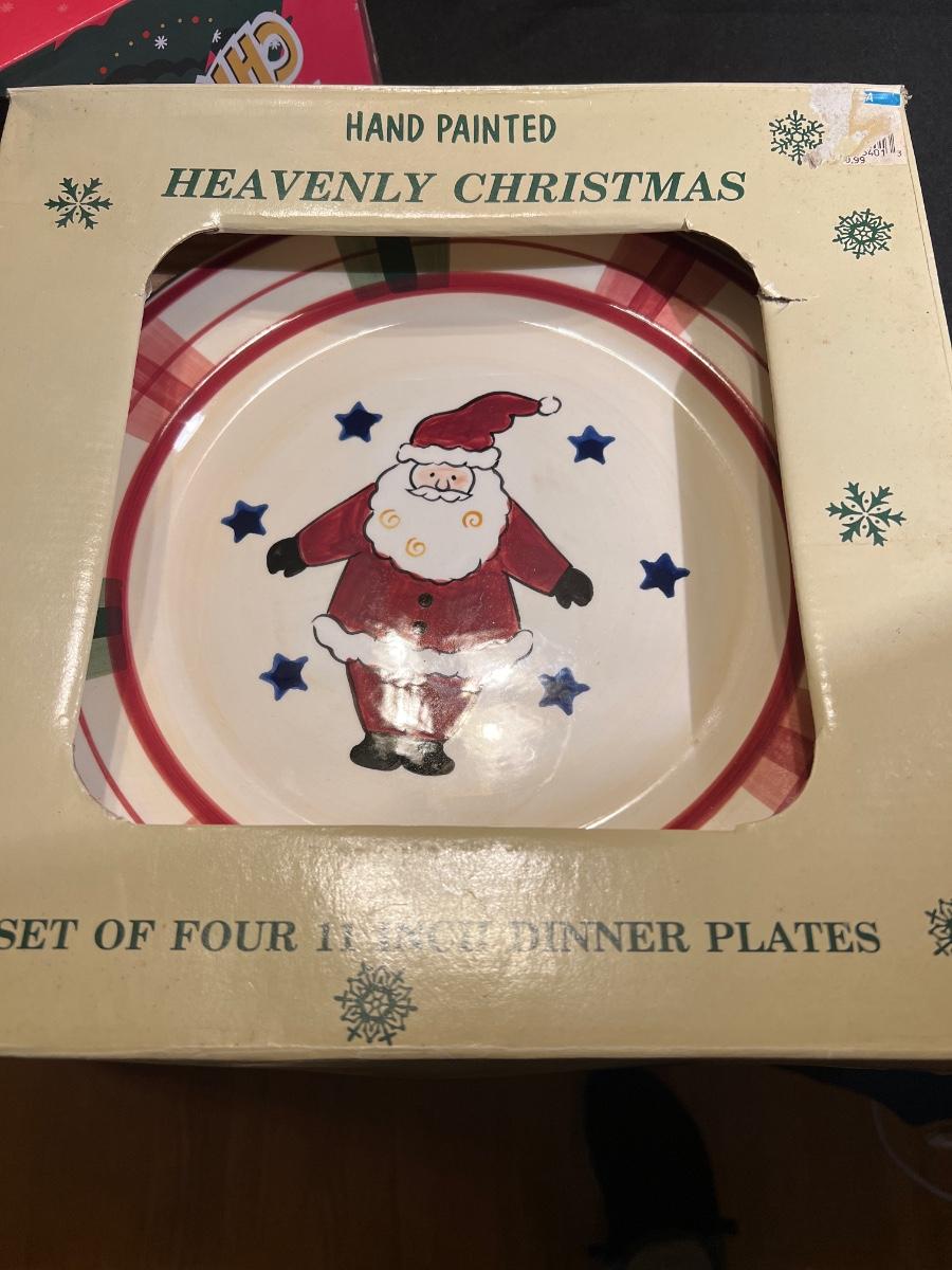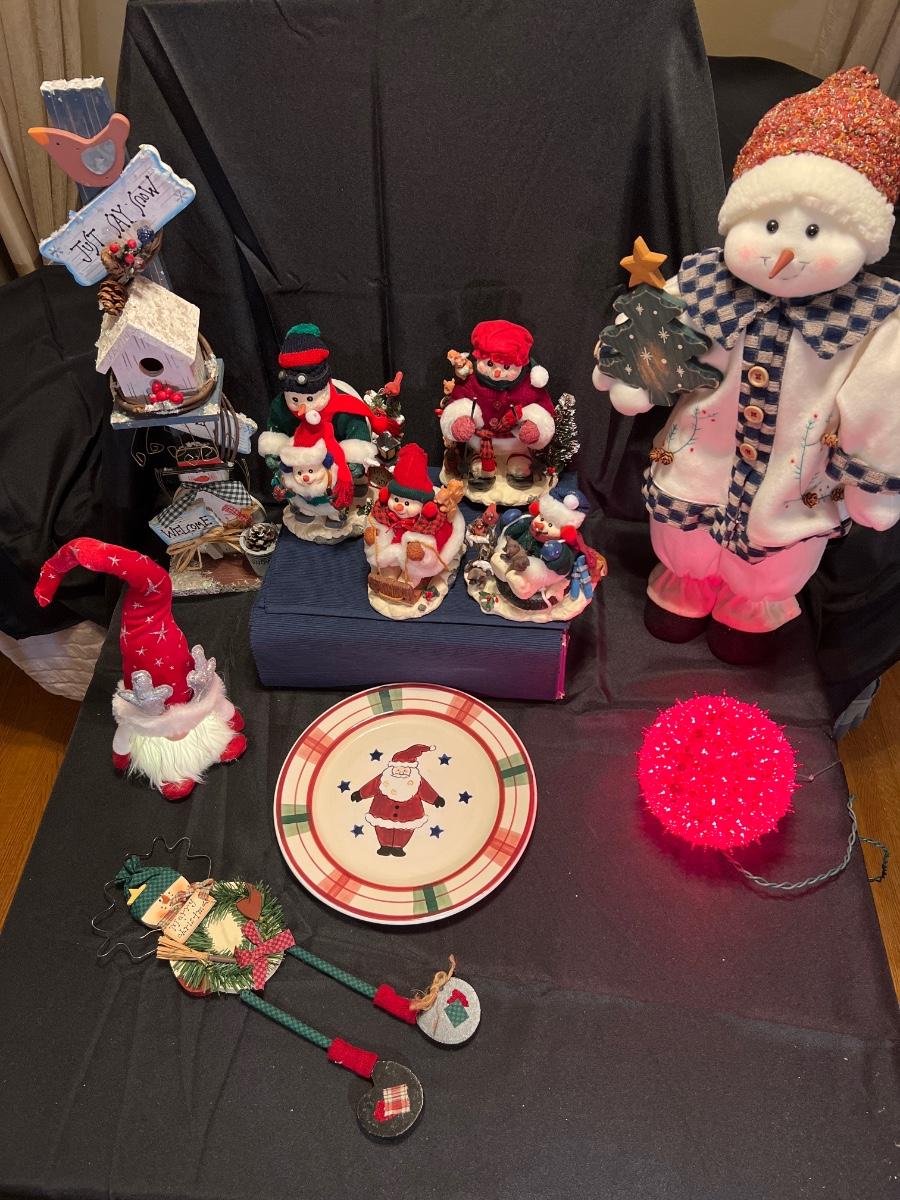 Set of 20 Santa plates, hanging light up sphere, and lots of snowmen!