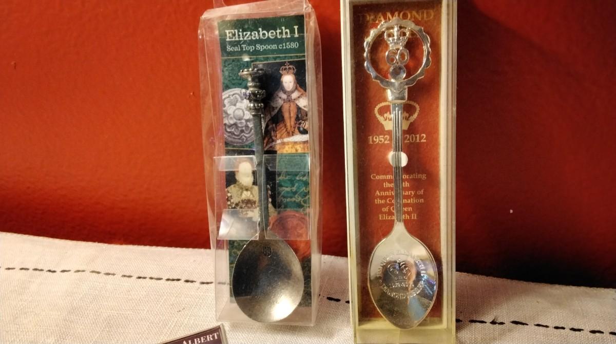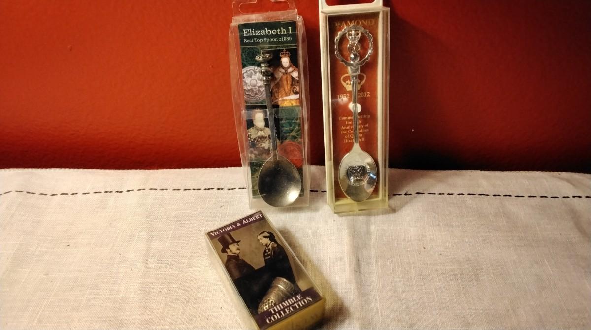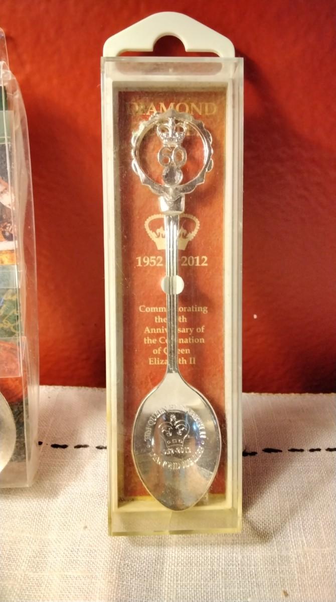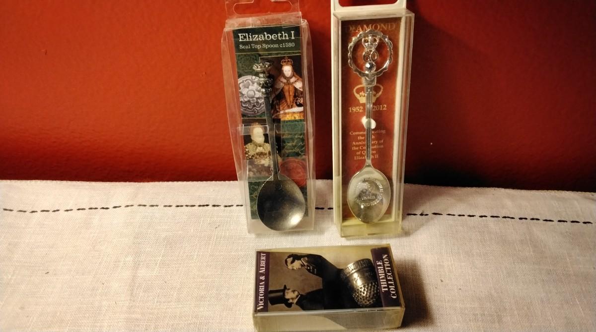 Elizabeth `1 Pewter Spoon, 60 Anniversary of Coronation of Queen Elizabeth Silver Plated Spoon and Pewter Thimble of Victoria & Albert. All from England. New in box
