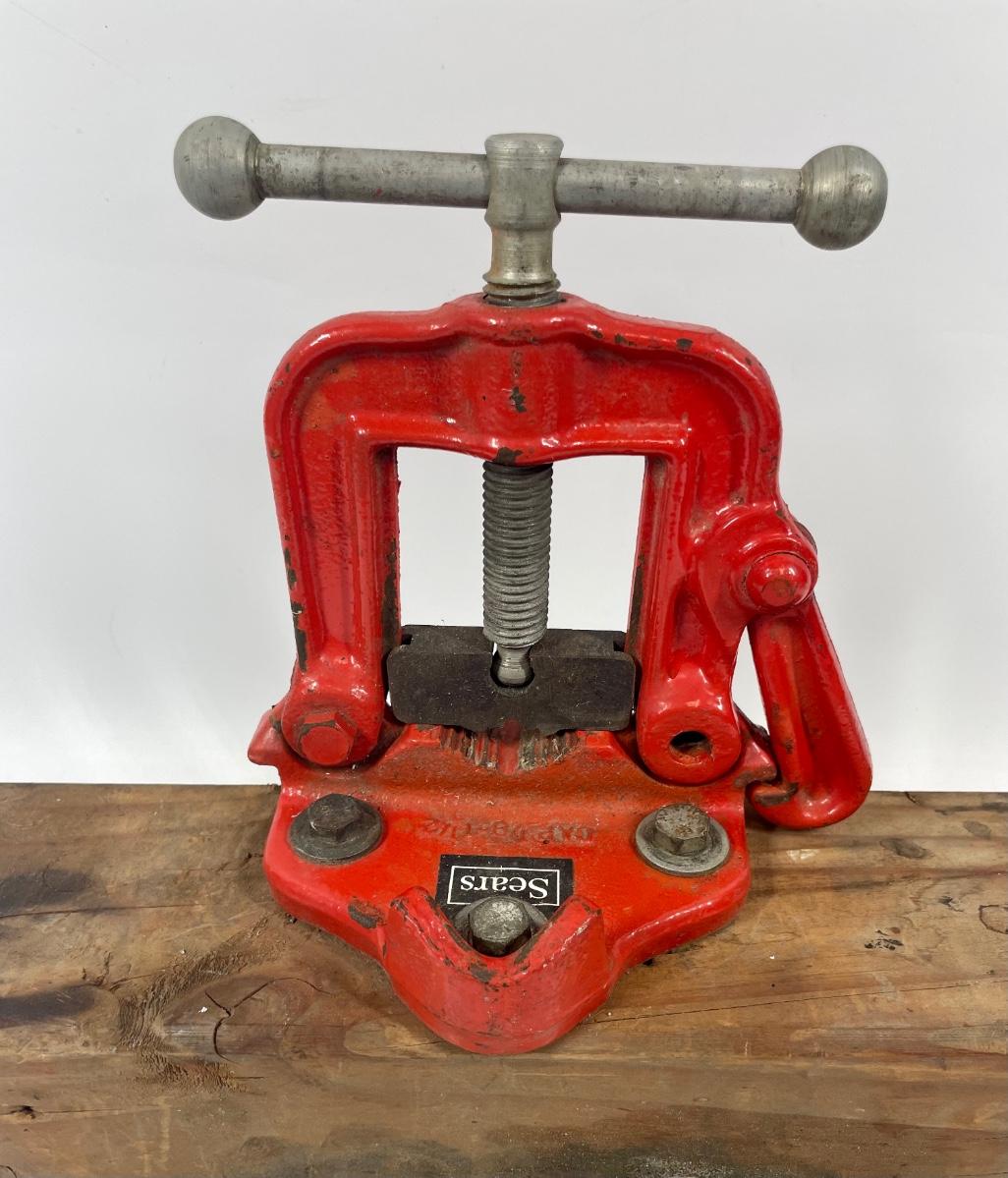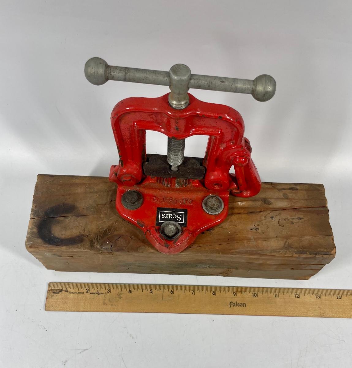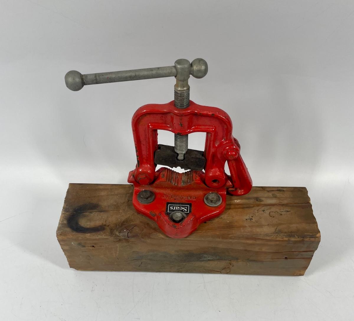 Sears Industrial Pipe Vise. Handles pipes between 1/8" to 1-1/2" diameter. Mounted on a 4' x 4' wood base.