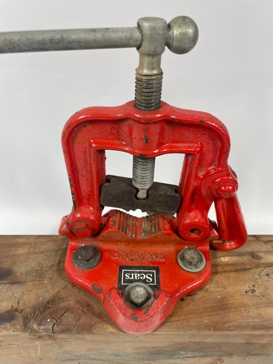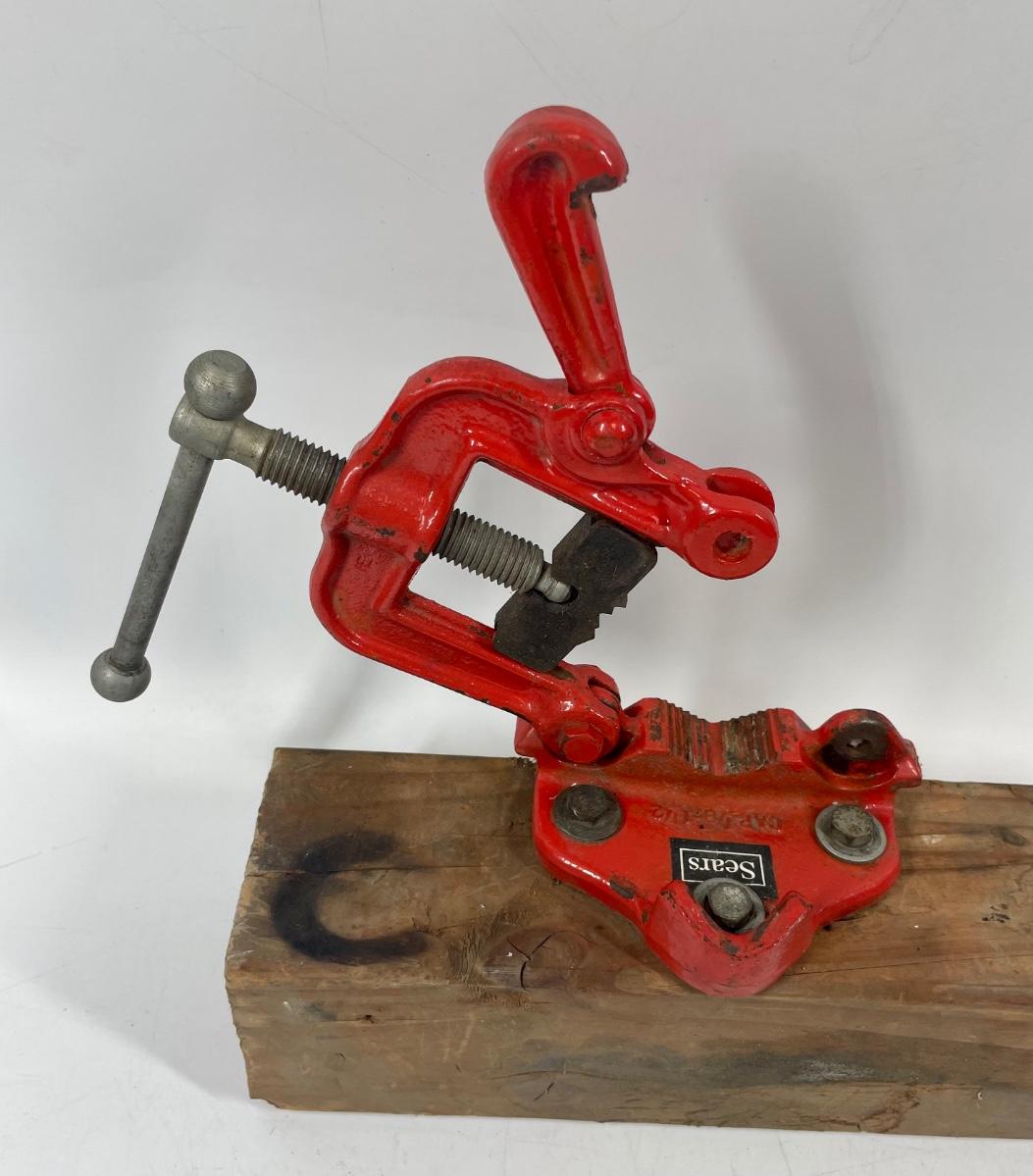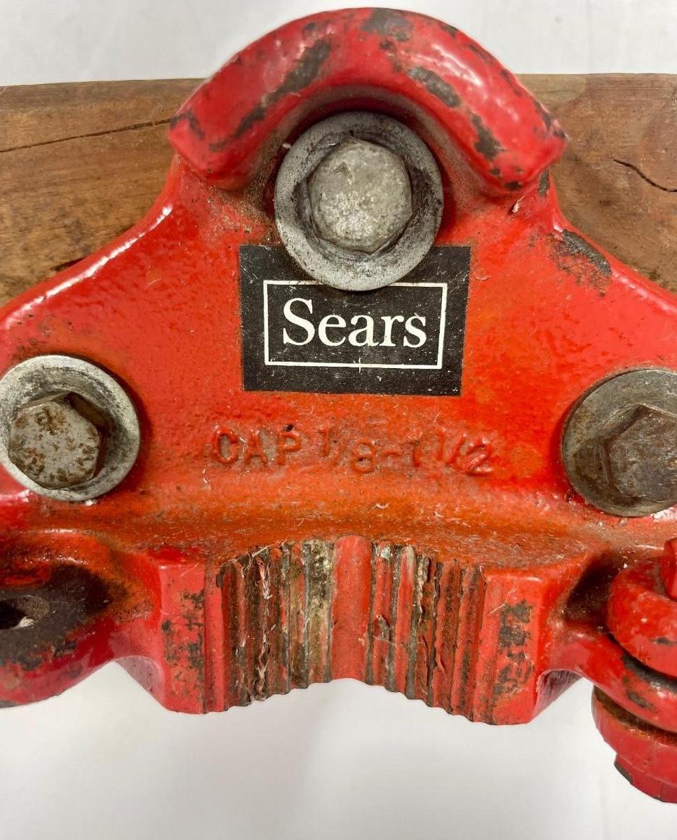 Sears Industrial Pipe Vise. Handles pipes between 1/8" to 1-1/2" diameter. Mounted on a 4' x 4' wood base.