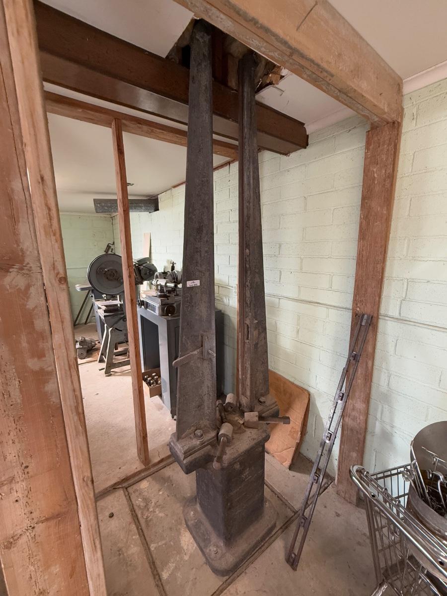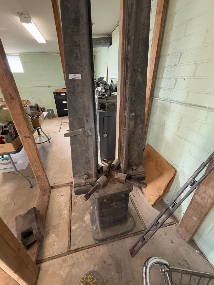 Huge steel tool that is bolted to the floor with separate drop weight also but no pulley system. Weight is unknown but probably over 1000 lbs. Stands approximately. 7 feet tall higher than ceiling. Will need to be disassembled. I would definitely recommend previewing auction if you plan on bidding on this item to figure out moving logistics. Will need extra moving help and to schedule pickup time & day on this one. Will need tools to probably take apart & unbolt it.