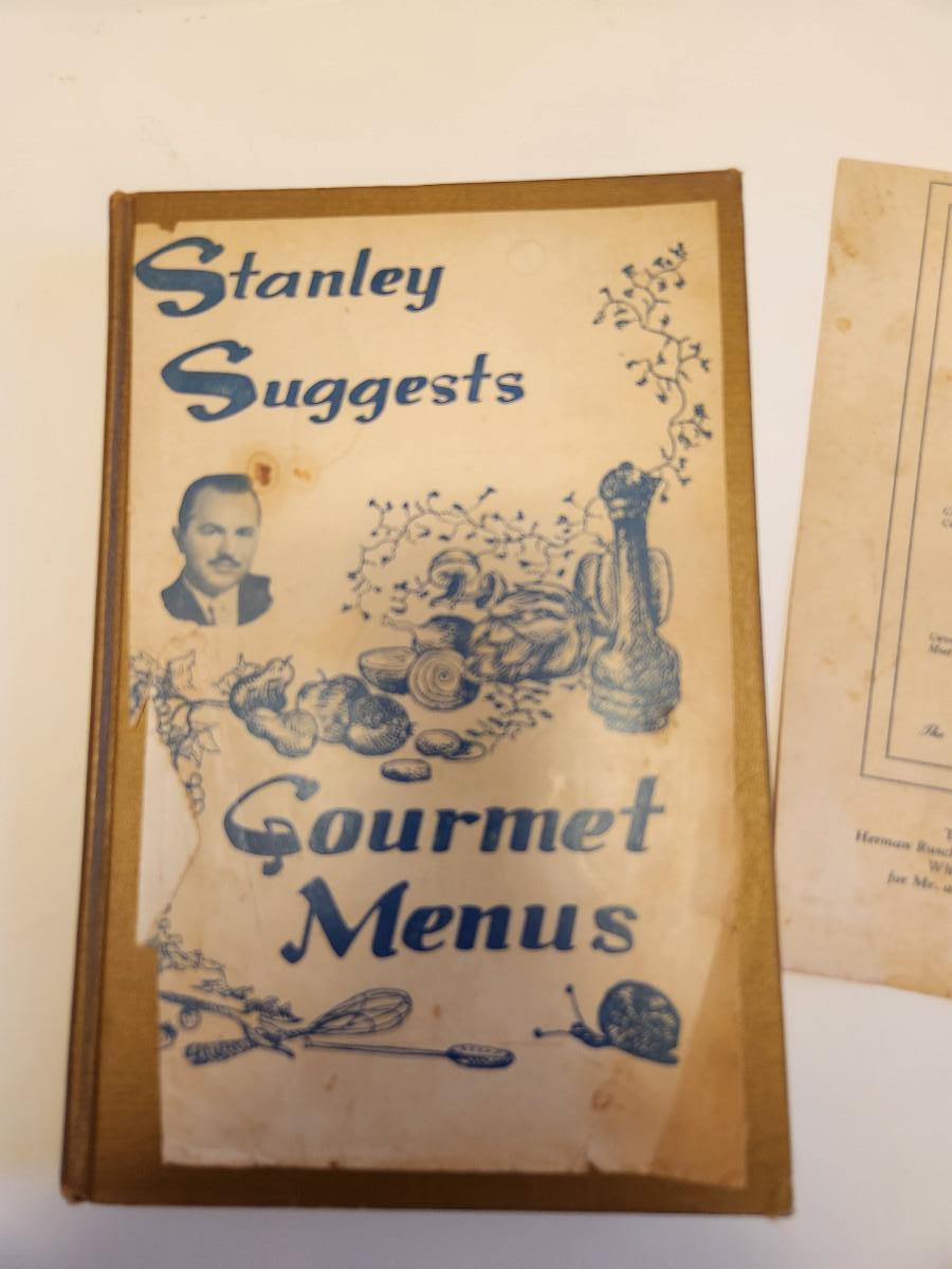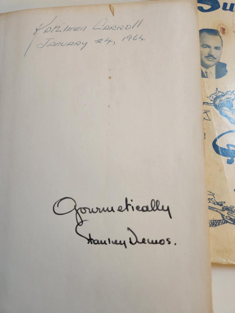 This auction lot is for a well-loved copy of the cookbook Stanley Suggests Gourmet Menus by Stanley Demos - Autographed by the author. According to a newspaper article in the Lexington Herald-Leader - "Stanley Demos’ Coach House has been called the grandfather of gourmet fine dining in Lexington. For decades, beginning in 1969, there simply was no more elegant place to eat in Central Kentucky. Movers and shakers from the president of the University of Kentucky to millionaire horse breeders dined there for lunch and dinner, sometimes multiple times a week, in an atmosphere that resembled an exclusive club with fresh flowers, gilt-framed oil paintings, and crystal chandeliers." This book has been used but is still quite a find, the 175 pages are filled with recipes used in the restaurant and from his Cincinnati Enquirer newspaper column. The dust jacket is in pieces and the end papers of the book are filled with hand written recipes. Bon Appetit!