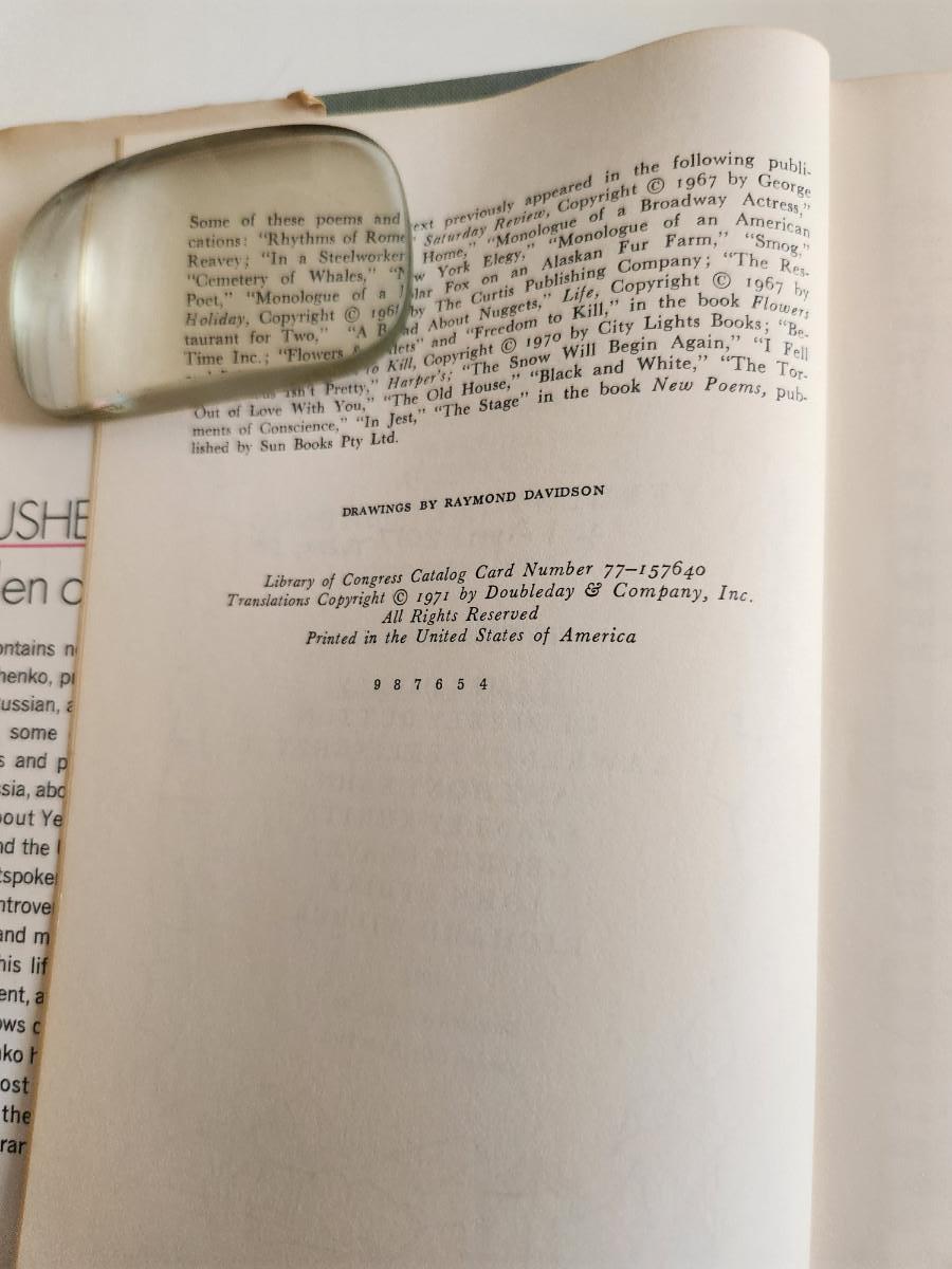 This auction lot is for a copy of the book Stolen Apples by Yevgeny Yevtushenko - Autographed by the author in 1972. This is a hardbound book with dustcover. Dustcover has some ruffling on the spine but over is OK. The book has 328 pages of work by the noted Russian Poet and Activist. Yevgeny Aleksandrovich Yevtushenko was a Soviet and Russian poet. He was also a novelist, essayist, dramatist, screenwriter, publisher, actor, editor, university professor, and director of several films This book was published by Doubleday in 1971, it is in good condition.