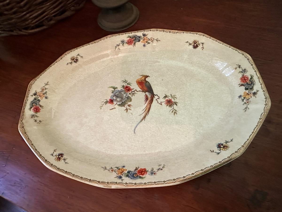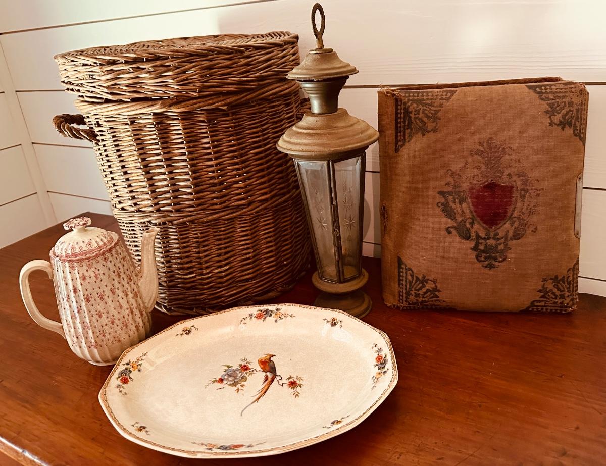 STRAW BASKET, PEACOCK PLATTER(SOVEREIGN), PITCHER(COPELAND SPODE ENGLAND), ANDTIQUE PHOTO ALBUM & CANDLE LIGHT