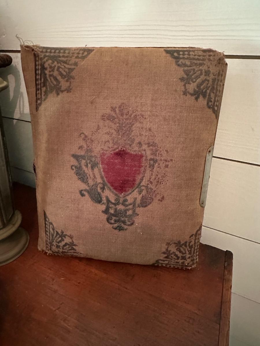 STRAW BASKET, PEACOCK PLATTER, PITCHER, ANDTIQUE PHOTO ALBUM & CANDLE LIGHT