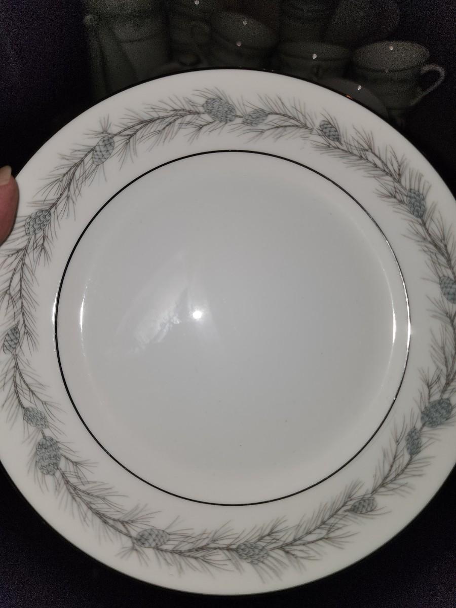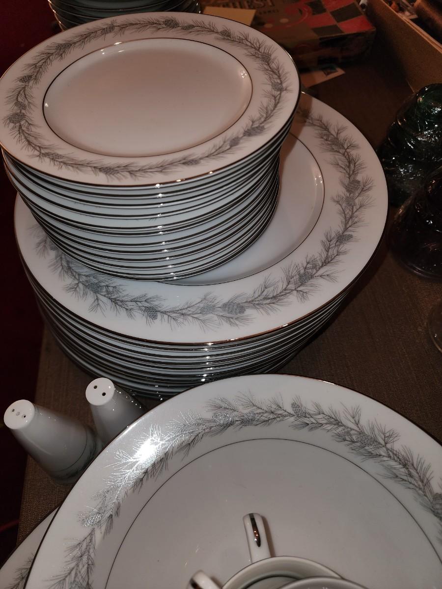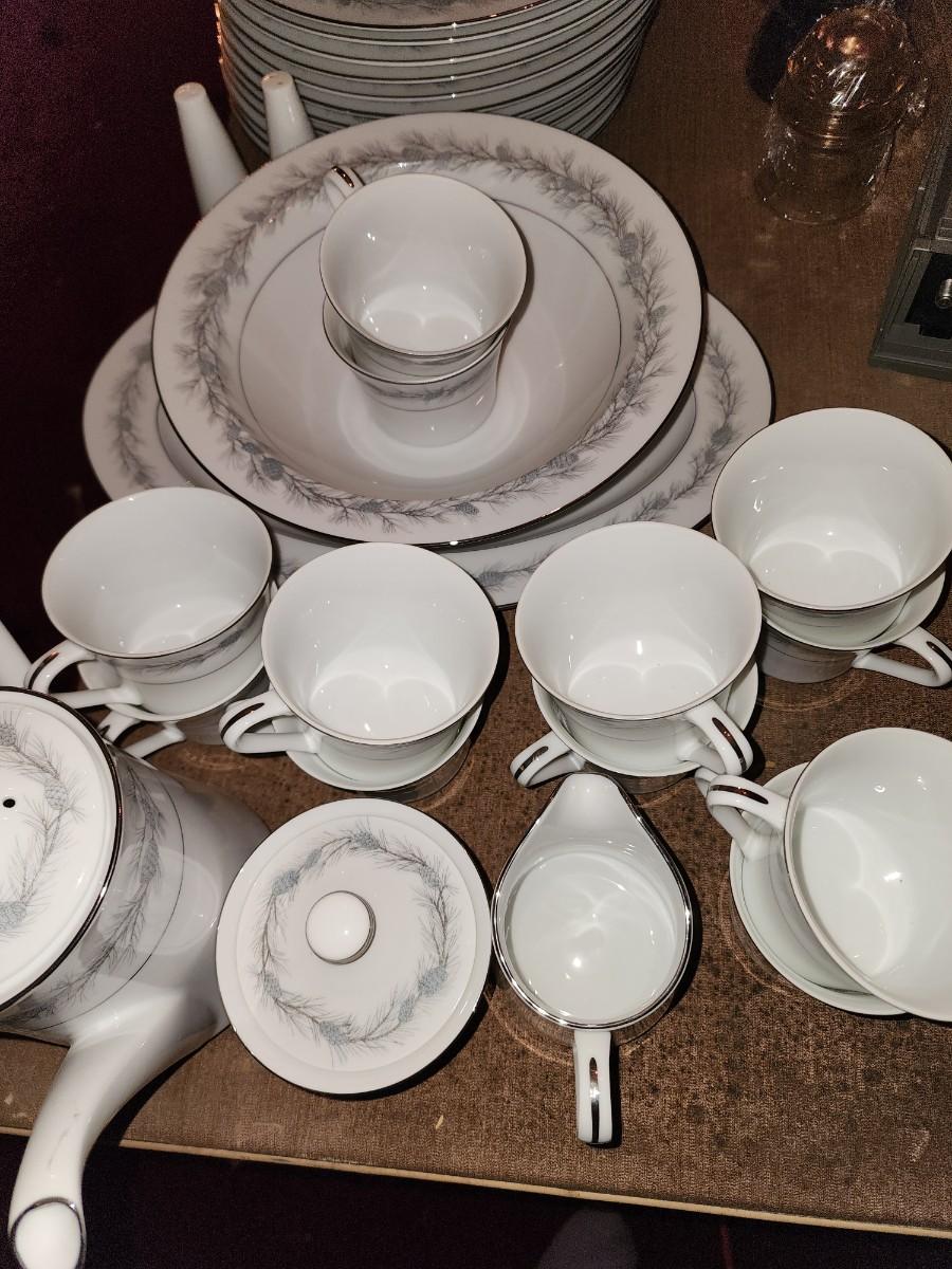 12 of each dinner plates, salad plates bowl, tea pot with cream and sugar. Salt and pepper set. Tea cups platter and serving bowl. Great set. Nice condition