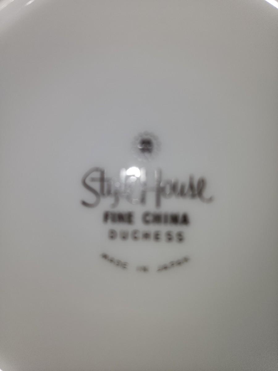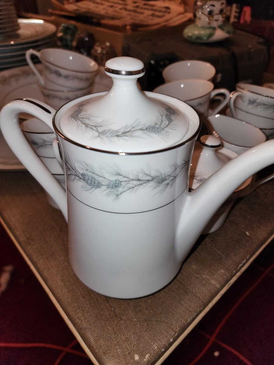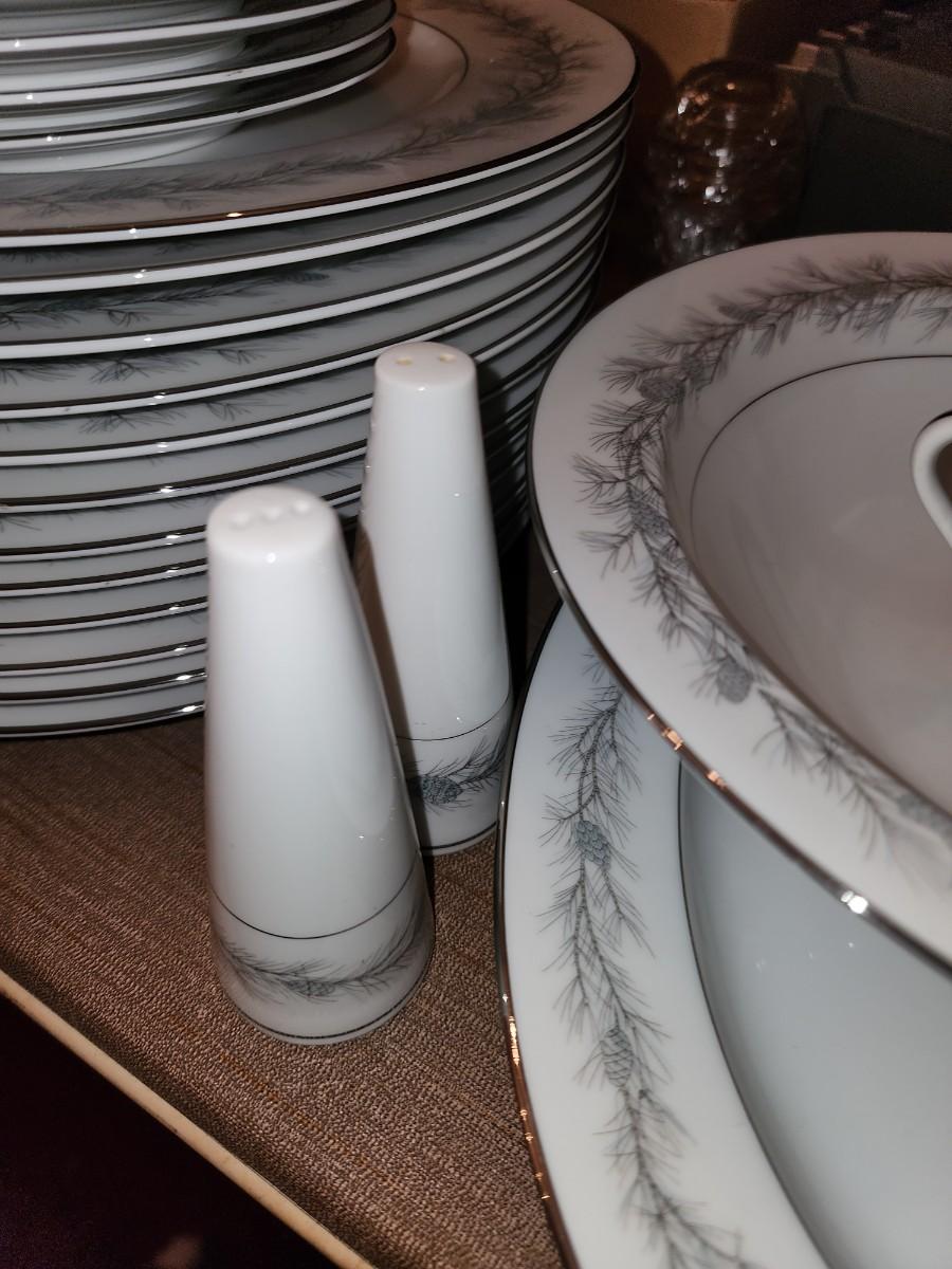 12 of each dinner plates, salad plates bowl, tea pot with cream and sugar. Salt and pepper set. Tea cups platter and serving bowl. Great set. Nice condition