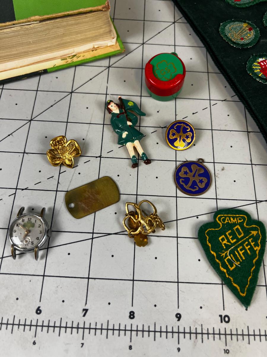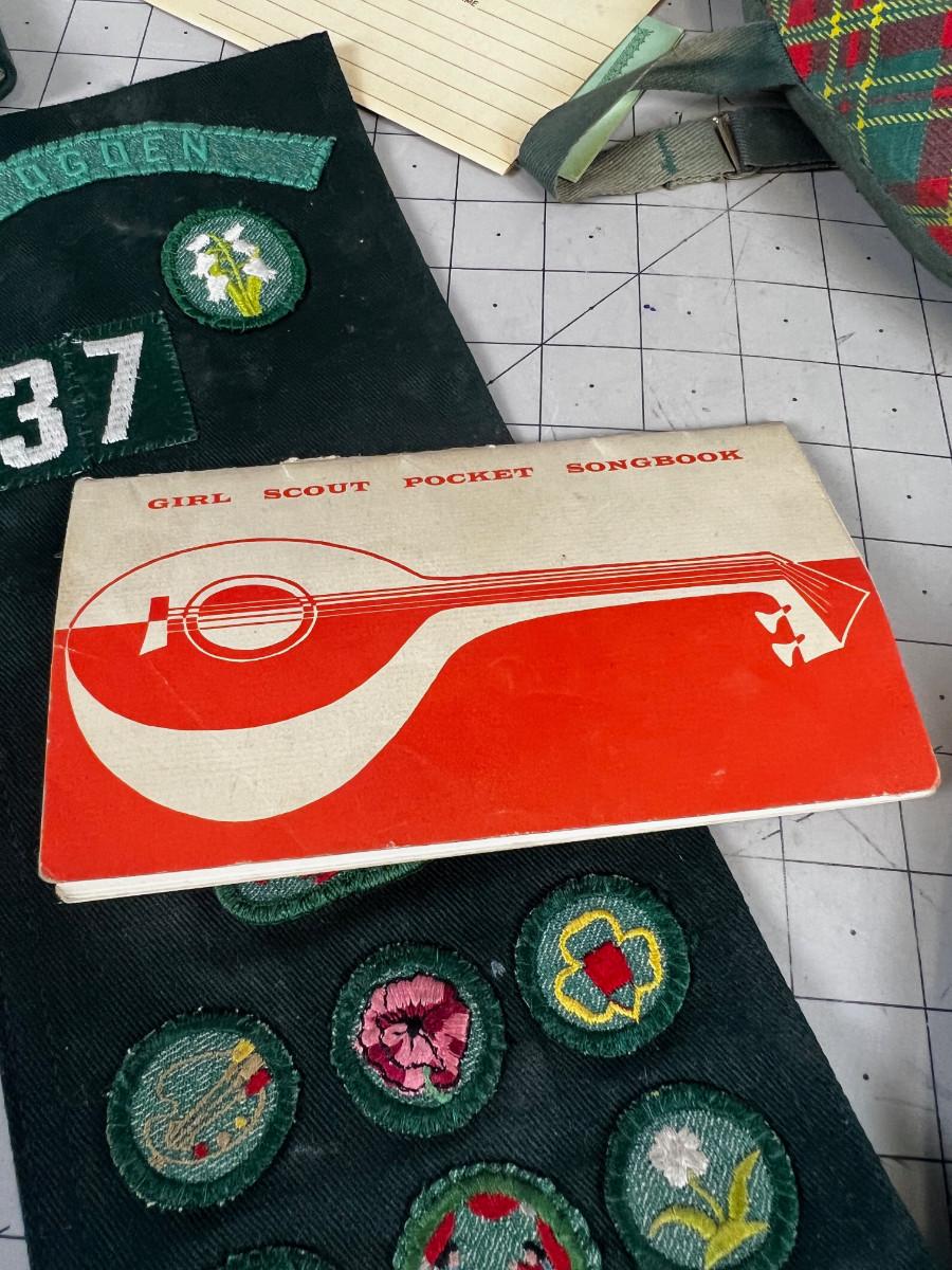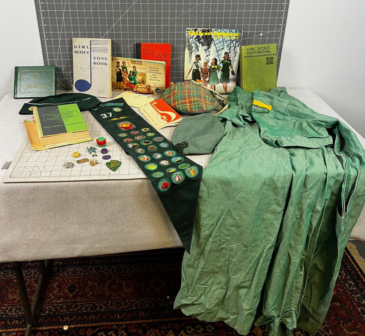 SUPER Girl Scout LOT: Den Mother Dress, Books; Hand & Song Books, Uniform Sash, Merit Badges, Pins, Girl Scout Watch too.