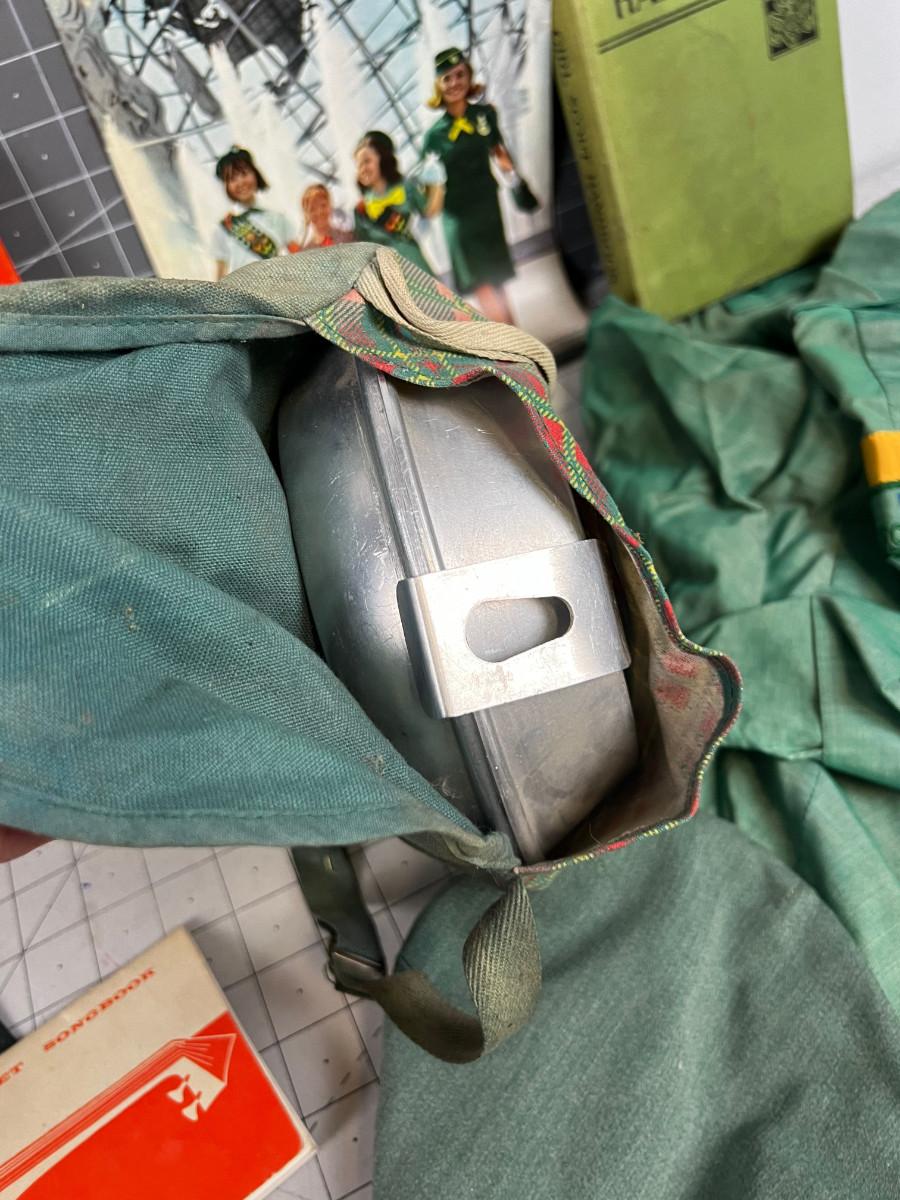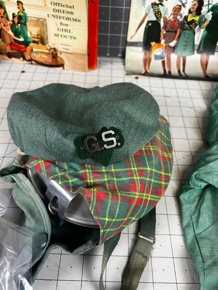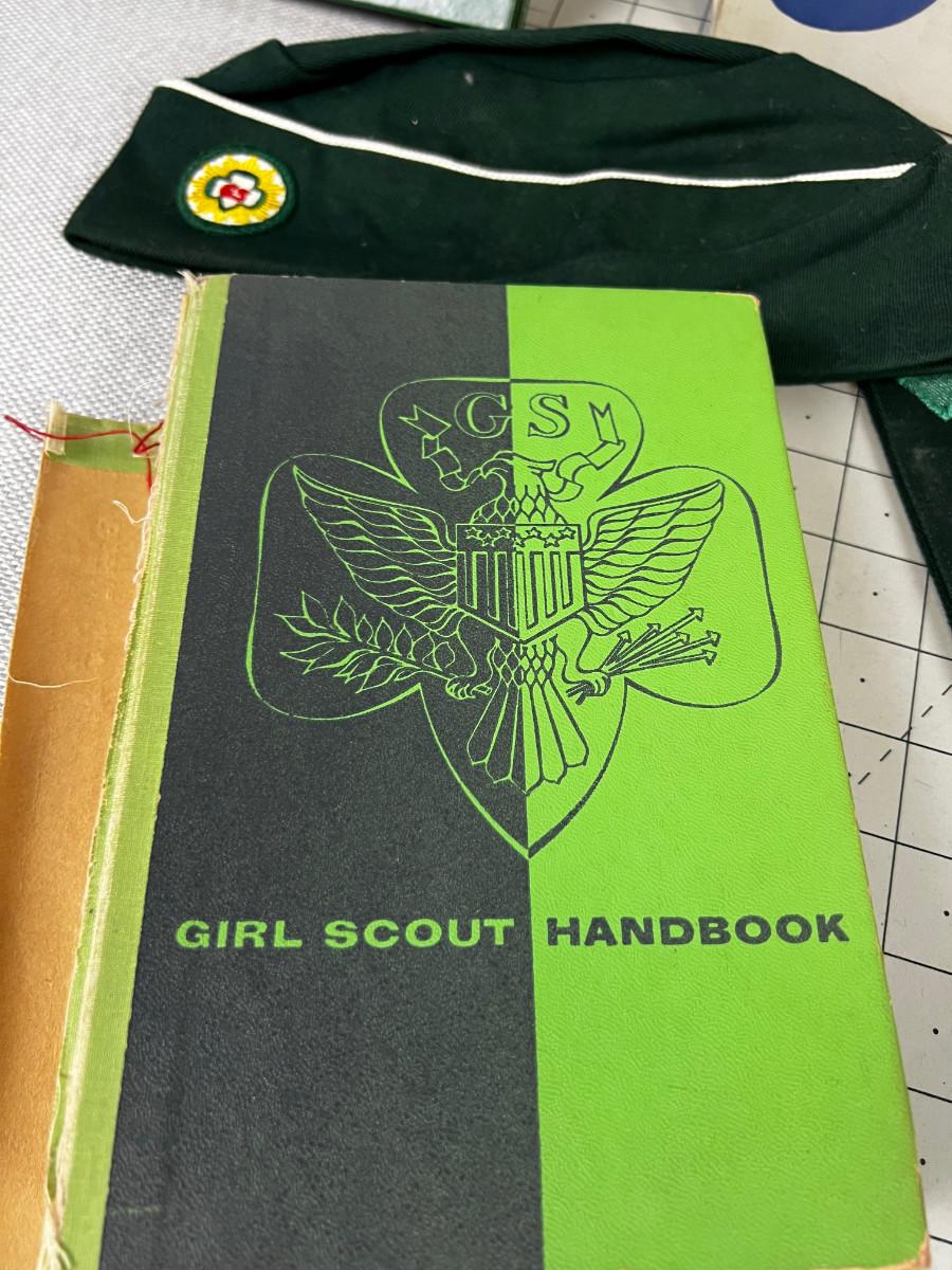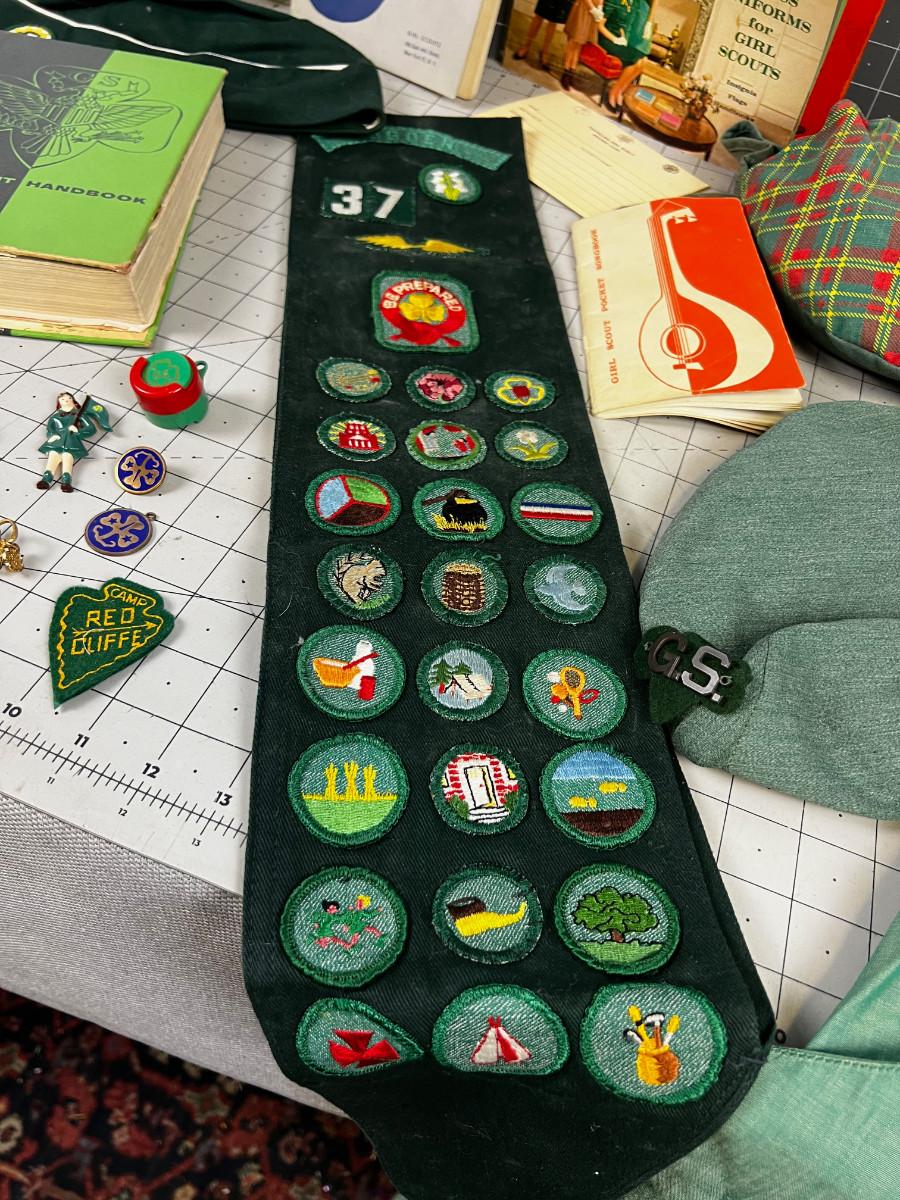SUPER Girl Scout LOT: Den Mother Dress, Books; Hand & Song Books, Uniform Sash, Merit Badges, Pins, Girl Scout Watch too.