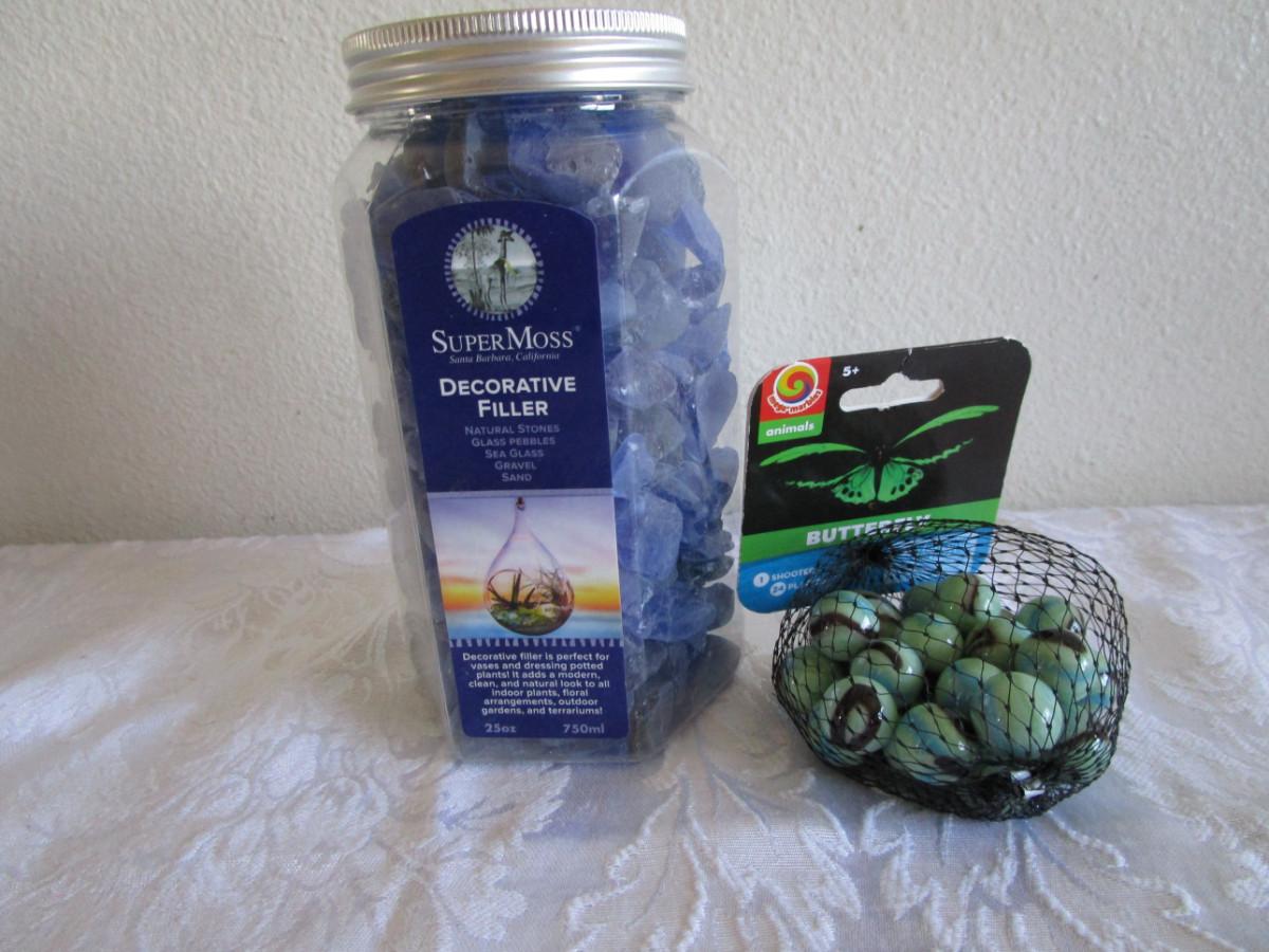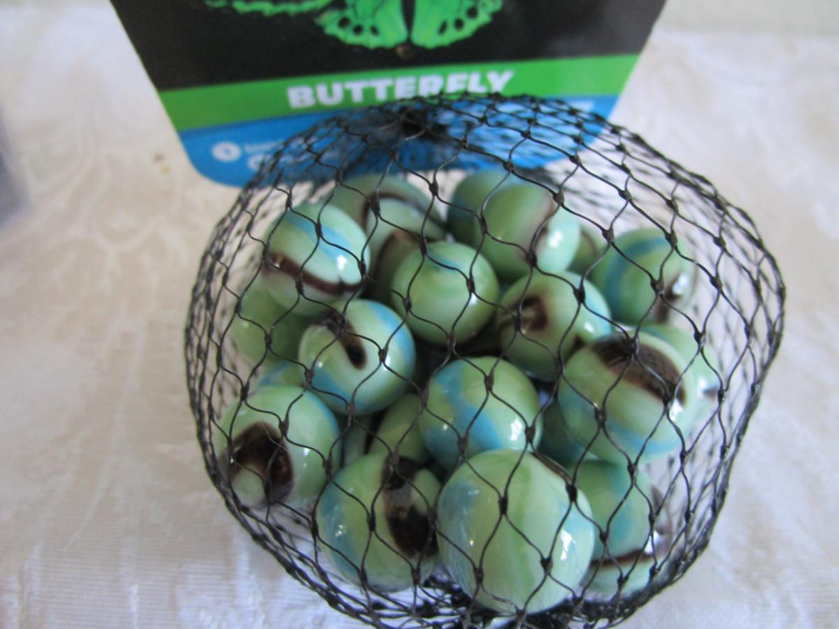 25 oz jar of purple stones and Mega marbles Butterfly marbles 1 shooter and 24 player marbles