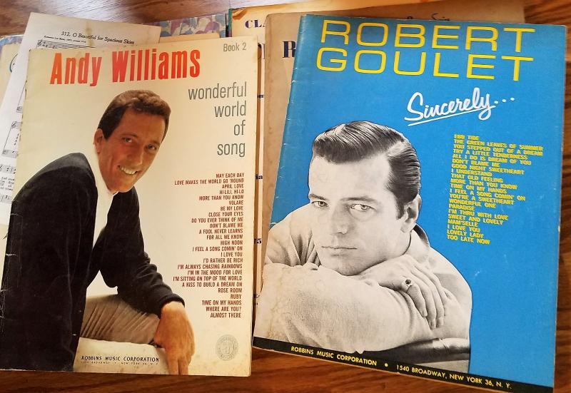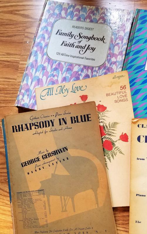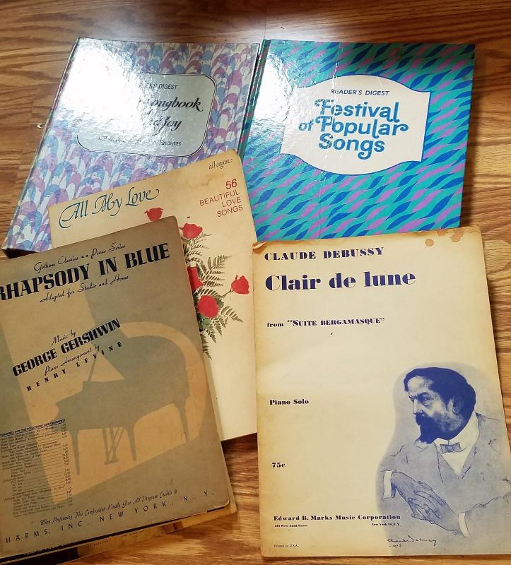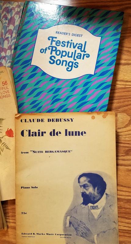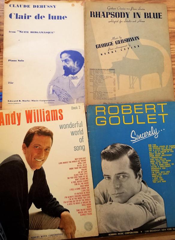 Piano music books, and sheet music mostly no longer in Print. Beautiful love songs, family song, faith etc. Enjoy Andy Williams, Robert Goulet, Rhapsody in Blue, Gershwin clair de lune and festival popular songs to sing play or just enjoy