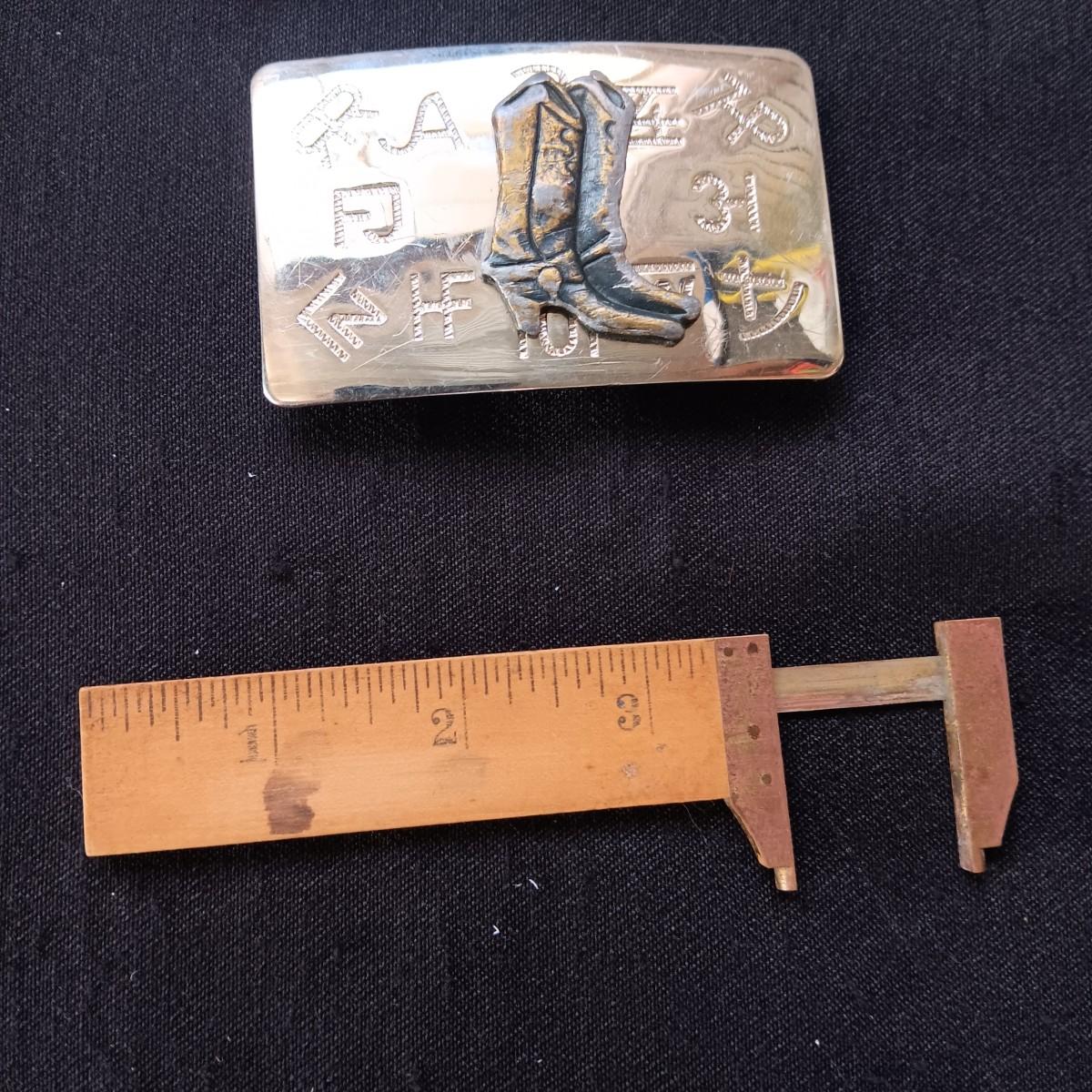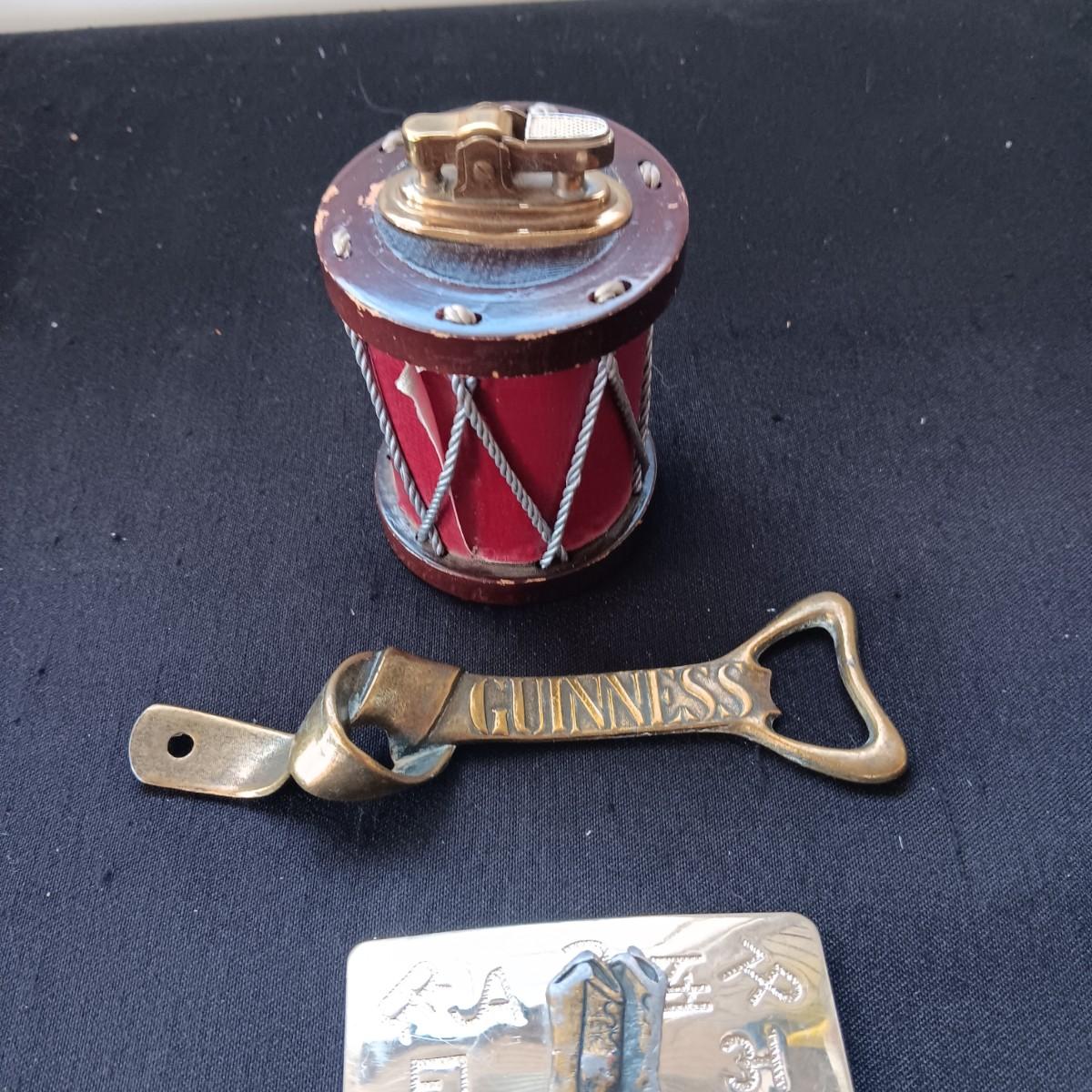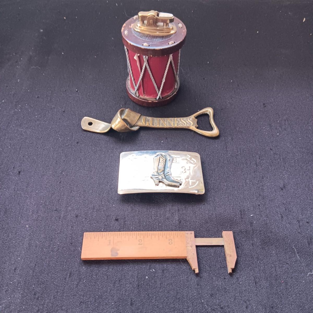 TABLE LIGHTER, BRASS BOTTLE OPENER, BELT BUCKLE AND SLIDING MEASURE