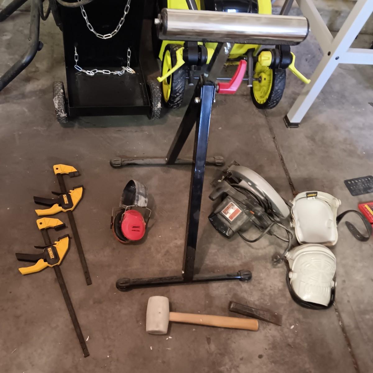 TABLE SAW ROLLER, CLAMPS, CIRCULAR SAW, KNEE PADS AND MORE