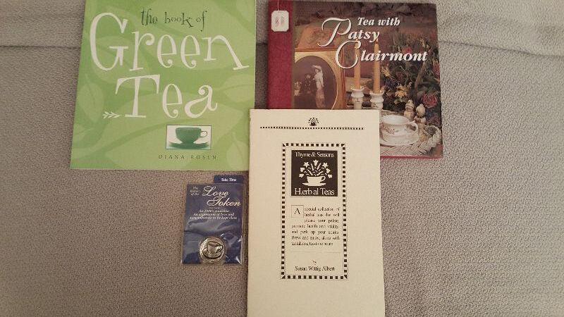 This auction lot is for a nice, clean copy of 3 out-of-print books all about tea. The Book of Green Tea by Diana Rosen is a fun softbound, 156 page volume about the wonders of green tea. Tea with Patsy Clairmont is a pretty, hardbound, 112 page book showcasing the author, Patsy Clairmont's love of the beverage and a copy of the phamplet Thyme & Seasons Herbal Teas by Susan Wittig Albert. Also included in this lot is a Love Token which appears to be form in pewter. See photos for back cover information. Donated by Kay Whitlock.