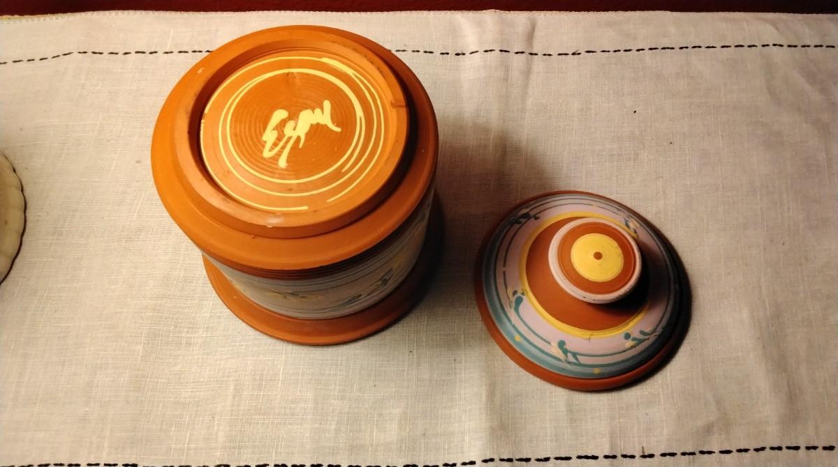 The pastel colors against the terra cotta is gorgeous! No cracks. chips, or repairs of any kind. Never used a beautiful piece! 4"× 5"